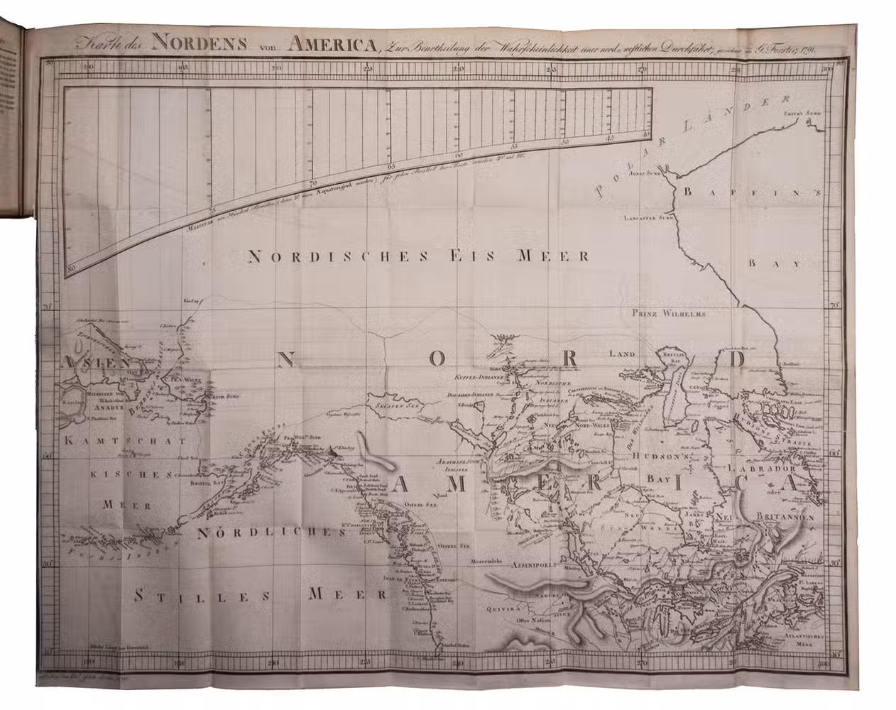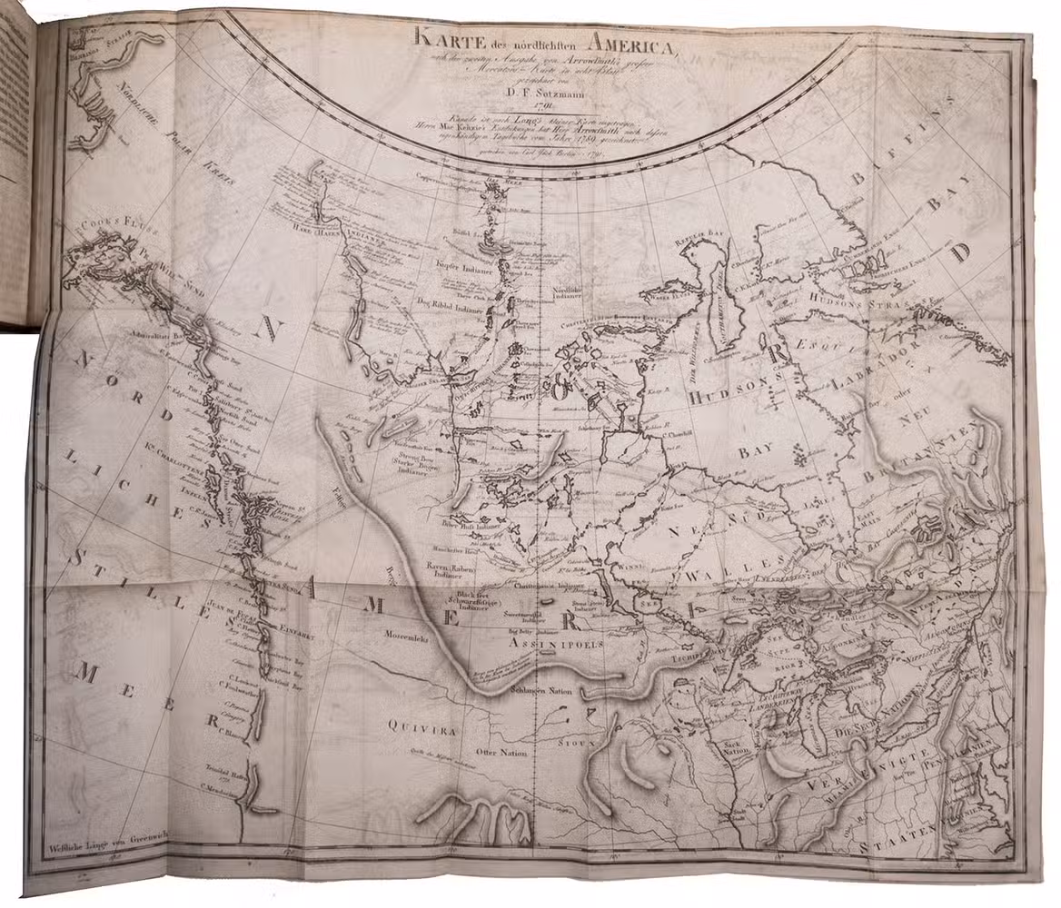 Forster began the work, but after his death in 1794 L.F. Huber continued it. They deal with a variety of subjects, including Cook, New Holland, Tahiti, the breadfruit tree (with two folding illustrations), fur trade along the northwest coast of America, a description of North America, natural history (among other things Forster's oration in Vilnius and the preface to his dissertation), pygmies, Madagascar, Mindanao, etc. On the folding map of North America in volume 2, Forster suggested a possible route for a northwest passage. The folding map in volume 3 is drawn by D.F. Sotzman after a map of North America by Arrowsmith. Volume 6 contains Forster's political and historical works.