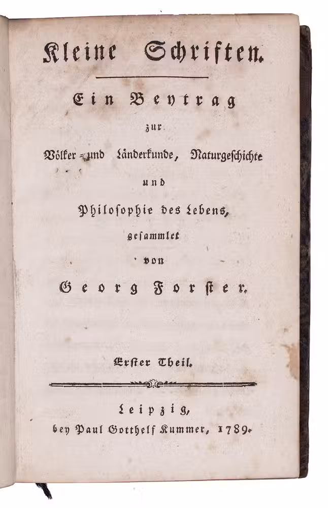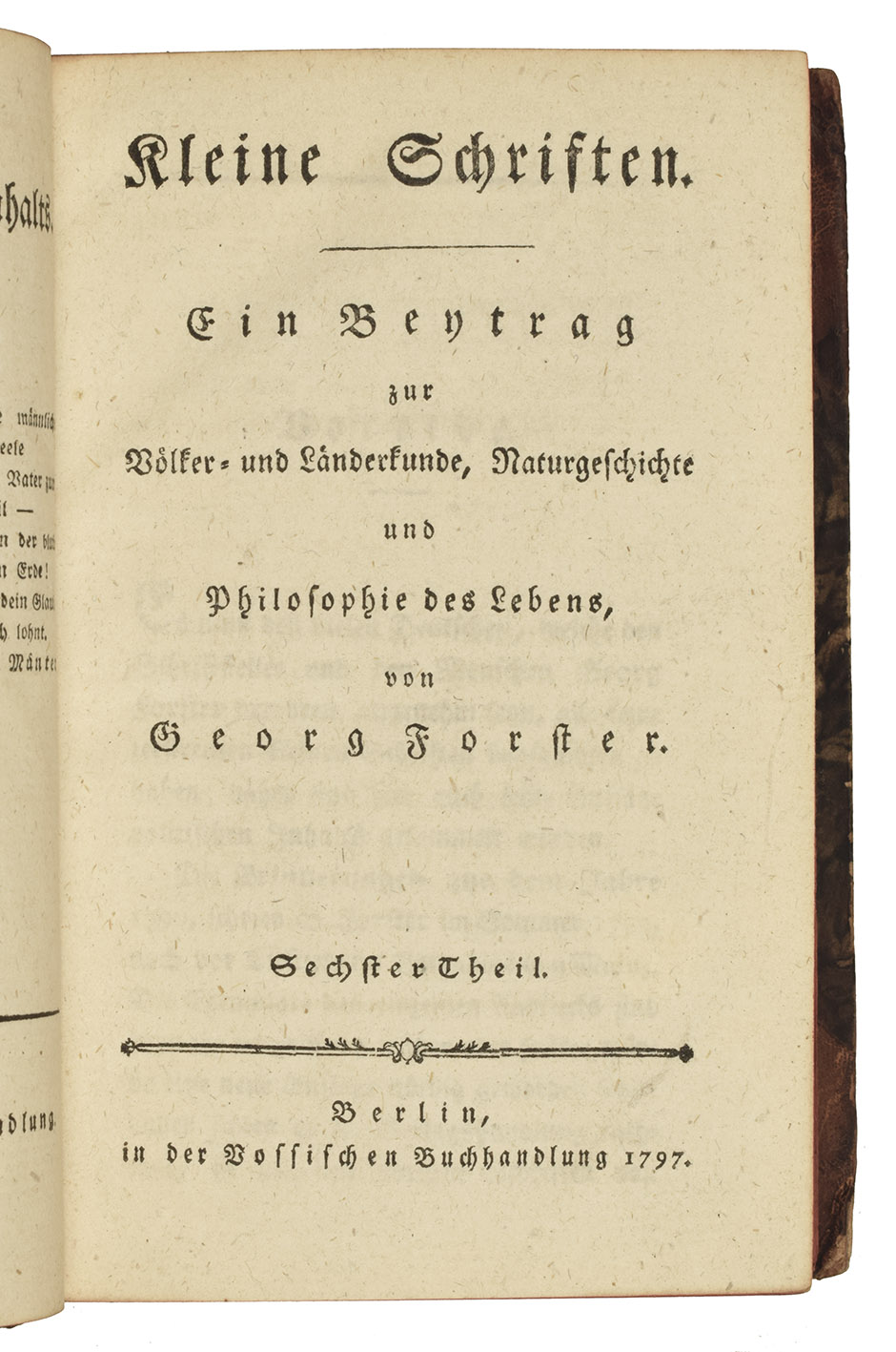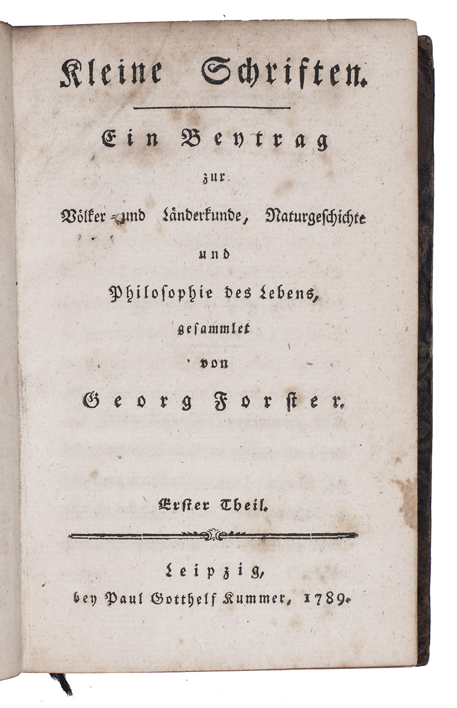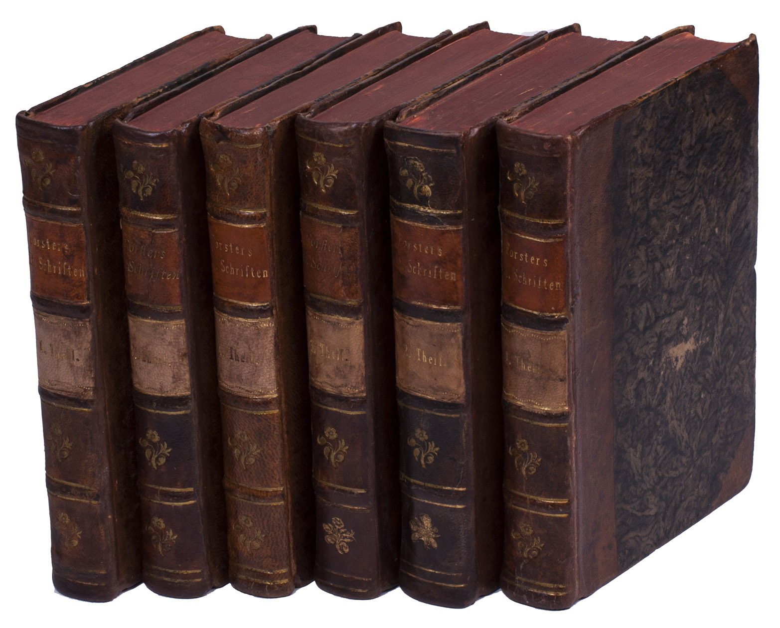 First edition of the collected miscellaneous writings of Georg Forster (1754-1794), parts previously published elsewhere, parts published here for the first time. Forster's fame was instantly established when he published an impressive account of James Cook's second voyage around the world in 1778-1780 and the first volume of the present set opens with a long essay entitled "Cook, der Entdecker" (Cook, the discoverer).