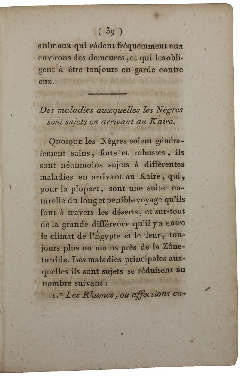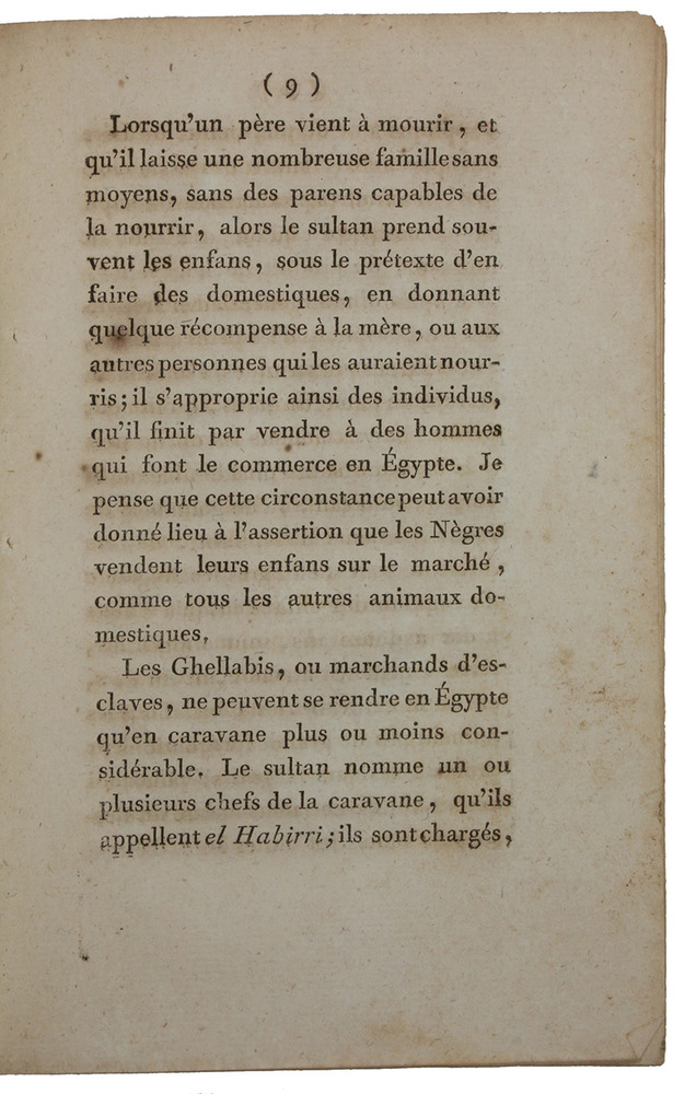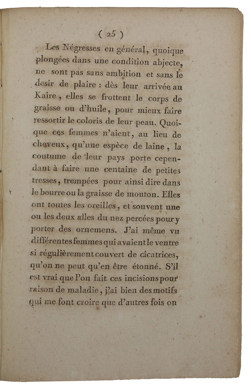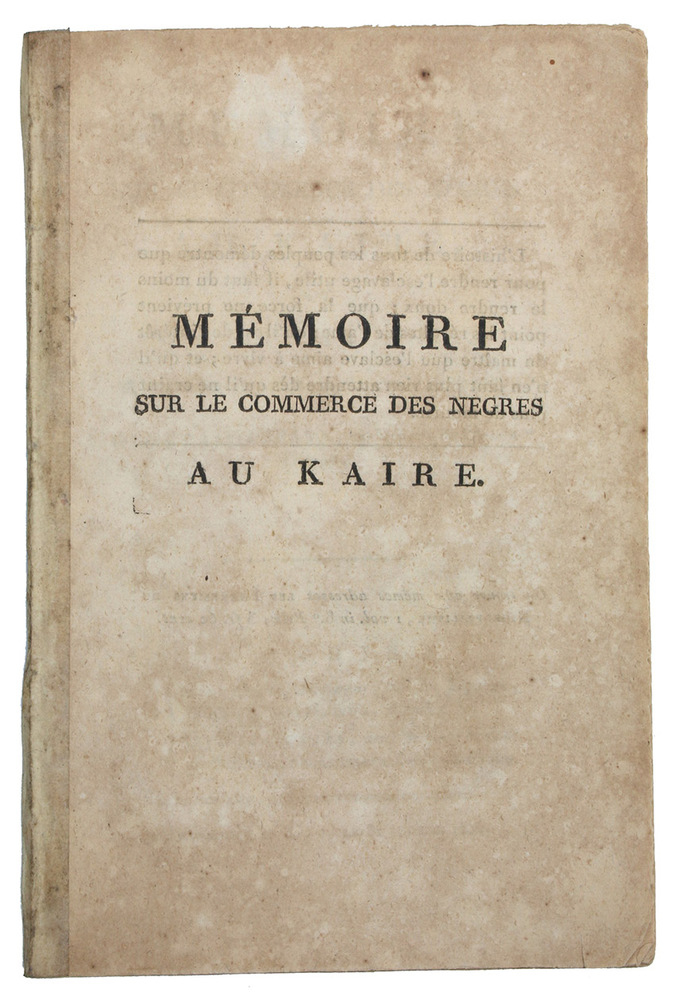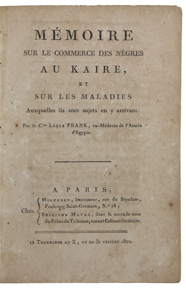 First edition. While in Egypt Bonaparte employed Frank as a physician to the occupying French army; during his five years there, he became involved in the Cairo sanitary commission and so was able to compile relevant information for this work. It commences with a discussion of the common ways people became enslaved: war, kidnapping, and trespass, where a perpetrator's child would be enslaved as punishment. He gives a vivid description of slave caravans and disproves many of the prejudices held by Europeans on the Cairo slave trade. The medical section describes seven common afflictions suffered: colds, eye problems, smallpox, skin diseases, diarrhea and dysentery, the plague, and Guinea worm. There is also a five-page section on female genital mutilation, as well as a list of prices for women, children and eunuchs. - "The value of Frank's brief treatise on the slave trade in Cairo lies in two aspects. The first is the purely descriptive account that he offers about the slave trade, the attitudes and prejudices of slave owners and dealers, and his review of the diseases and problems encountered by slaves as they moved from the limited biological environment of the Sudan to the more disease-prone Mediterranean world. On a second level, Dr. Frank's mémoire provides a glimpse into the attitudes of an early nineteenth-century European observer of slavery in the Islamic world" (Le Gall, 70).