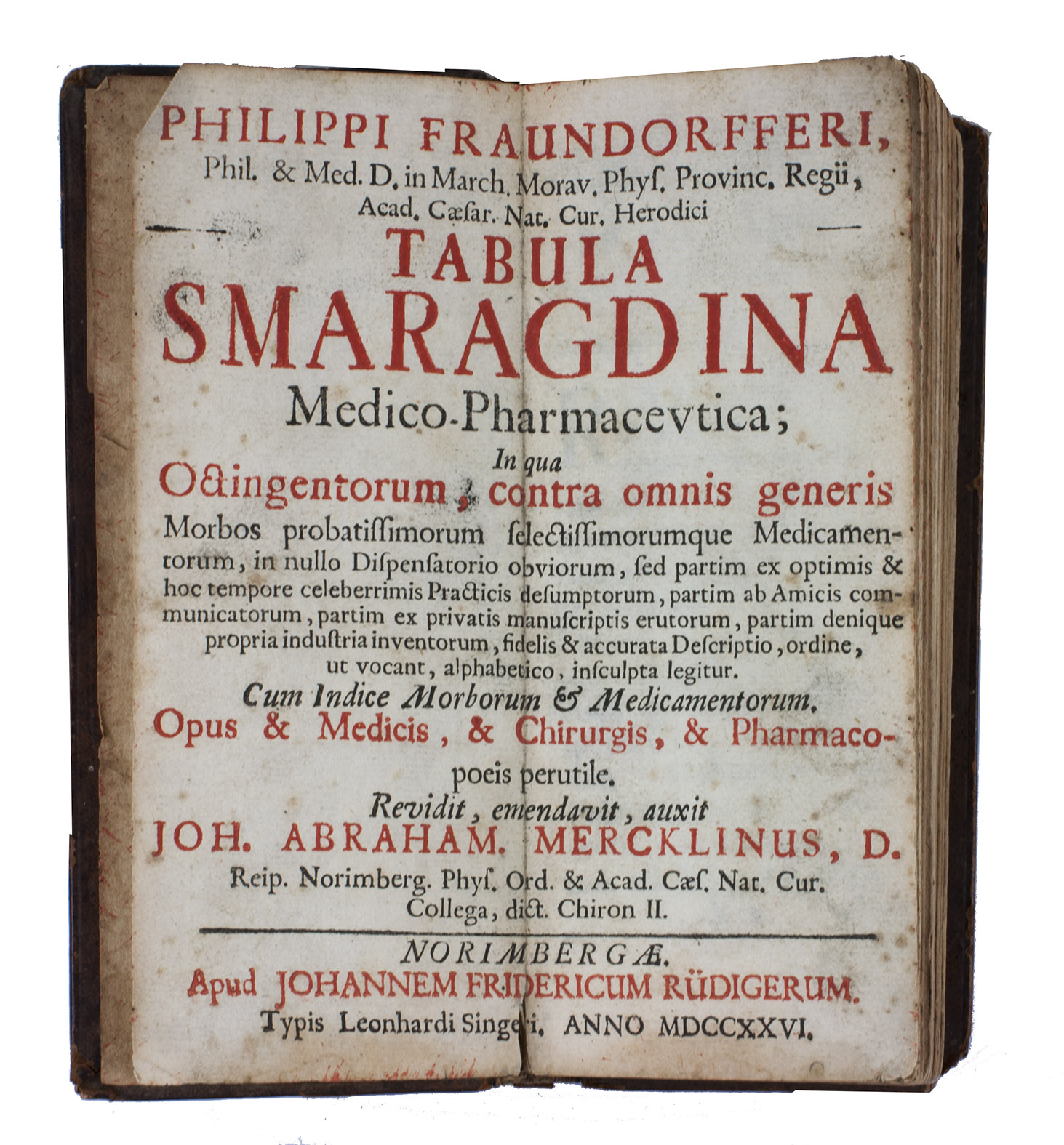 Reissue of the revised and enlarged third edition of Tabula smaragdina, compiled by the physician Phillip Fraundorffer (ca. 1650-1702). "The book is a collection of 800 recipes taken from no less than 224 various authors" (Hagelin). It contains two prefaces, one by Fraundorffer himself and one by the reviser Johann Abraham Mercklin (1674-1720), followed by a reference list of all physicians mentioned in the text, and an extensive index.
