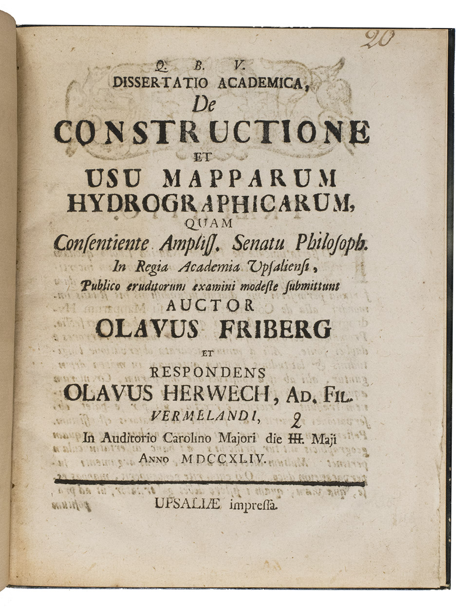 Q.B.V. Dissertatio academica, de constructione et usu mapparum hydrographicarum, quam consentiente ampliss. senatu philosoph. in regia academia Upsaliensi, publico eruditorum examini modeste submittunt auctor Olavus Friberg et respondens Olavus Herwech. ad. fil. Vermelandi, In auditorio Carolino Marjori die III. Maji Anno MDCCXLIV.