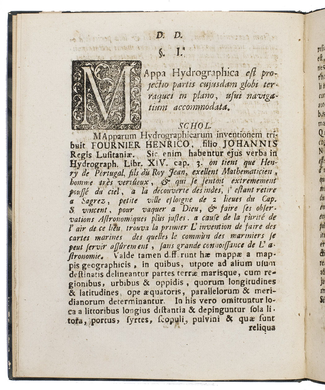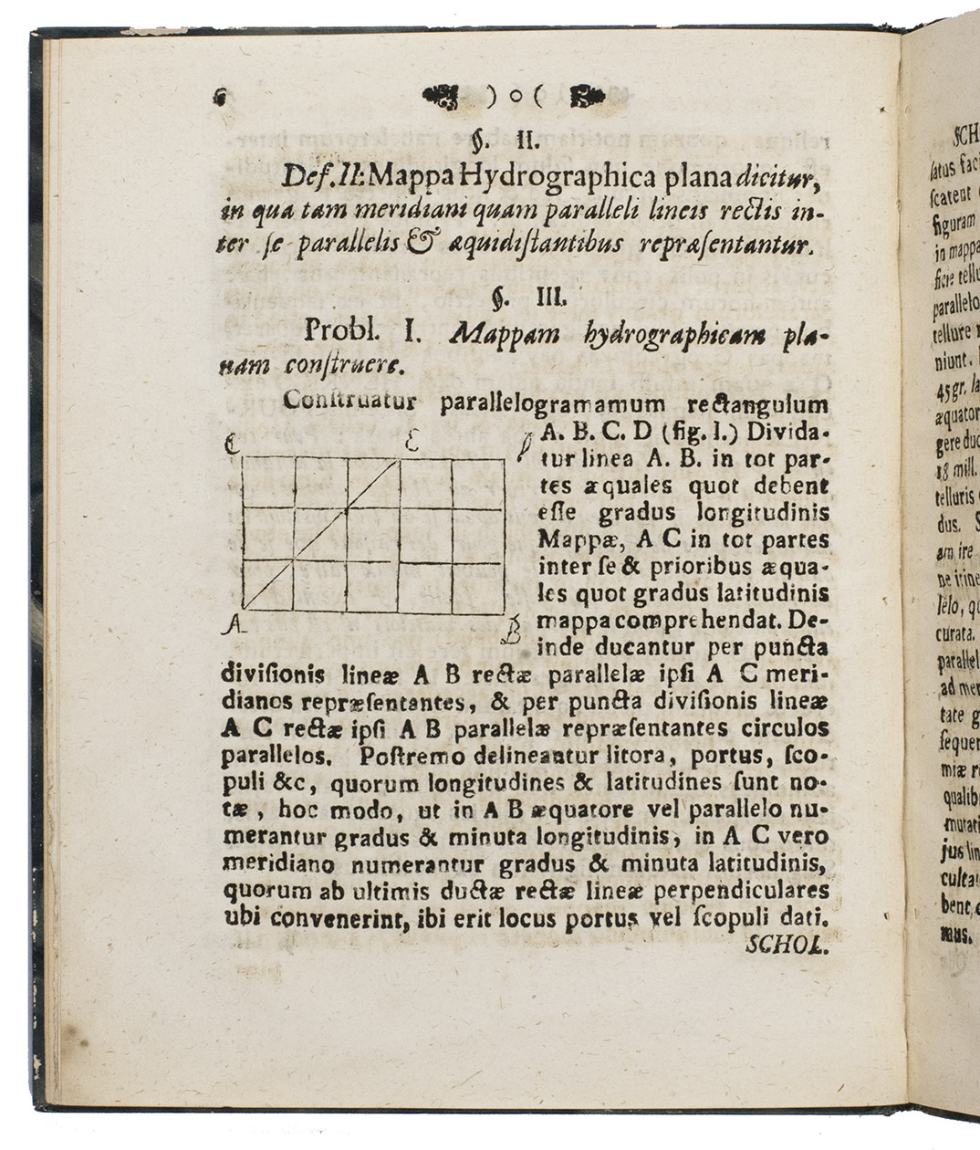 Hydrography pertains to the applied sciences that encompass the assessment and depiction of the natural characteristics of bodies of water, such as oceans, seas, rivers, lakes, and coastal regions. It also involves forecasting changes over time to guarantee safe navigation and support various marine-related activities, which include scientific research, environmental preservation, economic advancement, security, and defense. Offered here is a very rare Swedish eighteenth-century dissertation on the composition of hydrographic maps and their correct use. Its author, Olaf Friberg defines a hydrographic map as a projection of a part of a certain globe on a plane, adapted for the use of navigators. He explains that these type of maps are called reduced maps, in which the degrees of the parallels are smaller than the degrees of the meridian in a given ratio. Friberg was acutely aware of the problem of depicting the curved surfaces of the earth and its waters on flat maps. He exemplified his observations through four woodcut geometrical illustrations.