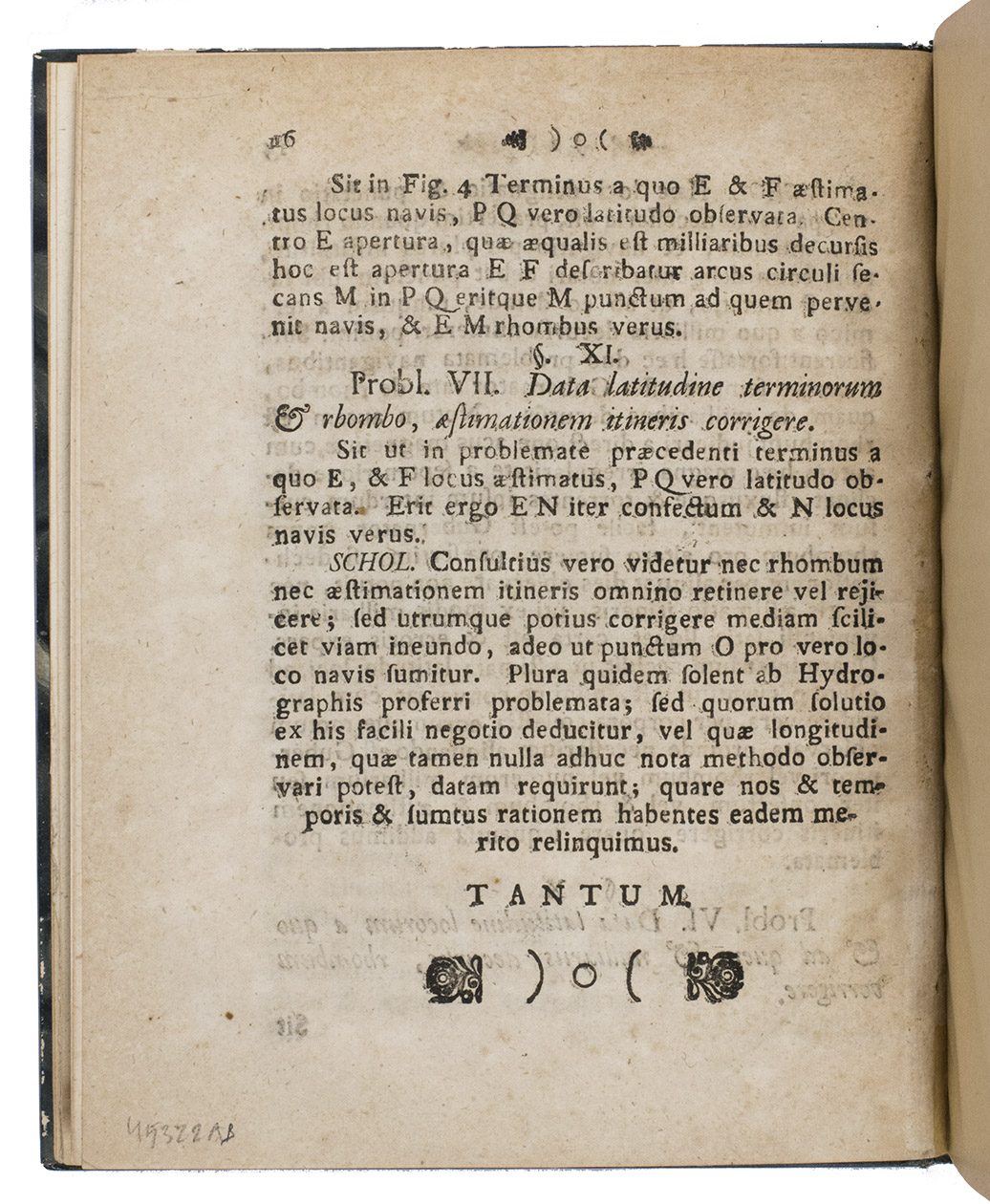 Uppsala, 1744. 4to. With 4 woodcut geometrical illustrations in the text, a large woodcut headpiece (with the words "constantia coronatur" in it) and one large woodcut decorated initial. Modern stiff (marbled?) paper boards with the title in gold on the spine. 16 pp.