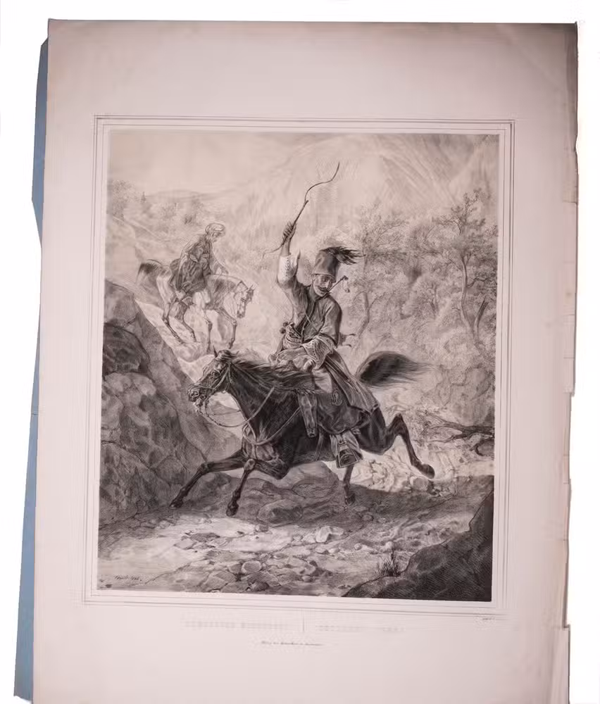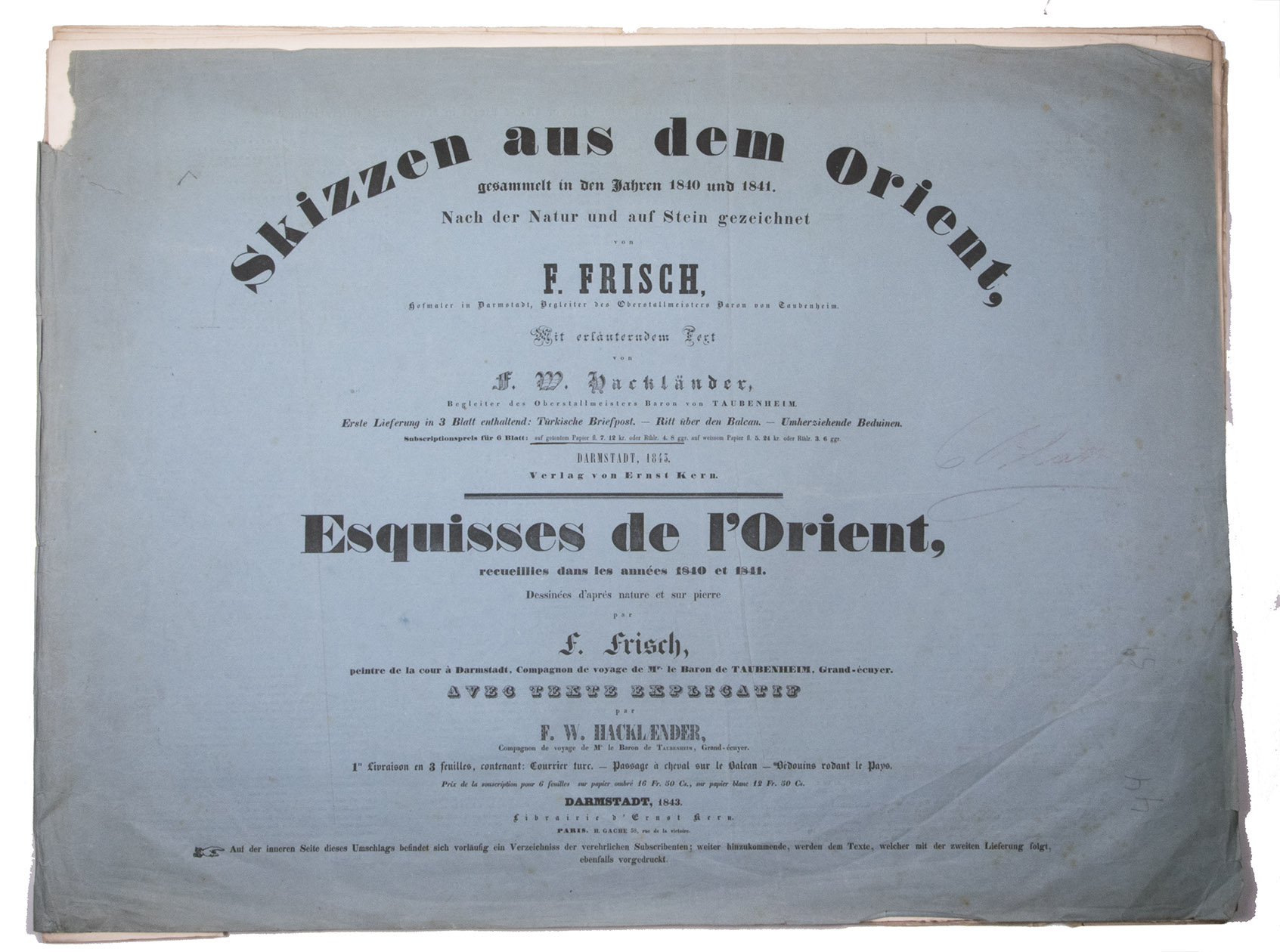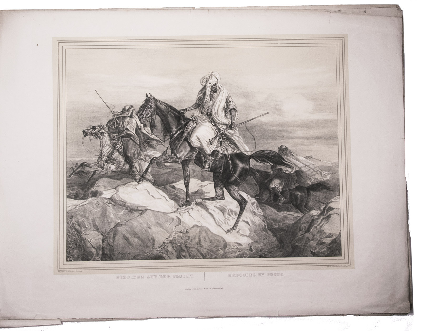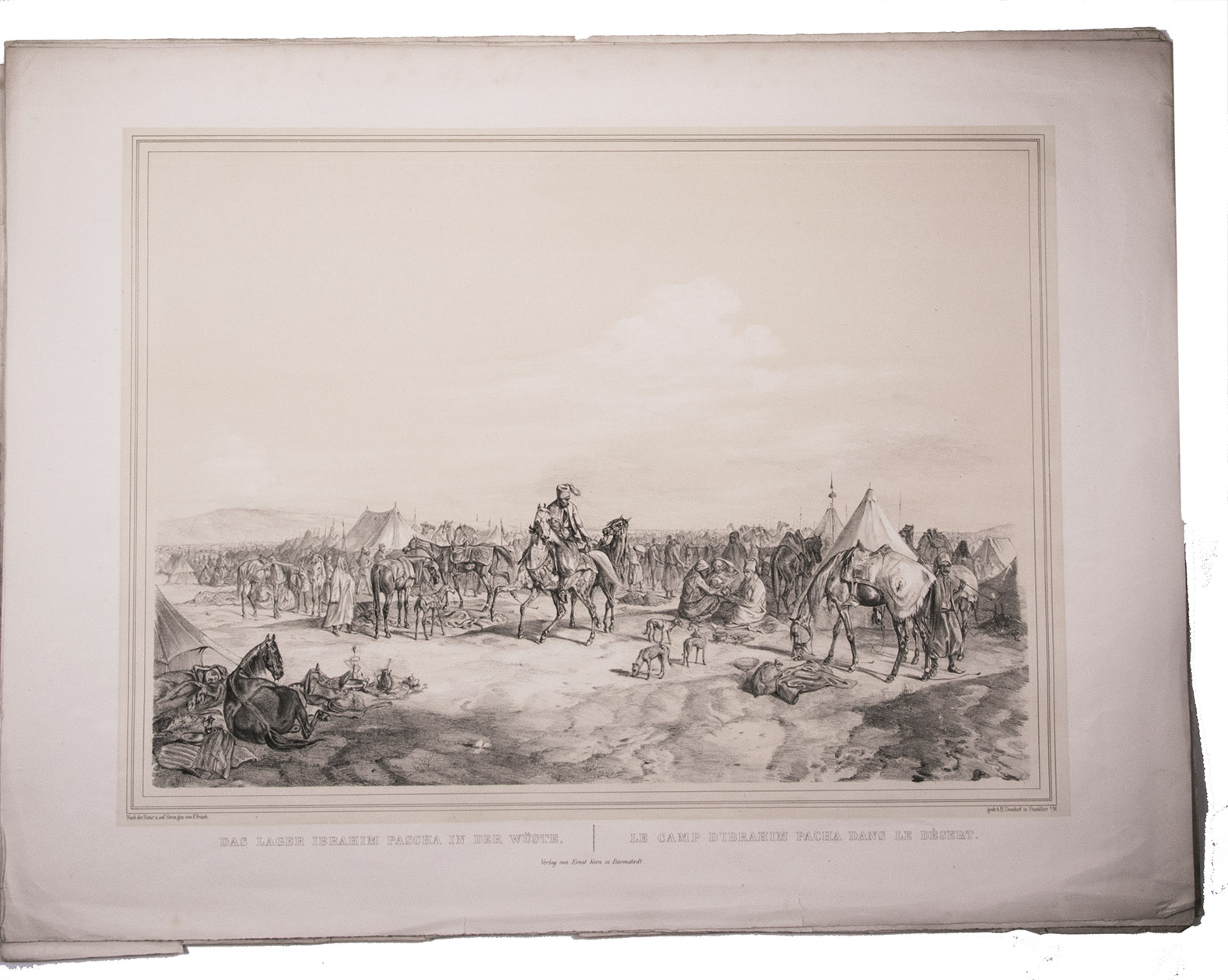 Extremely rare set of 6 beautifully lithographed plates showing scenes made on a journey to the Middle East to procure Arabian horses for the Royal Wuerttemberg stud farms Weil and Marbach, by Friedrich Frisch (1813-1886), court painter in Darmstadt. In 1840/41 he accompanied the Wuerttemberg chamberlain Wilhelm von Taubenheim (1805-1894), the writer Friedrich Wilhelm Hackländer (1816-1877) and the doctor Karl Bopp (1817-1847) on this journey, stopping first at Constantinople, where Sultan Abdülmecid I welcomed them. They continued to Beirut, Damascus and Jerusalem, and in Jaffa they met the Ottoman general Ibrahim Pasha.