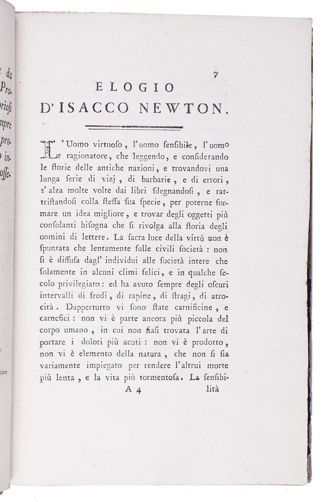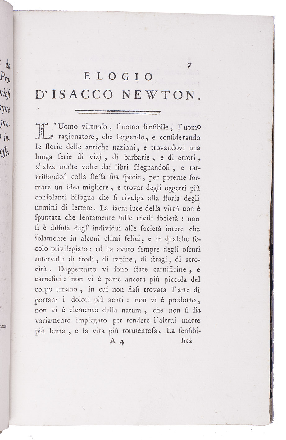 Paolo Frisi (1727-1784), was himself a celebrated scientist, professor at Padua, later at Milan, who had travelled in France, England and the Netherlands, making friends with the famous scientists of these countries. He published a large number of scientific works, earning for himself an award and the membership of the Academy of Science at Paris. His eulogies remain of interest as they show the changing opinion of the scientists and are still cited today.