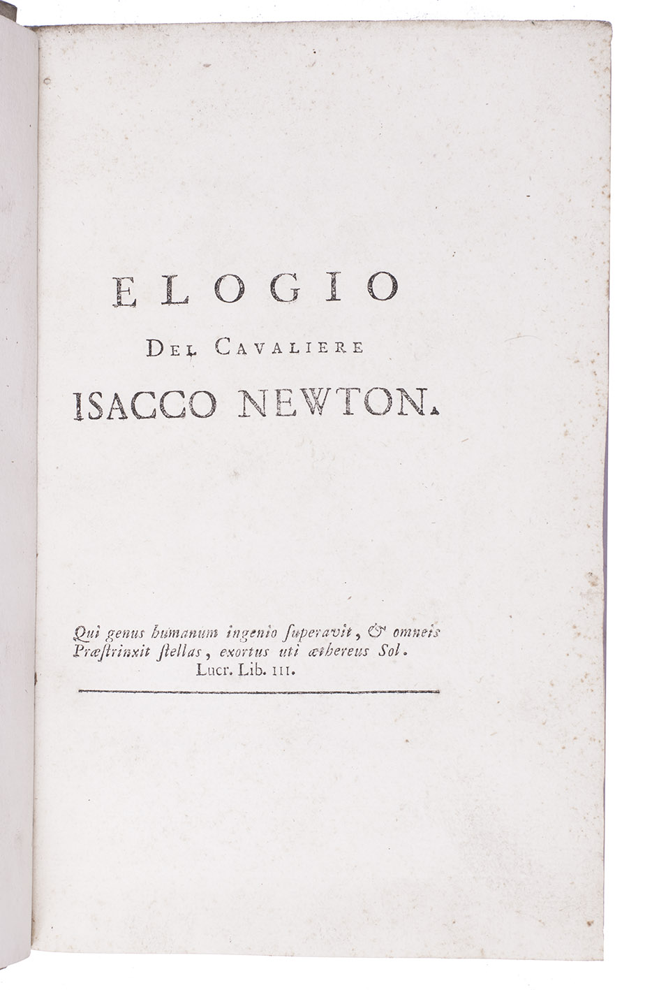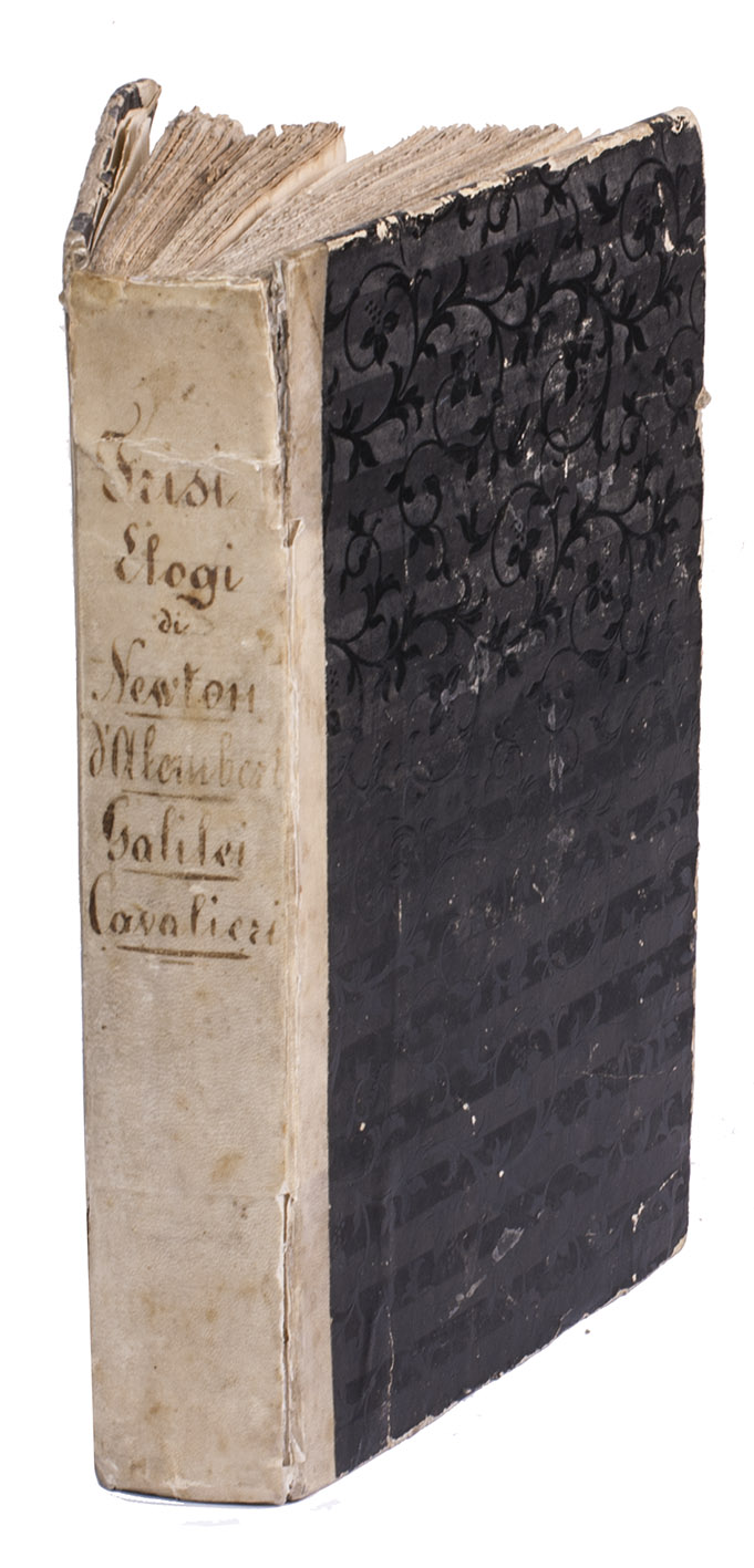 Four eulogies, written in Italian by the astronomer and mathematician Paolo Frisi (1728-1784), paying respects to Isaac Newton (1643-1727), Jean le Rond d'Alembert (1717-1783), Galileo Galilei (1564-1642) and Bonaventura Cavalieri (1598-1647). The latter two, written more than 100 year after their death, are published together in one work.