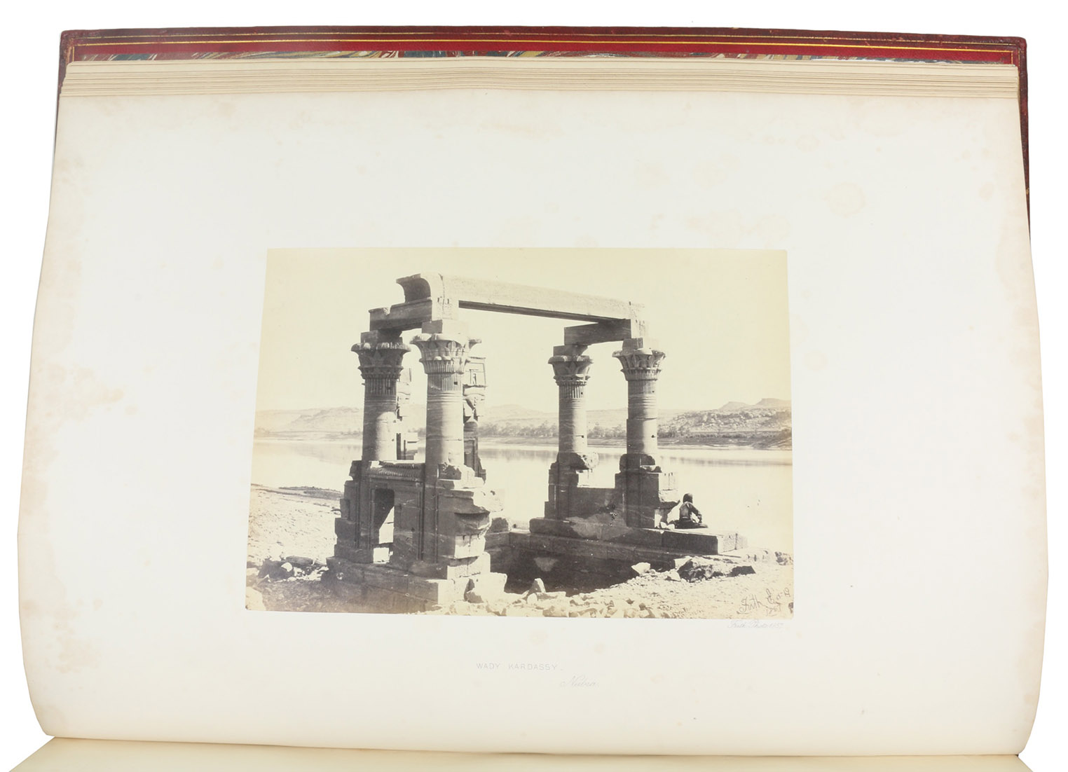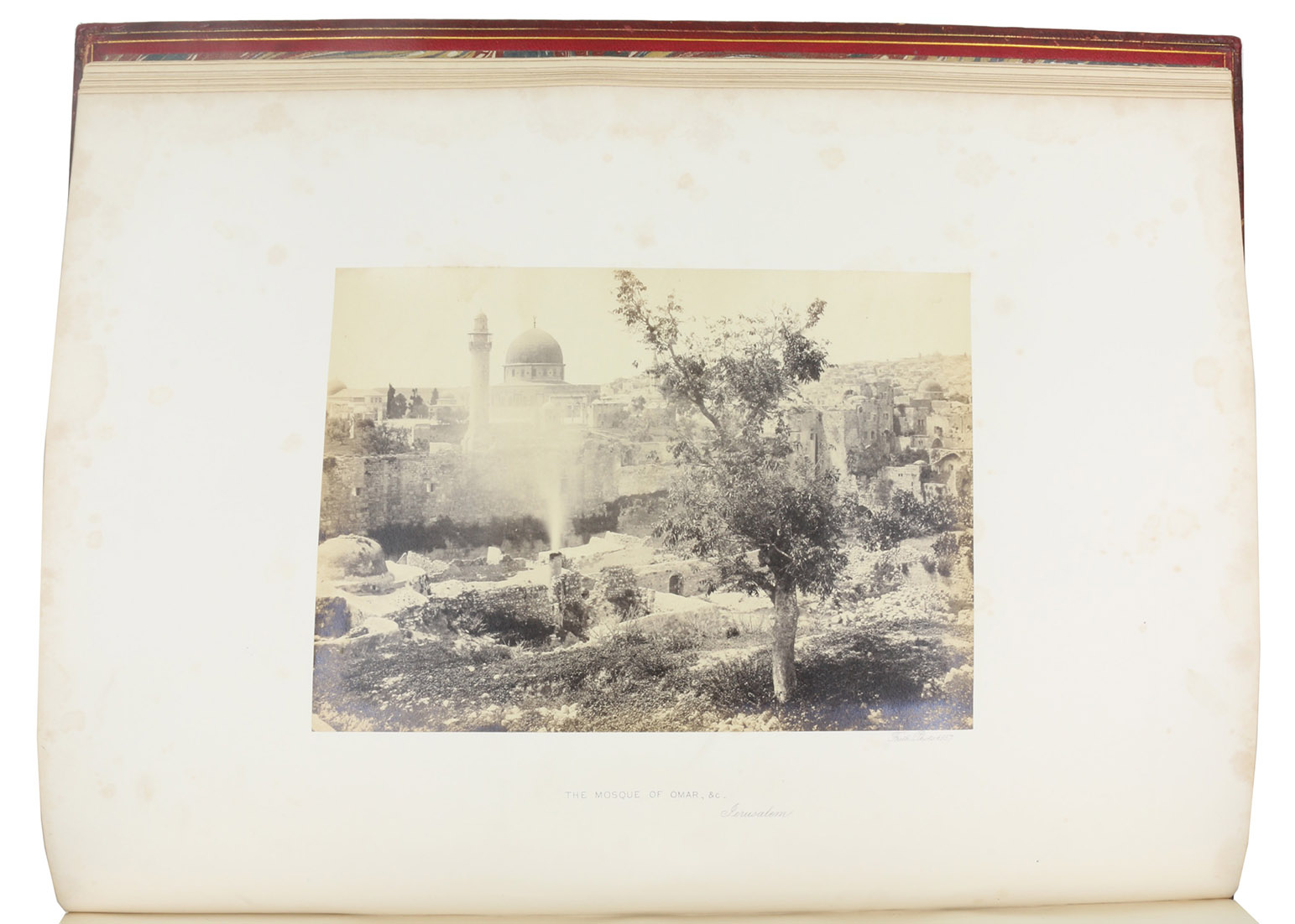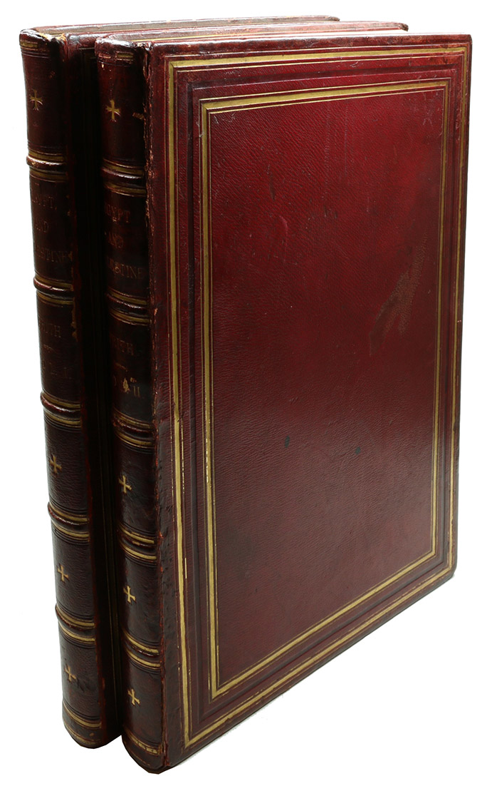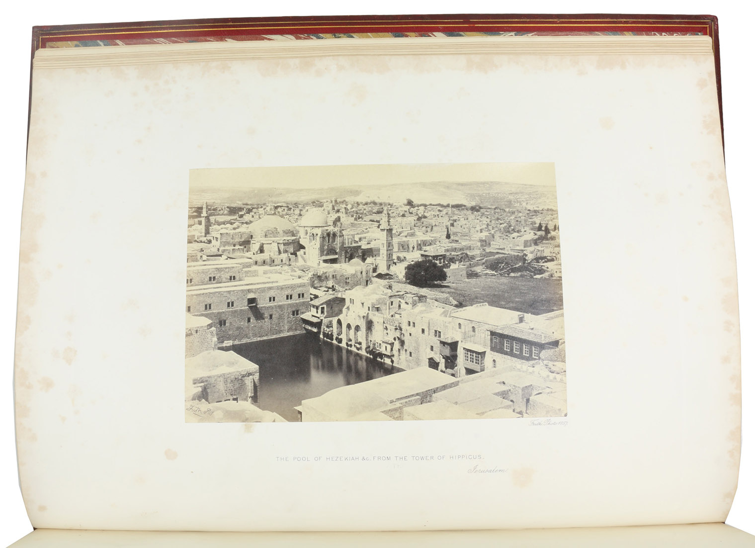 London, James S. Virtue, [1858-1859]. 2 volumes. Folio (44.5 x 32.5 cm). With 76 photographs on plates by Francis Frith (ca. 14.5-16.5 x 21.5-23 cm), each with a separate leaf of text. Contemporary red morocco, gold-tooled spines and boards, marbled endpapers, gilt edges.