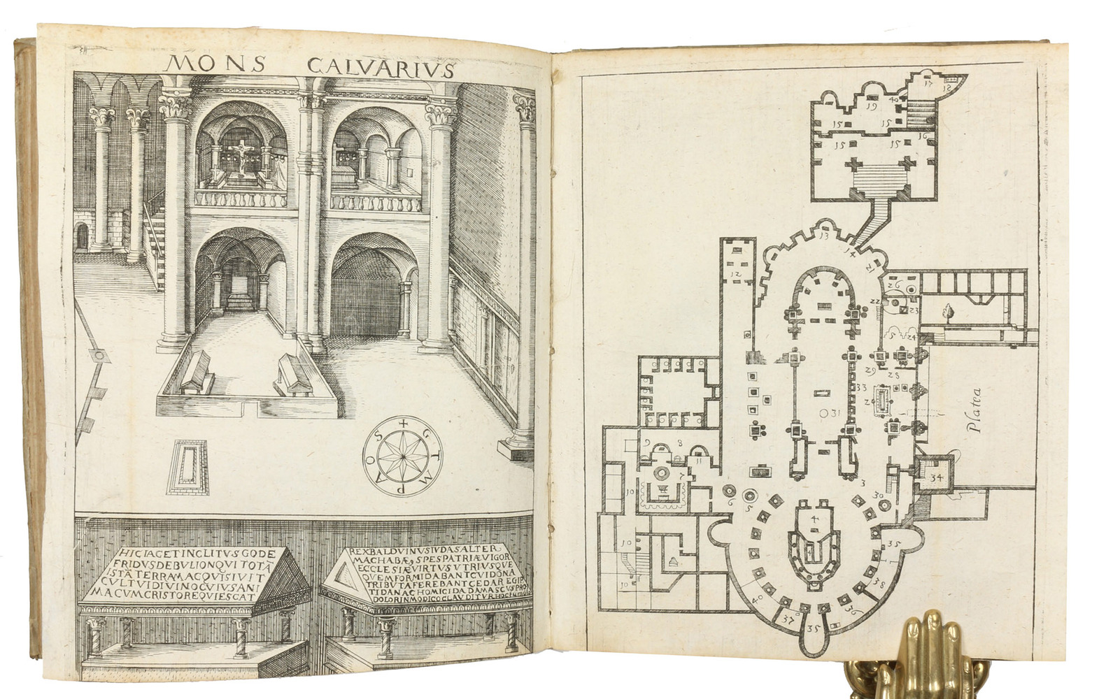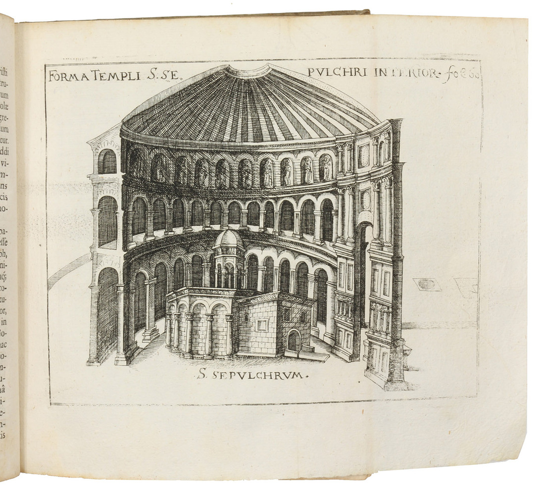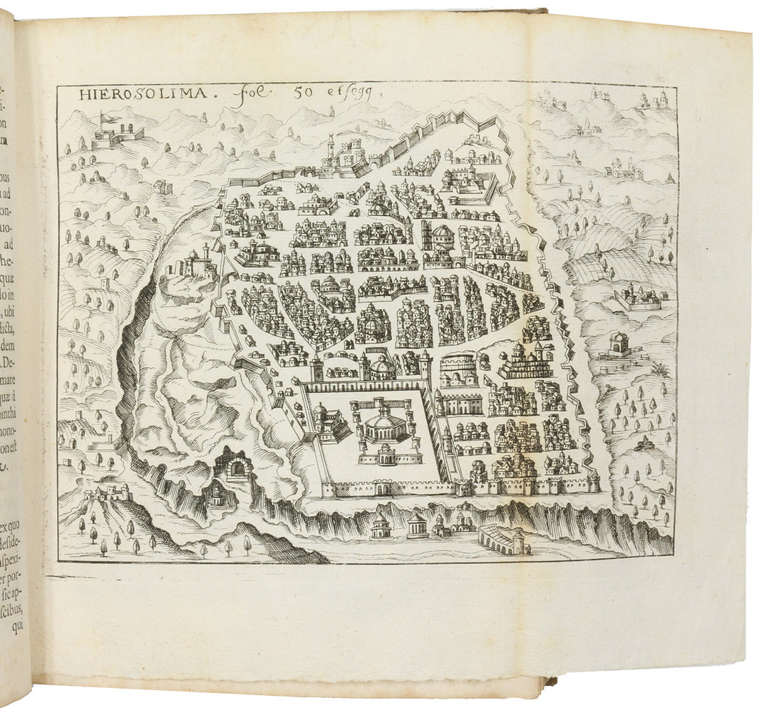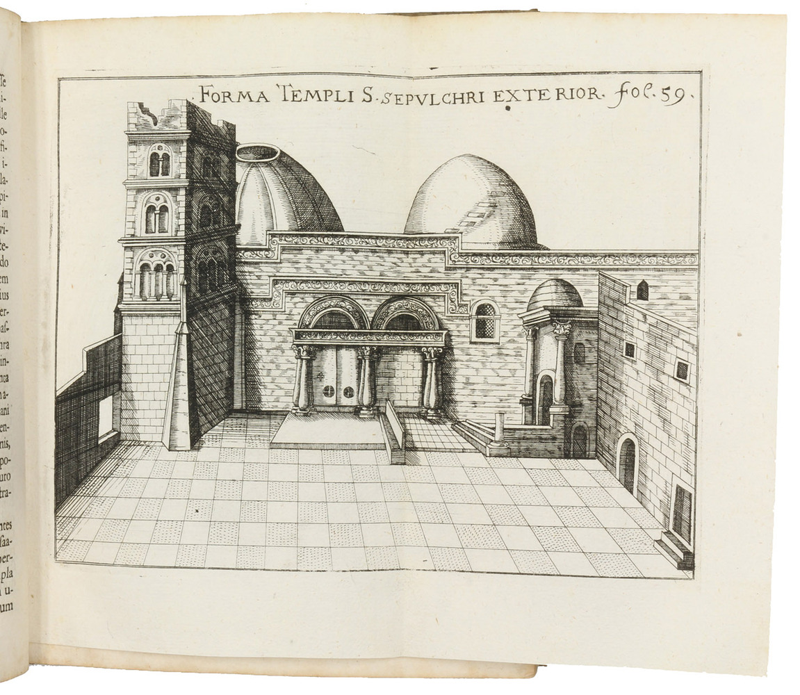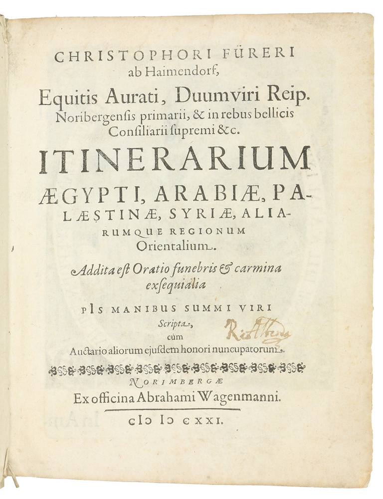 Posthumously published first edition, second issue, of an account of a 1565/66 pilgrimage to the Middle East, primarily Egypt and Palestine, by the Nuremberg Ratsherr Christoph Fürer von Haimendorf (1541-1610). Fürer visited Alexandria, Cairo, the Sinai, Rosette, Gaza, Jerusalem and other sites. The 6 illustration plates show Mounts Sinai and Catharine, a plan of Jerusalem in bird's-eye view, the Church of the Holy Sepulcher in Jerusalem (exterior, 2 interiors and a floor plan). "Fürer ... travelled extensively from 1563-66, first in Italy and then to the Ionian Islands, Egypt and Palestine. The works is concerned with the latter, though Fürer does provide some information on Corfu, Zakynthos, Crete and Cyprus. He is the first to give a description of Vesalius's tomb on Zakynthos" (Blackmer).