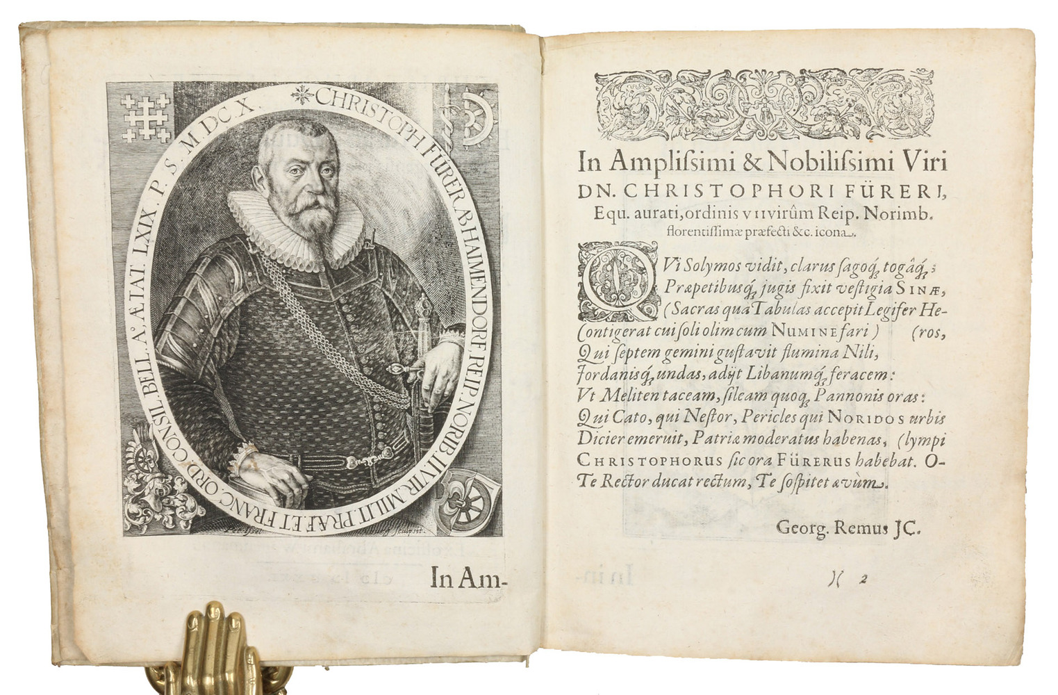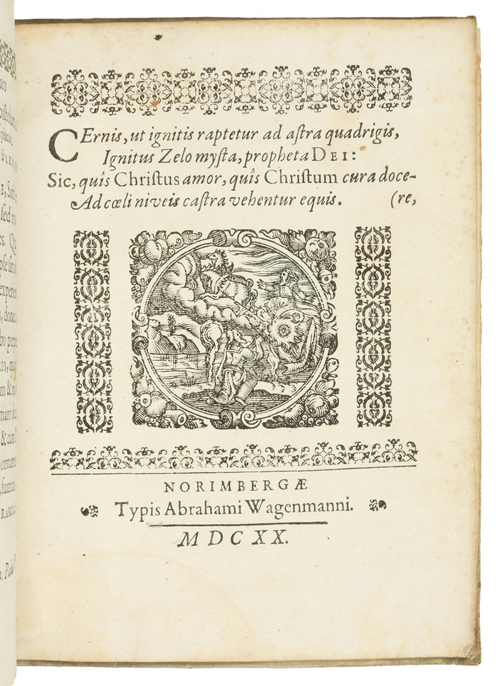 Nuremberg, Abraham Wagenmann, 1621 (colophon: Nuremberg, printed by Abraham Wagenmann, 1620). Small 4to. With finely engraved full-page portrait of the author by Peter Isselberg, full-page engraved Fürer von Haimendorf coat of arms, 6 folding engraved plates. Contemporary limp sheepskin parchment. [16], 118, [114] pp.