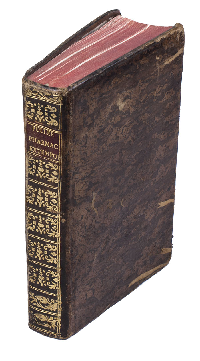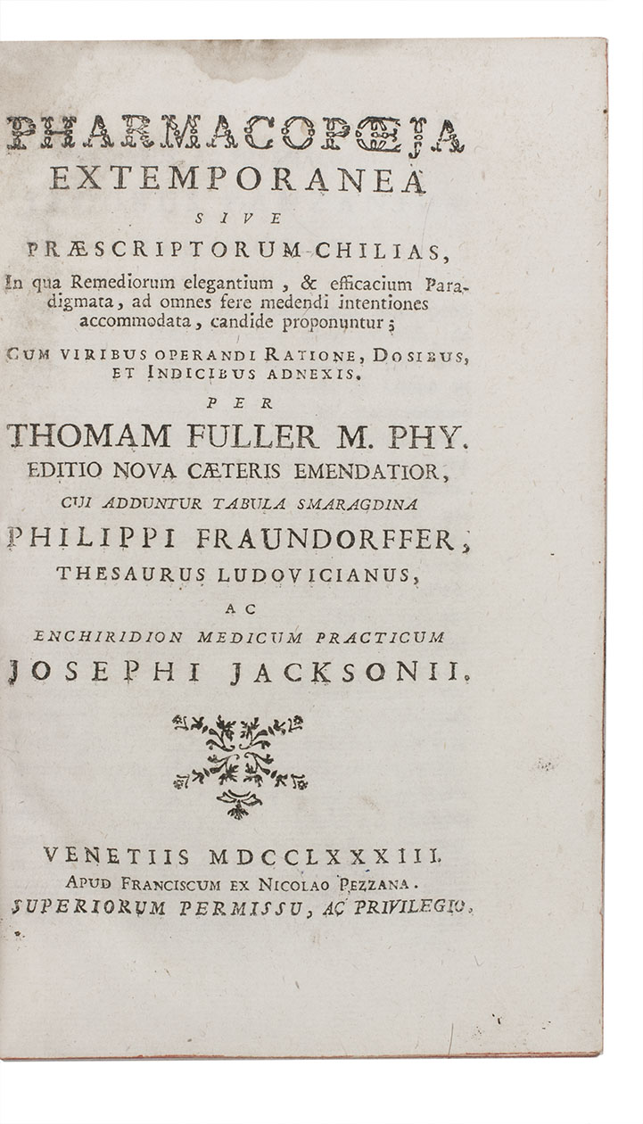 Very rare fourth(?) Venice edition of Fuller's popular pharmacopeia, first published in 1701. All Venice editions include three additional pharmaceutical works: a collection of recipes by Philipp Fraundorffer first published in 1699, Wolfgang Christian's "thesaurus" of the work of Daniel Ludwig first published in 1707 and Joseph Jackson's medical compendium first published in 1698.