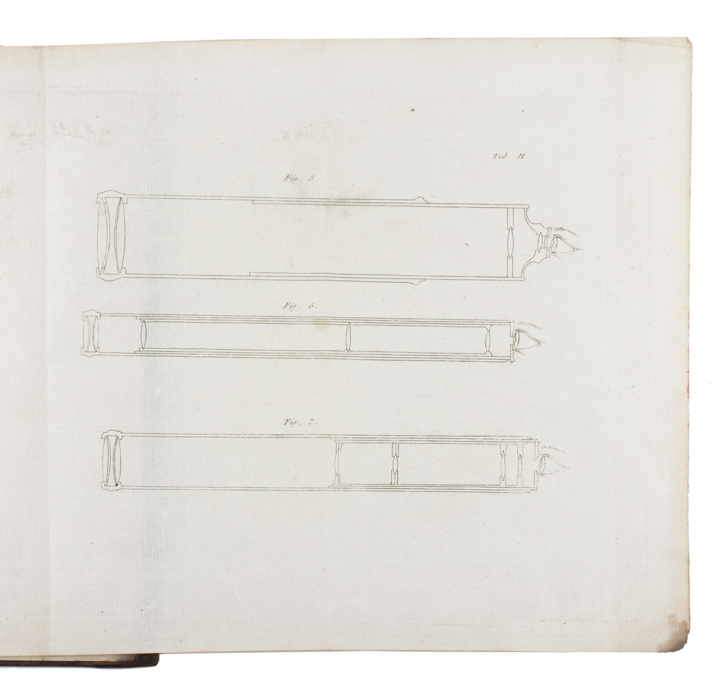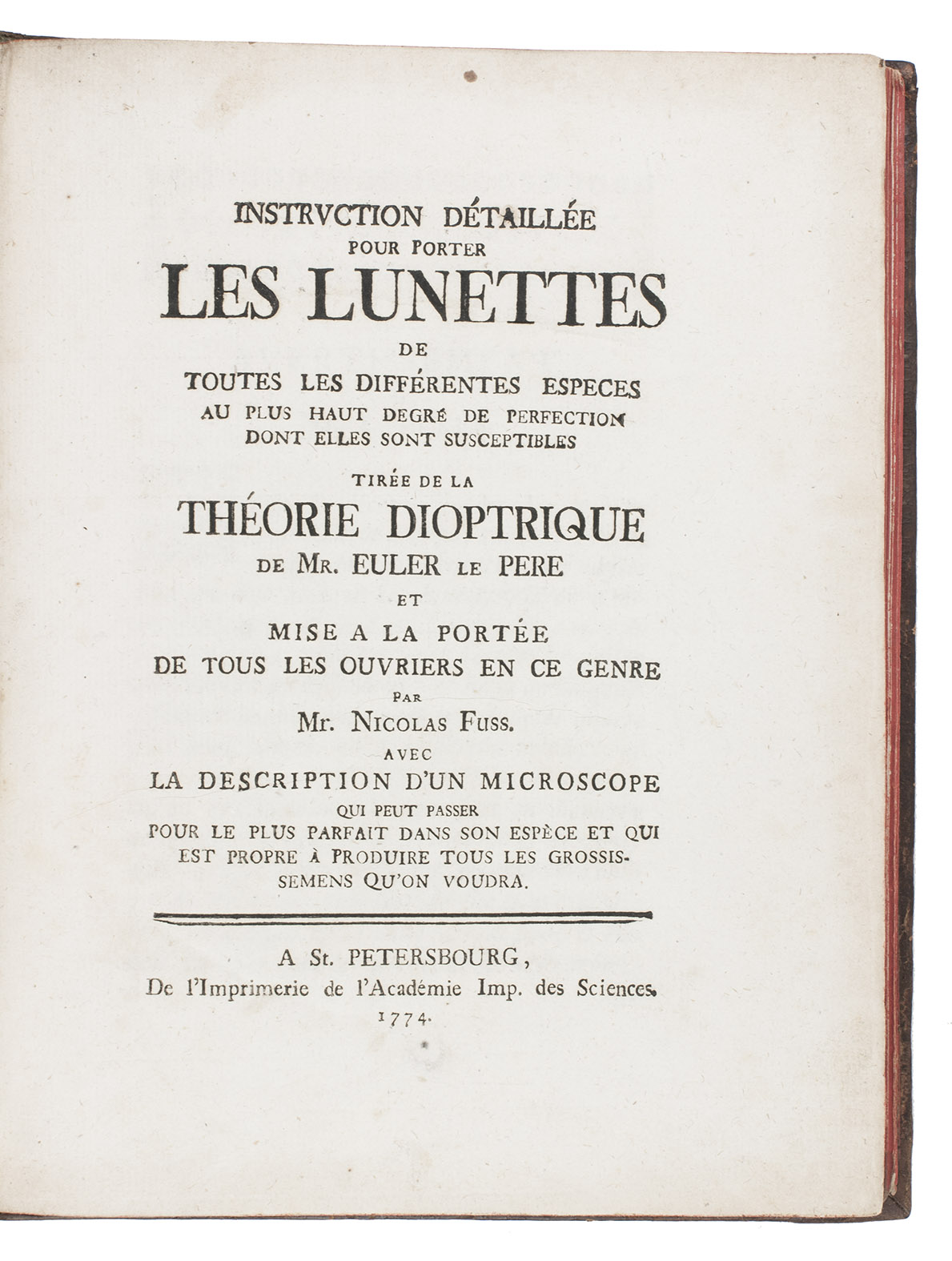 First and only edition of an important manual on the construction of telescopes and microscopes, the first publication by Nicolas Fuss (1755-1826), who grew up in a modest Swiss family but was to become one of the leading mathematicians and astronomers of his generation. The majority of Fuss's writings present solutions to problems raised by Leonhard Euler, in the fields of mathematics, mechanics, astronomy and geodesy. Euler's memoirs had been published earlier, but they were inaccessible to most people working in optics. Fuss published the present work, giving a very simple and rather schematic résumé of Euler's work. He listed "a number of formulae for the construction of telescopes with a magnification of five to fifty times, for achromatic telescopes with three lenses and a magnification from 25 to 320 times, and for achromatic telescopes with four or five lenses" (Daumas). Fuss gave all the necessary theoretical measurements for constructing these instruments. It ends with a description of a microscope with an achromatic objective of three lenses.