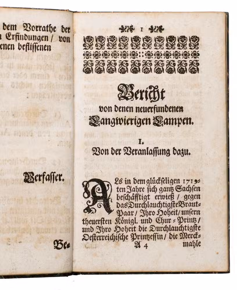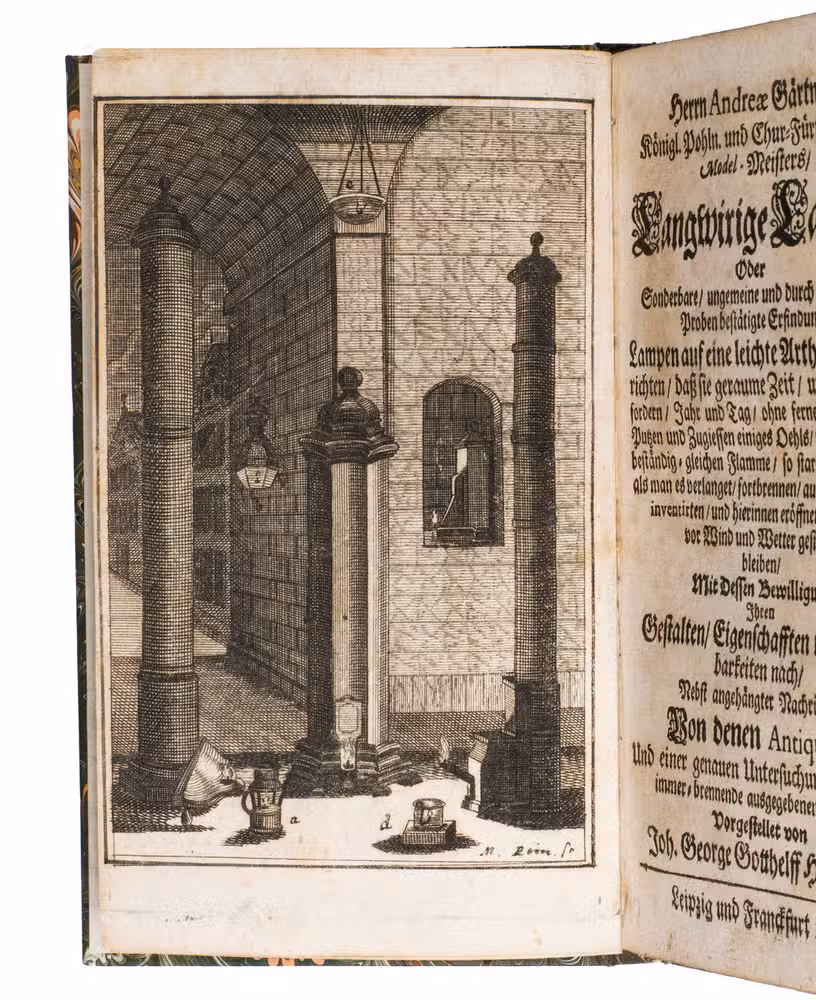 Rare first edition in book form (parts had been published in 1720 in the periodical Berlinische und Cölnische ordinaire Post-Zeitung) of descriptions of lamps capable of burning for prolonged periods without having to be refuelled, invented by the Saxon court mechanic Andreas Gärtner (1654-1727), a cabinet maker and mechanic who had learned his trade during twelve years travel throughout Germany and Italy (Venice, Bologna and Rome). By 1686 he was royal cabinet maker to the Dresden court, and later also royal mechanic. Delighting in complicated mechanical models and devices, he soon became known as the "Saxon Archimedes". Unfortunately, most of his works perished in a fire at the Wackerbarth Palace in 1728. Gärtner's famous world clock (ca. 1700), boasting 365 dials, survives and still draws crowds at the Zwinger (palace and grounds) in Dresden. The frontispiece shows some of his newly-invented lamps.