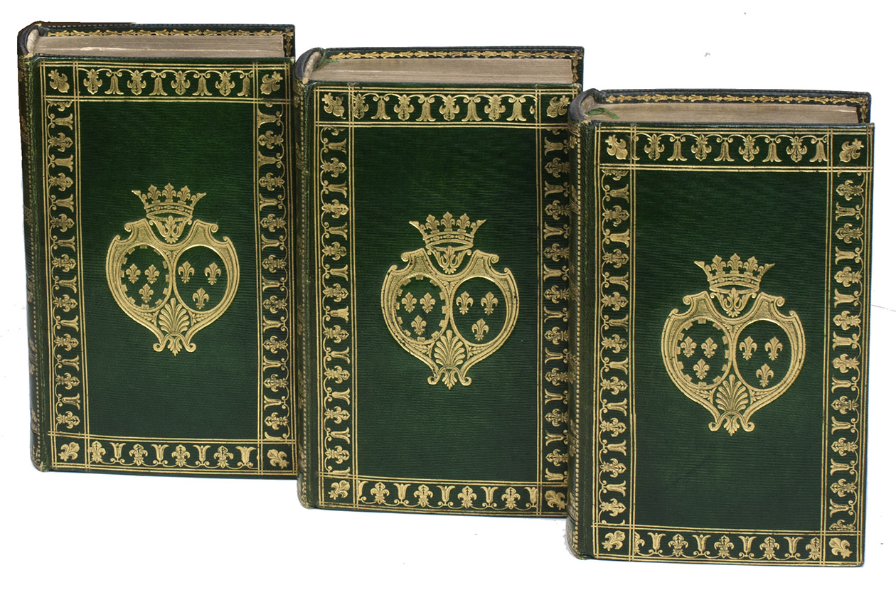 Very rare first and only edition of a compendious educational work intended for girls, dedicated (in the newly restored Bourbon monarchy) to Marie Thérèse de France (1778-1851), Duchesse d'Angoulême and daughter of King Louis XVI and Queen Marie Antoinette, the only heir directly descended from Louis XVI to survive the Revolution. The dedication itself appears in volume 1 (1817), but is noted on all three title-pages (so also 1816). The present copy is in a beautiful armorial morocco binding clearly intended as a dedication copy for Marie Thérèse, with her arms on both boards of each volume. She had married her first cousin Louis Antoine d'Artois (1775-1844), Duc d'Angoulême in 1799 (he was to be King of France for 20 minutes in 1830 when his father and he abdicated, then pretender to the throne, calling himself Louis XIX). She was nearly forty and childless when the book appeared, soon after the 1814/15 restoration of the Bourbon monarchy with her uncle as King Louis XVIII. Rather than impale the husband's and father's arms as the English did, French ladies displayed them side by side: courtoisie.