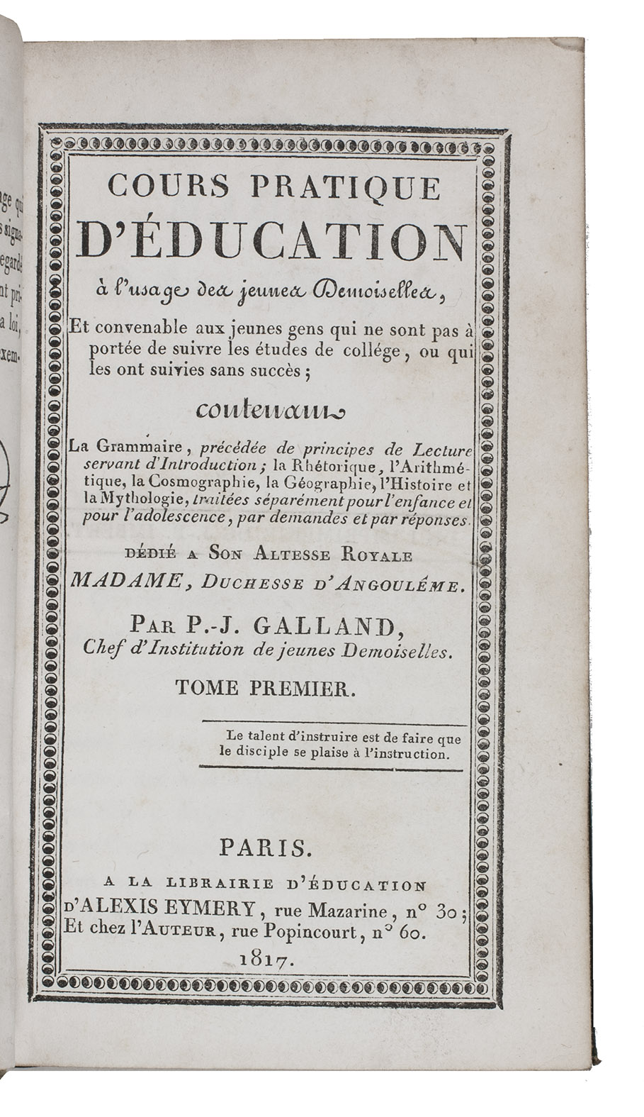 Cours pratique d'éducation à l'usage des jeunes demoiselles, et convenable aux jeunes gens qui ne sont pas à porté de suivre les études de collège, ou qui les ont suivies sans succès; contenant la grammaire, précédée de principes de lecture servant d'introduction; la rhétorique, l'arithmétique, la cosmographie, la géographie, l'histoire et la mythologie, traitée séparément pour l'enfance et pour l'adolescence, par demandes et par réponses. Dédié à Son Altesse Royale Madame, Duchesse d'Angoulême.