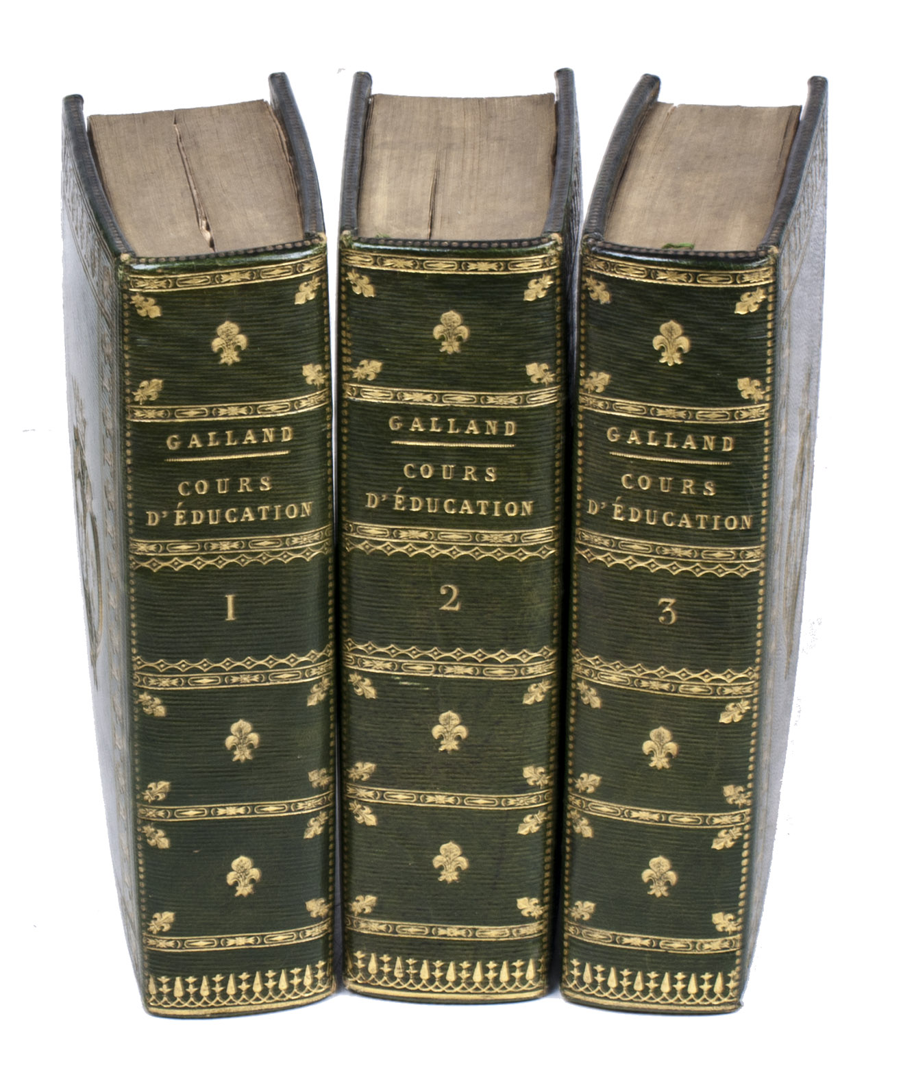 Paris, Librairie d'Éducation d'Alexis Eymerie, and the author (on back of title-page: printed by J.-B. Imbert), 1816 (vol. 3!)-1817 (vols. 1-2). 3 volumes. Large 12mo (17.5 x 10.5 cm). With a large folding engraved map of France, 3 astronomical and cosmographical figures on 3 engraved plates, a large folding hierarchical "tableau synoptique" of French grammar, and numerous numerical tables and mathematical equations in the text. Contemporary richly gold-tooled, grained green morocco, each board with the large arms of the dedicatee, Marie Thérèse de France, Duchesse d'Angoulême, daughter of King Louis XVI: a crowned double coat of arms (each in an oval) in a wide border of fleurs-de-lis and tulip-like flowers, the dexter arms (of her husband) that normally used by the Duc de Berry, but also by the seconde maison Capétienne d'Artois and the sinister arms (of her father Louis XVI) matching that of the Kings of France, pink silk endleaves, gilt edges. [4], 515, [1]; 552, [2]; 492, [2] pp.