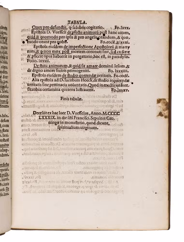 Gansfort studied in Zwolle, where he had close ties to the Brethren of the Common Life, as well as the nearby monastery of Mount St. Agnes, where Thomas a Kempis then lived. He left the Low Countries in 1449, studying and teaching in Cologne, Paris, Rome, Venice, Basel, and Heidelberg. Reuchlin was one of his students. In the late 1470s he returned to the monasteries in Groningen and Zwolle, remaining there for the rest of his life. Now a renowned scholar, he helped determine the direction of these influential monasteries. The present volume contains six of his theological treatises: 1) De benignissima dei providentia; 2) De causis misteriis, & effectibus dominicae incarnationis & passionis; 3) De dignitate & potestate ecclesiastica; 4) De sacramento penitentiae; 5) Quae sit vera communio sanctorum; and 6) De purgatorio. After being published in Zwolle in 1522, the collection was also published in Basel by Adam Petri in 1523. Luther, who wrote a preliminary note for this edition of the Farrago, noted that if he himself had written nothing before reading Gansfort, people might have supposed he took all his ideas from him. In the sixteenth century Gansfort's writings were placed on the Index of prohibited books. He certainly stands as a leading figure who helped prepare the way for the Reformation.