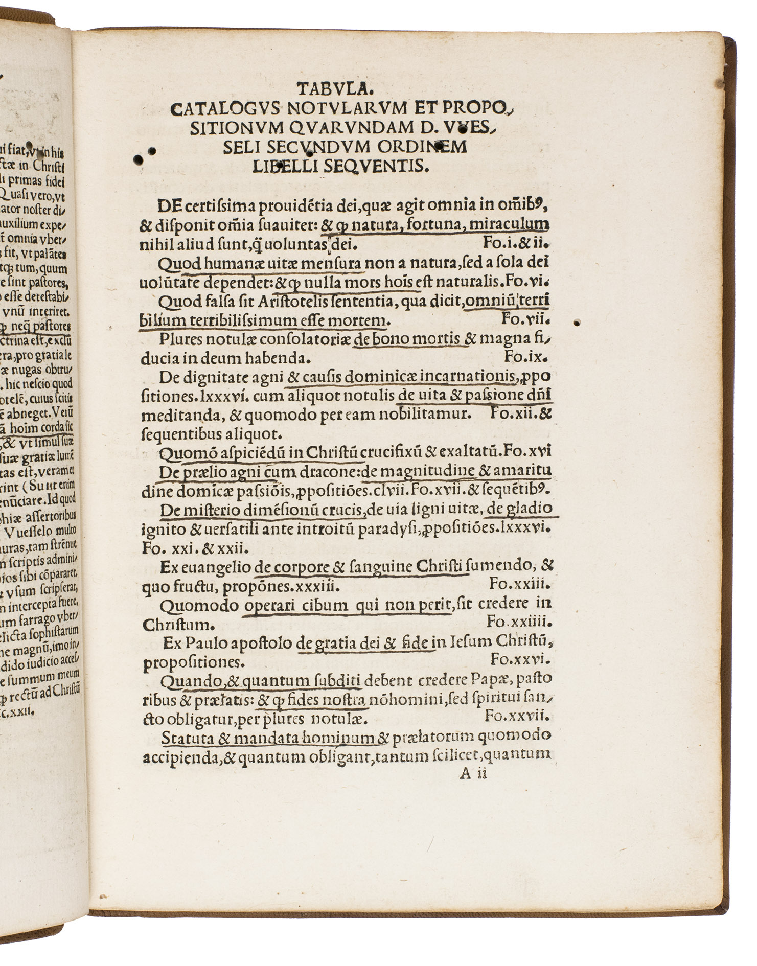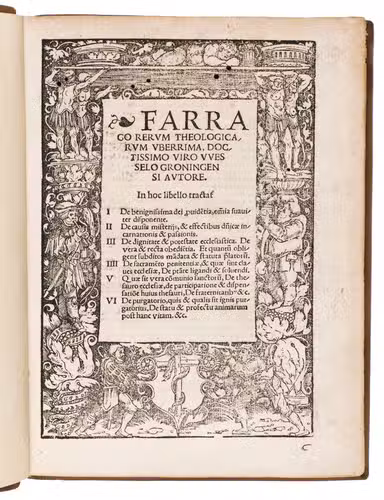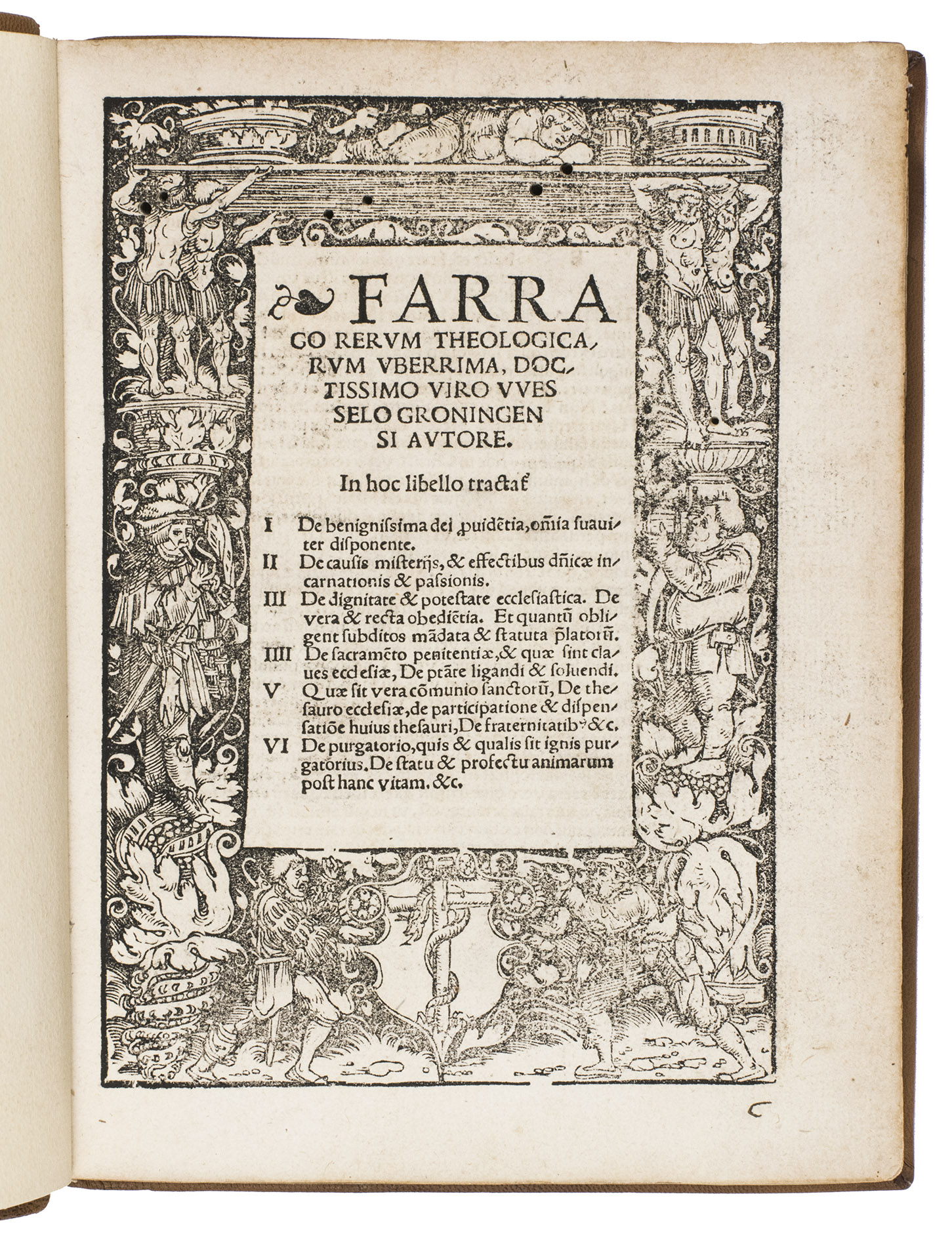 First German edition of the first collection of Wessel Gansfort's important and influential writings on theology, issued only a couple of months after the original edition (Zwolle, Simon Corver, beginning of 1522). The present edition bears no date on the title page or in the colophon, but the preliminary note by Andreas Palaeosphyra is dated [15]22, so the work is believed to have been published in that year. The volume was edited by Johann Arnold from Marktbergel in Mittelfranken, who was a corrector at the Lotter office, and who dedicated this edition to the well-known humanist and reformer Andreas Althamer. The beautiful woodcut border on the title page has been attributed to Lucas Cranach the Elder, and is not present in other editions.