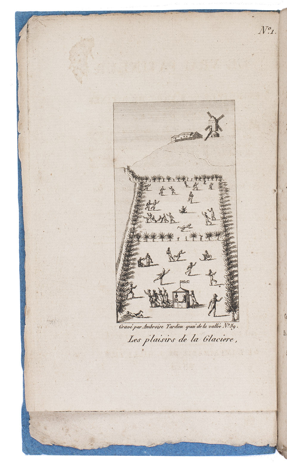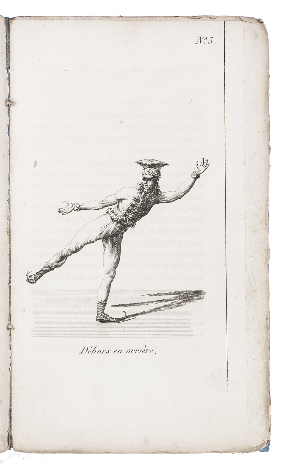 Paris, Delespinasse, Delaunaux, Nepveu, the author (printed by Joseph-Gaspard Gillé fils), 1813. 12mo (18 x 10.5 cm). With 8 numbered engraved plates, namely a frontispiece view of a skating rink with many skaters, engraved by Ambroise Tardieu, and 7 images of individual skaters, each in a different pose. Later blue paper wrappers. Preserved in modern half morocco slipcase. XXIV, 93, [1 blank] pp.