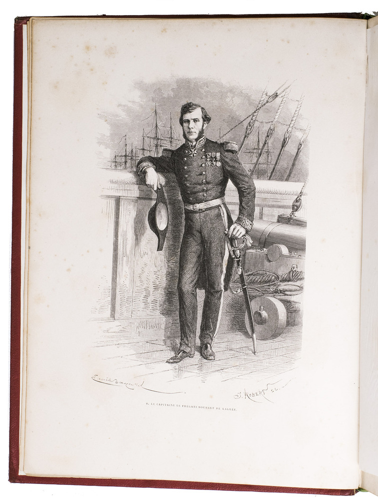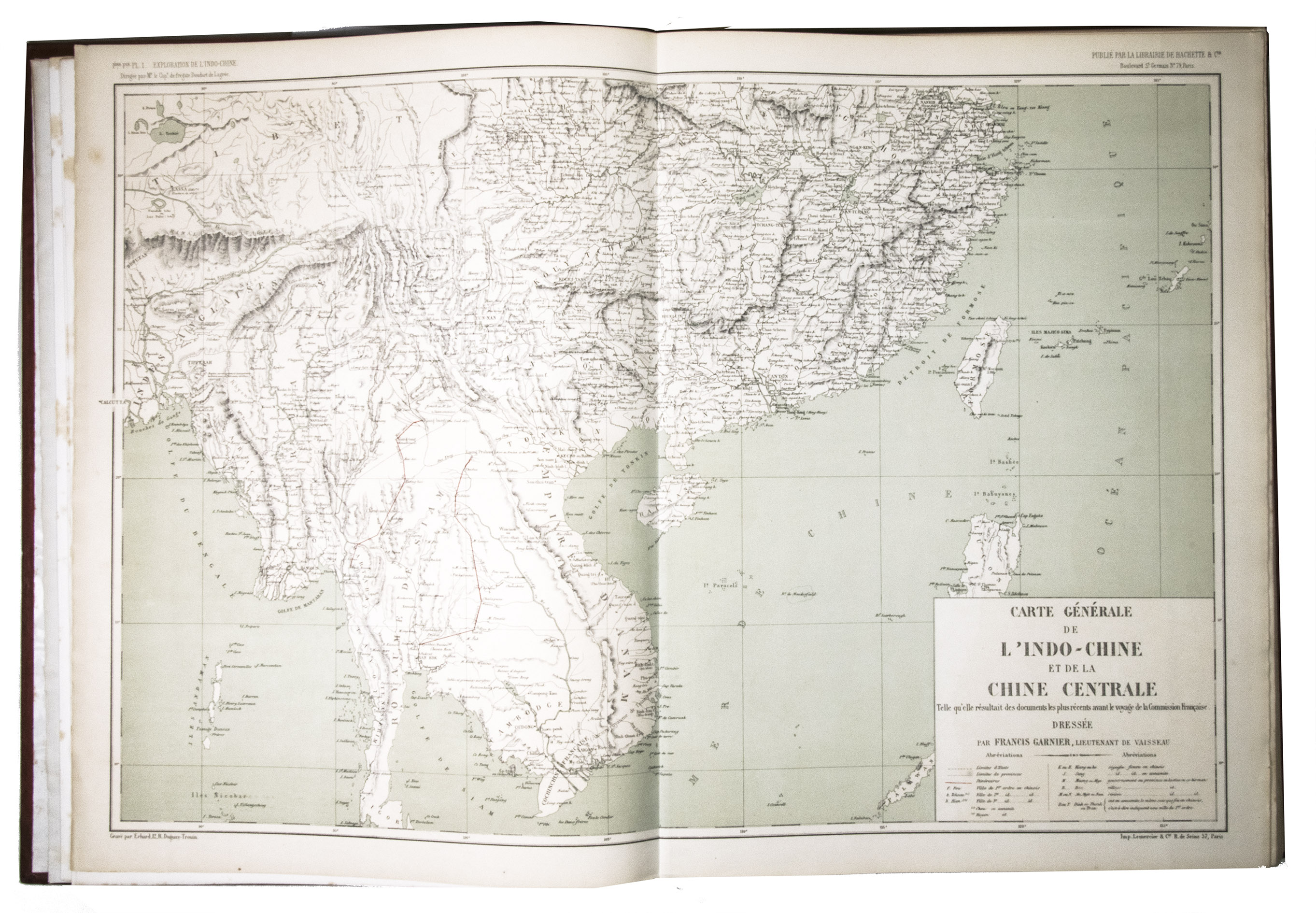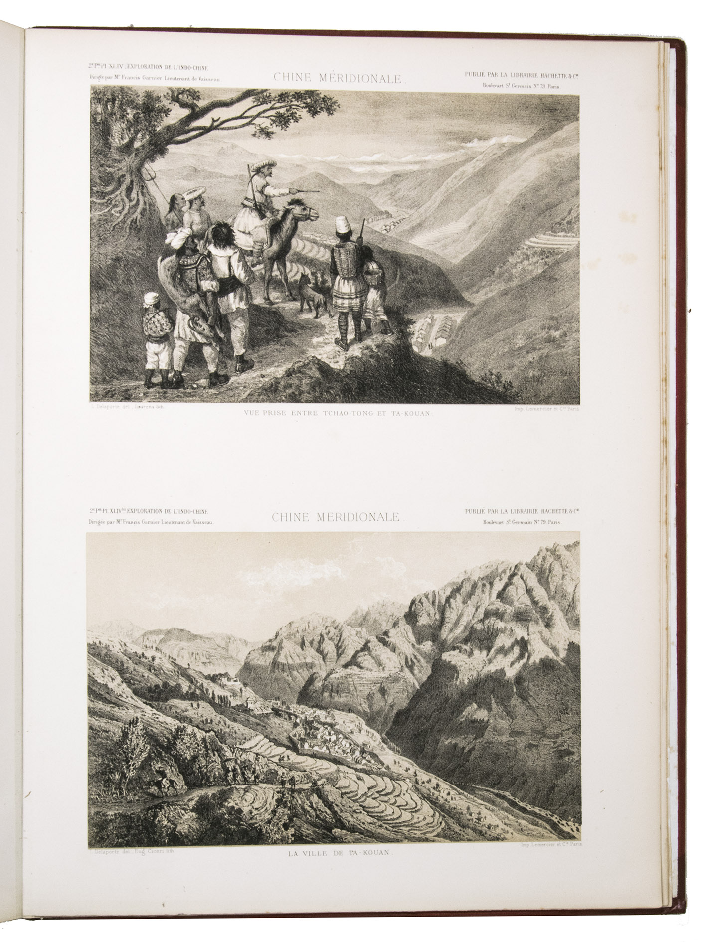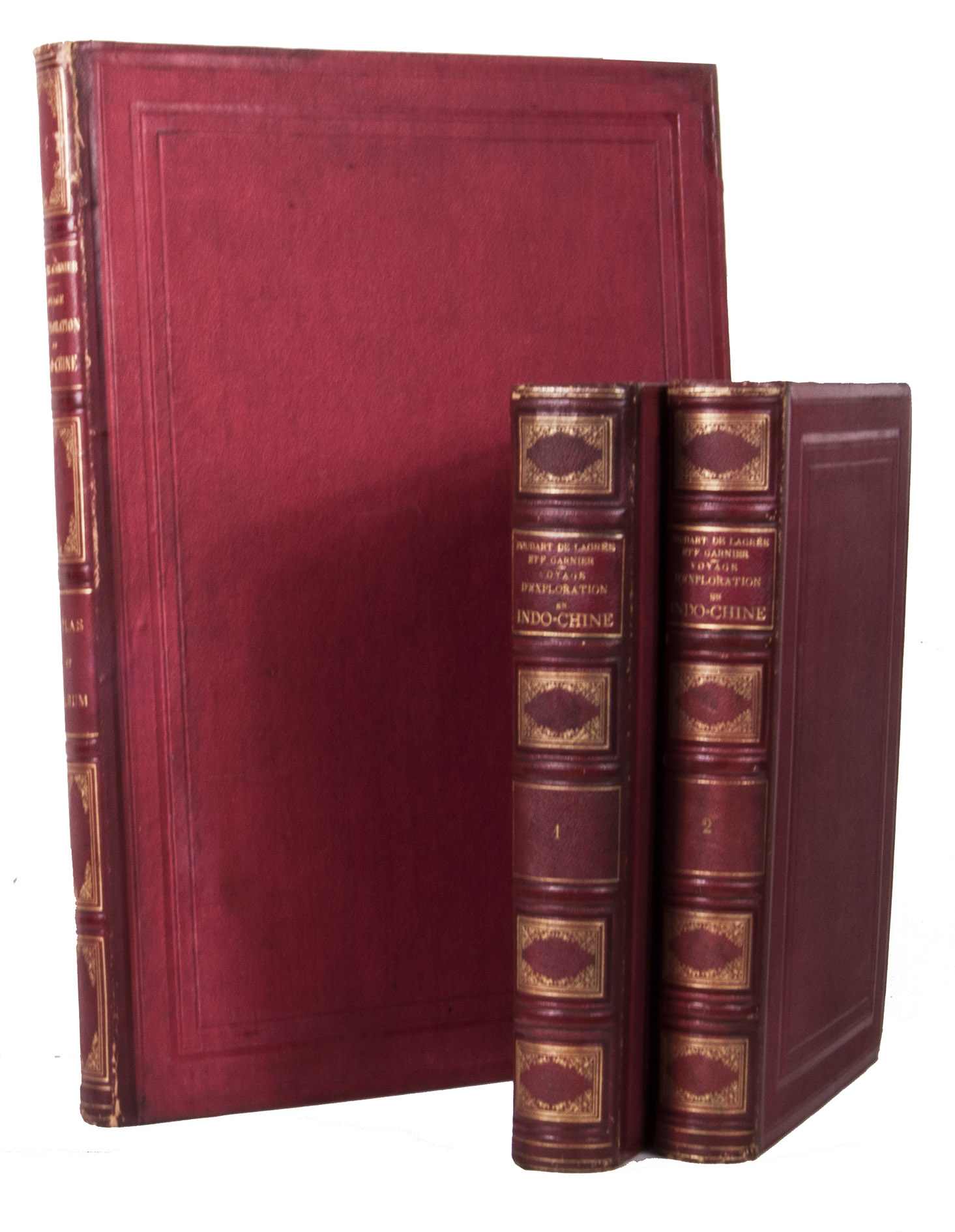 Paris, Librairie Hachette et Cie, 1873. 2 text volumes and 1 atlas volume in 2 parts. Large 4to text volumes, and folio atlas. With a lithographed portrait of Doudart de Lagrée, 53 full-page maps and views, and 157 illustrations in the text. The atlas with 69 lithographed maps, plans and views. Contemporary gold- and blind-tooled quarter red morocco, with the title lettered in gold on the spine, red cloth sides with blind tooled borders on the front and back, gilt edges, watered silk end papers. V, [3], 580, [4]; [6], 523, [5]; [6], XII pp.