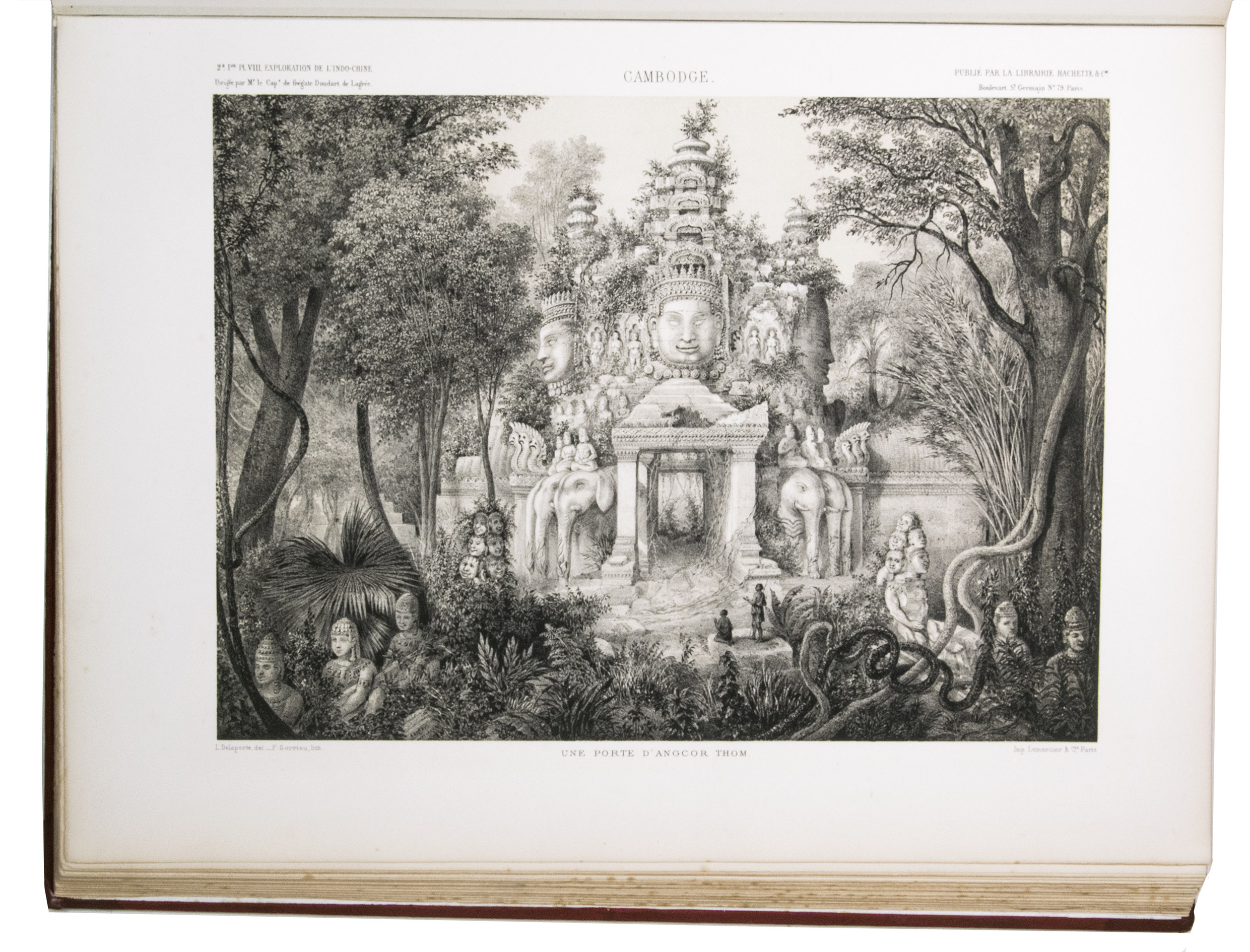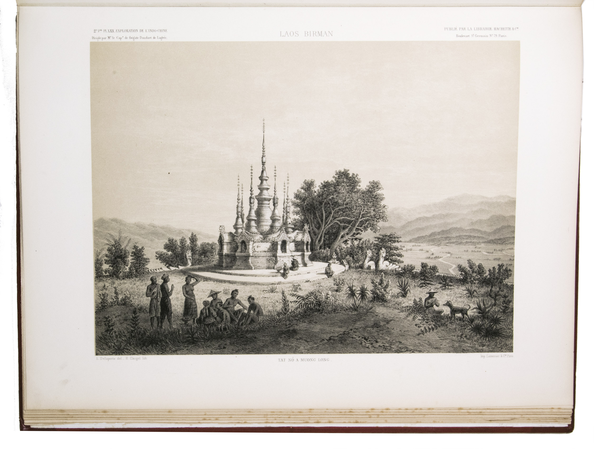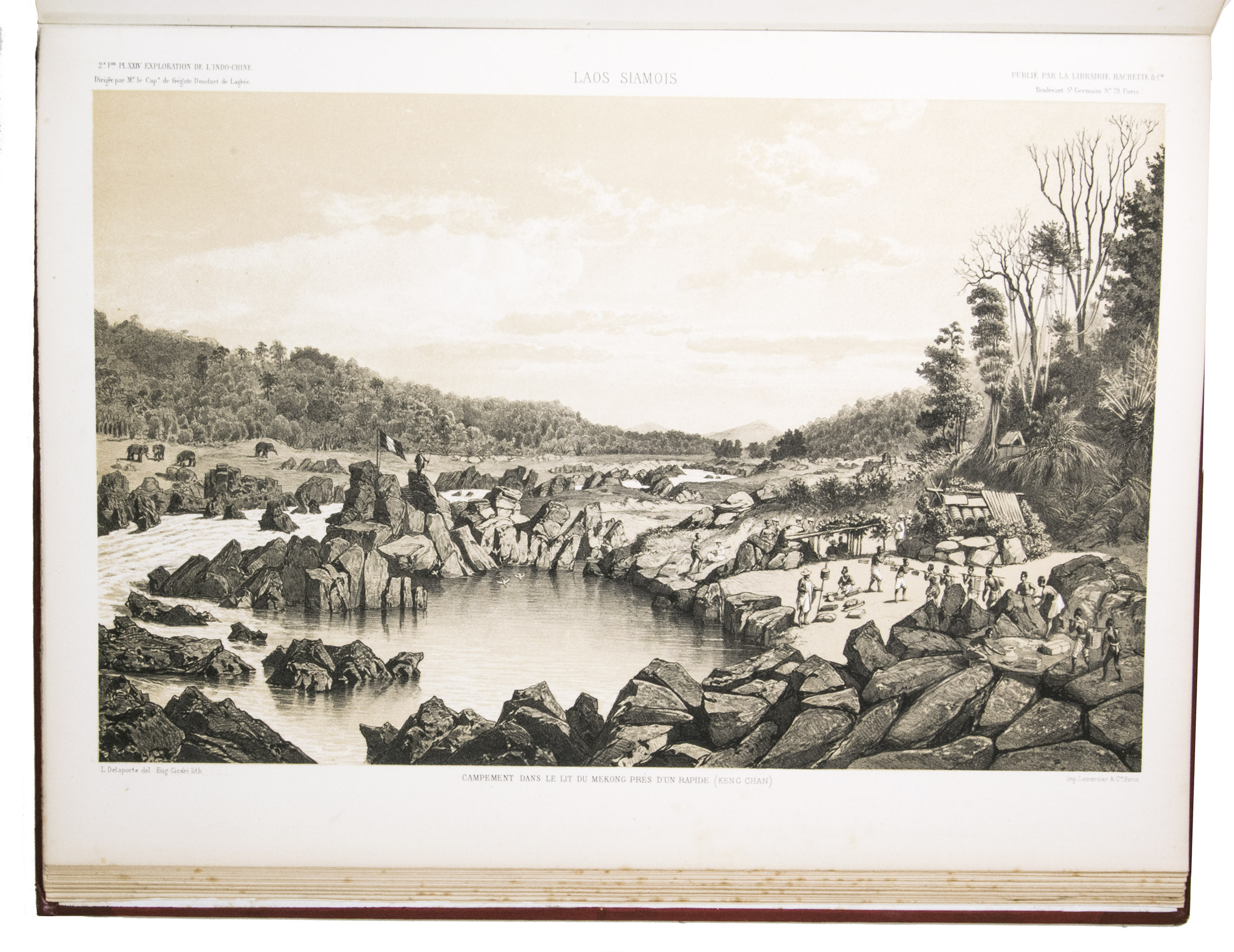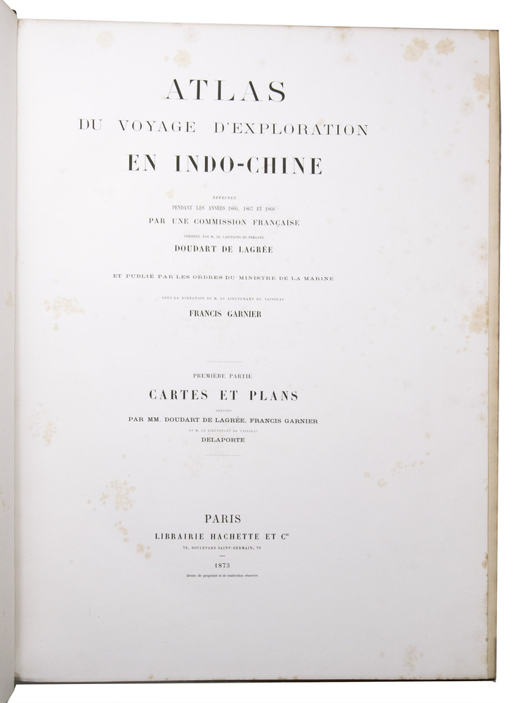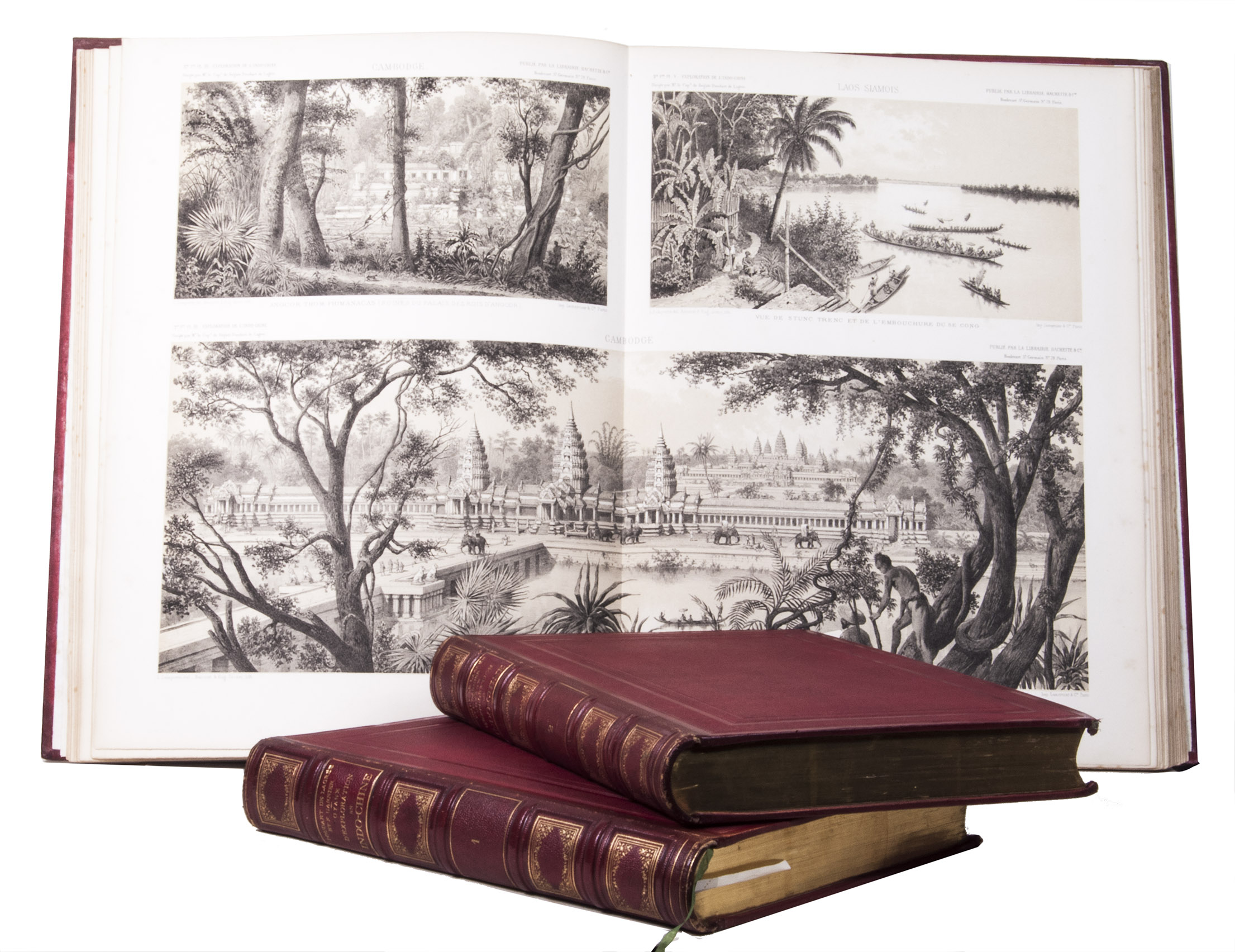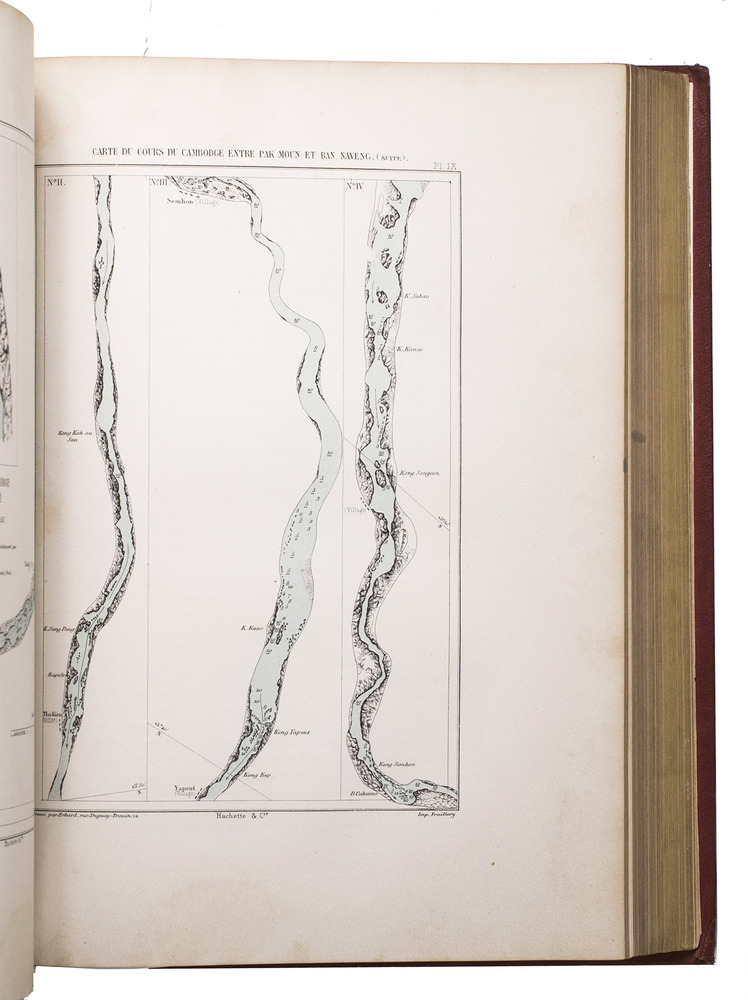 The present work, published posthumously, was limited to just 300 copies. The first volume, written by Garnier, is a travelogue of the harrowing journey. The hundreds of woodcuts, after drawings made by Louis Delaporte, illustrate the monuments, landscapes, and people of Indochina. A second volume presents the scientific findings of the expedition and contains contributions on topics such as meteorology, geology, mineralogy, anthropology, and botany. The large-scale atlas volume contains numerous maps, and lithographs of the most spectacular of Delaportes drawings, including some in colour. These views, in conjunction with the fine illustrations in the text volumes, form a valuable and remarkably wide-ranging visual record of Indochina as a whole, with the depictions of the ancient capital of Laos at Viet Chan and Angkor Wat in Cambodia being particularly impressive.