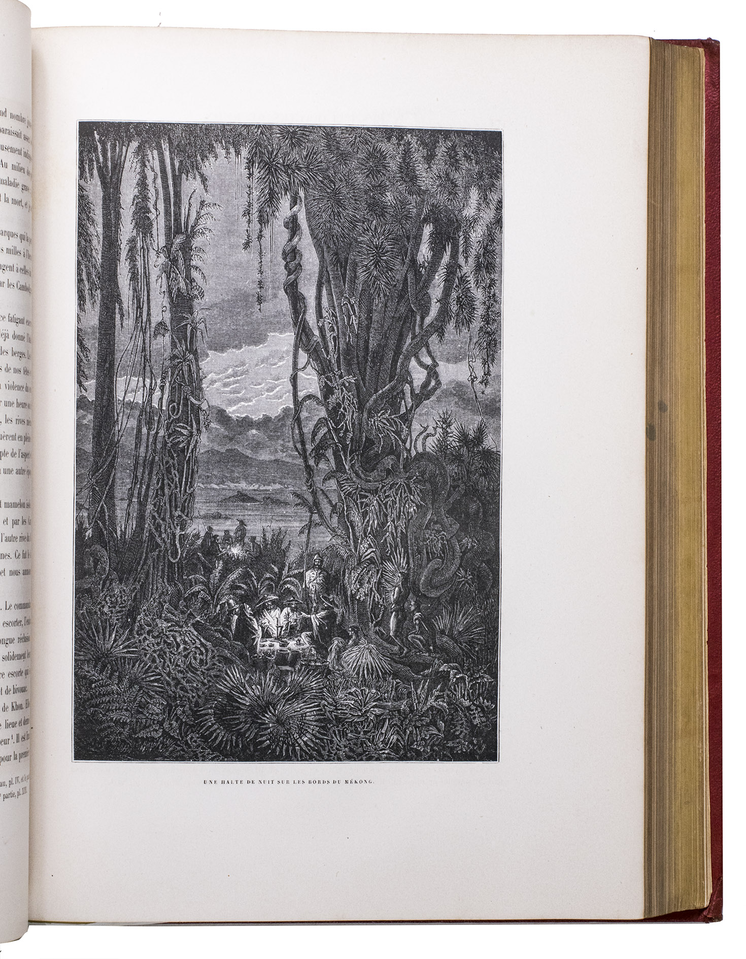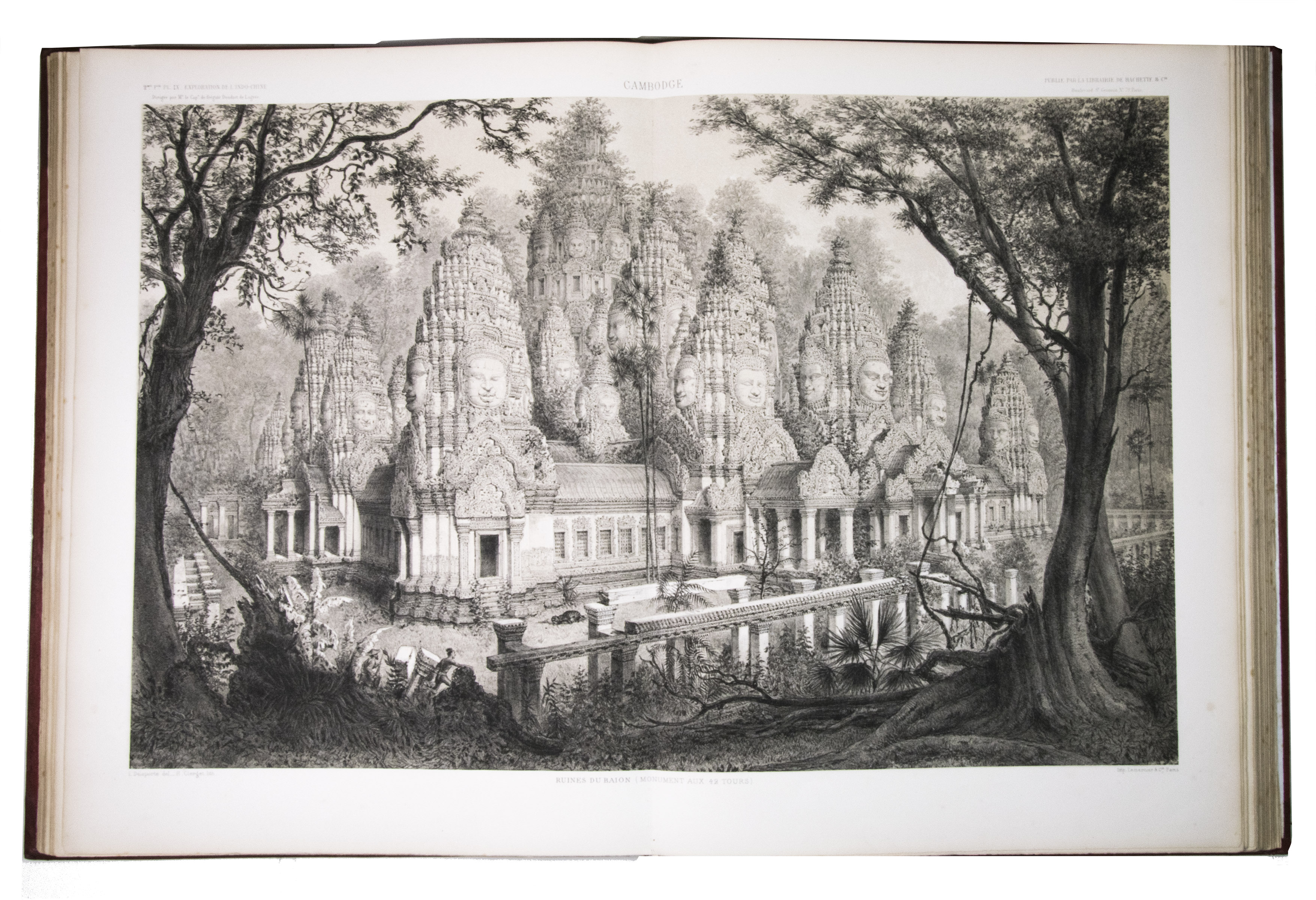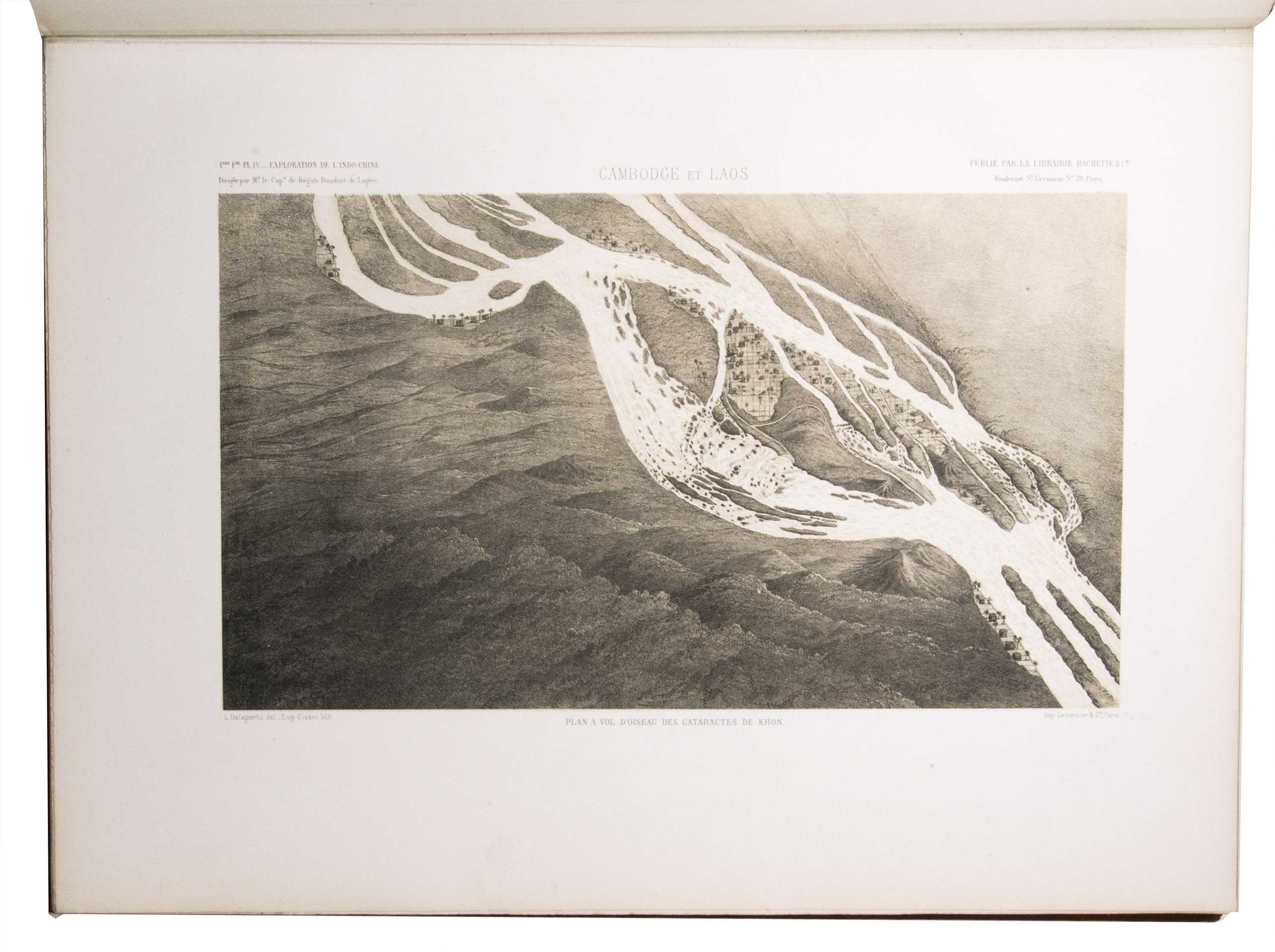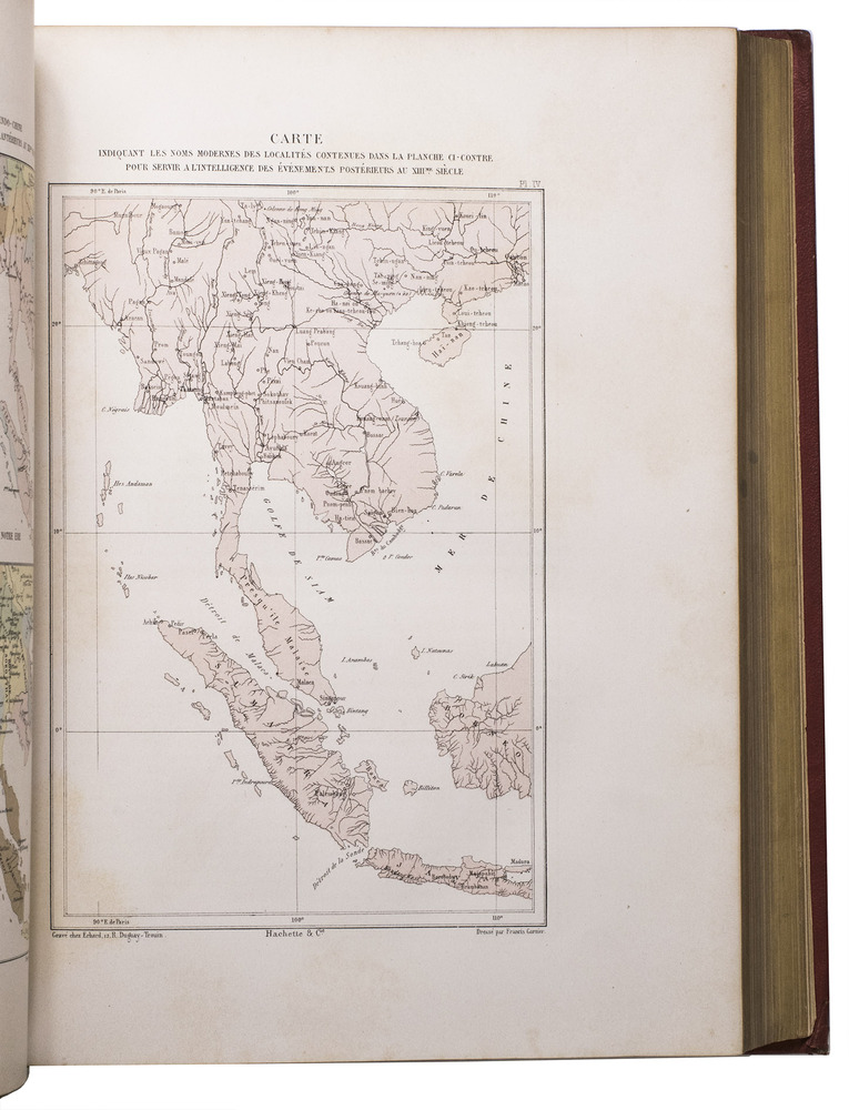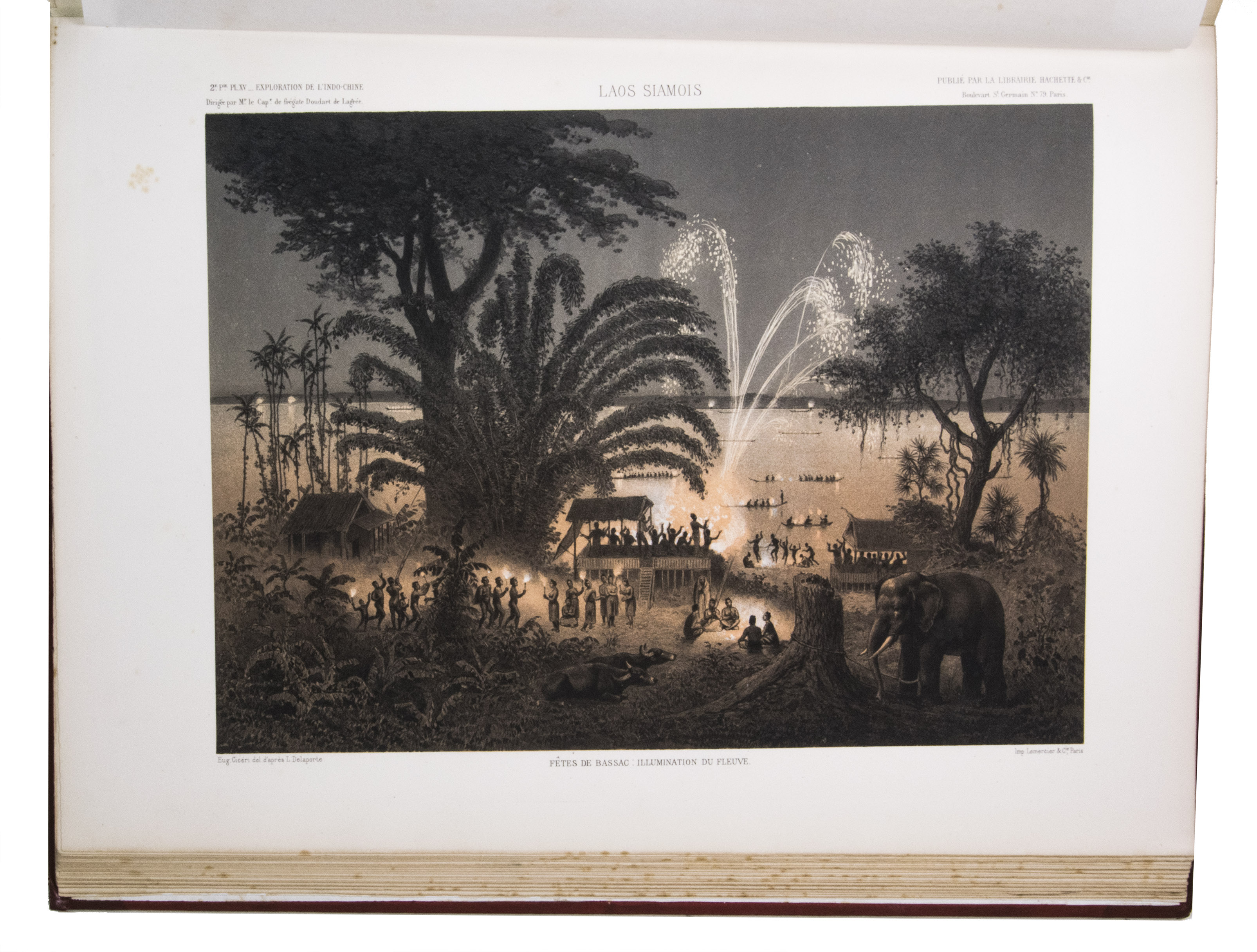 The present work, published posthumously, was limited to just 300 copies. The first volume, written by Garnier, is a travelogue of the harrowing journey. The hundreds of woodcuts, after drawings made by Louis Delaporte, illustrate the monuments, landscapes, and people of Indochina. A second volume presents the scientific findings of the expedition and contains contributions on topics such as meteorology, geology, mineralogy, anthropology, and botany. The large-scale atlas volume contains numerous maps, and lithographs of the most spectacular of Delaportes drawings, including some in colour. These views, in conjunction with the fine illustrations in the text volumes, form a valuable and remarkably wide-ranging visual record of Indochina as a whole, with the depictions of the ancient capital of Laos at Viet Chan and Angkor Wat in Cambodia being particularly impressive.