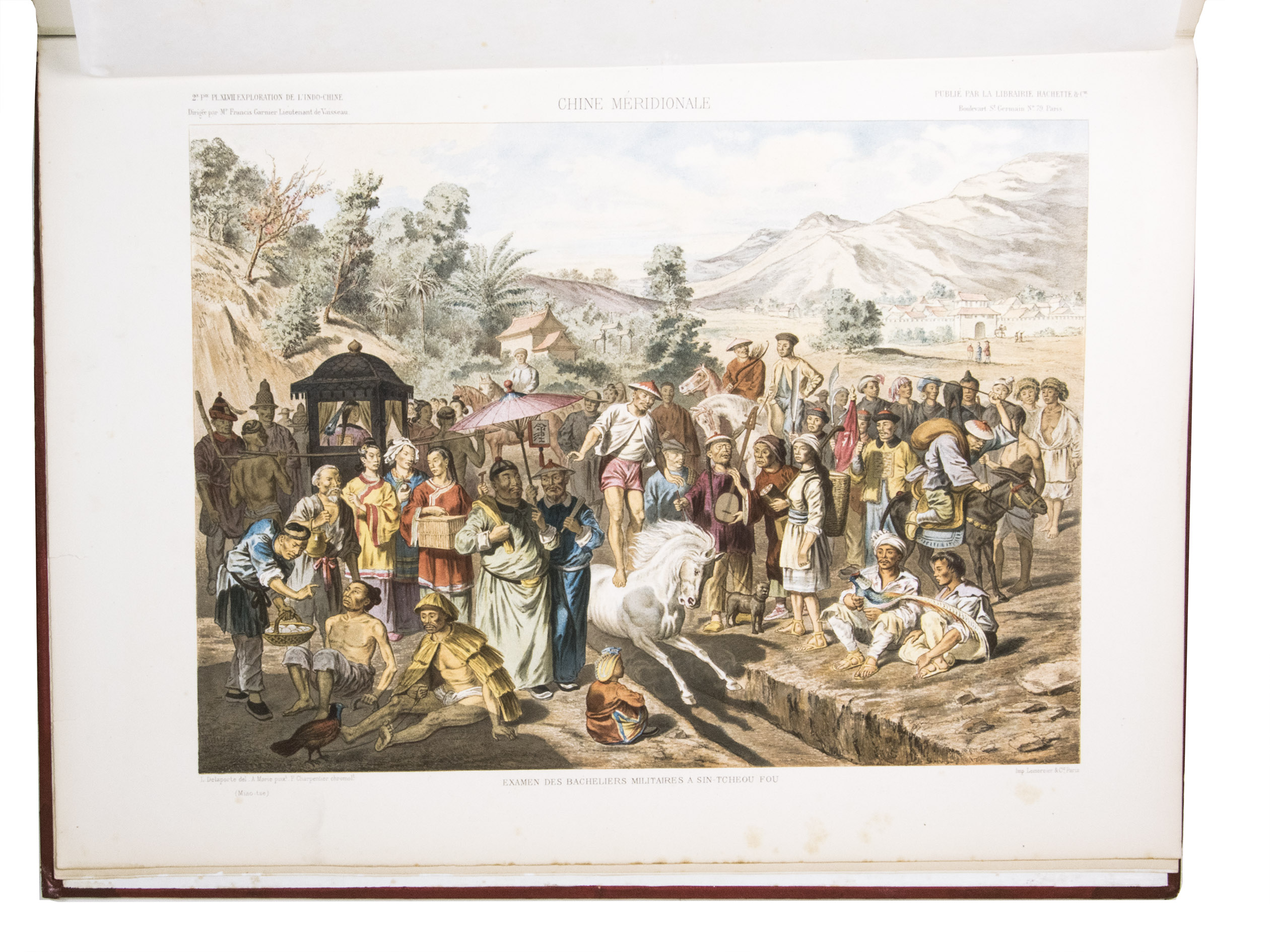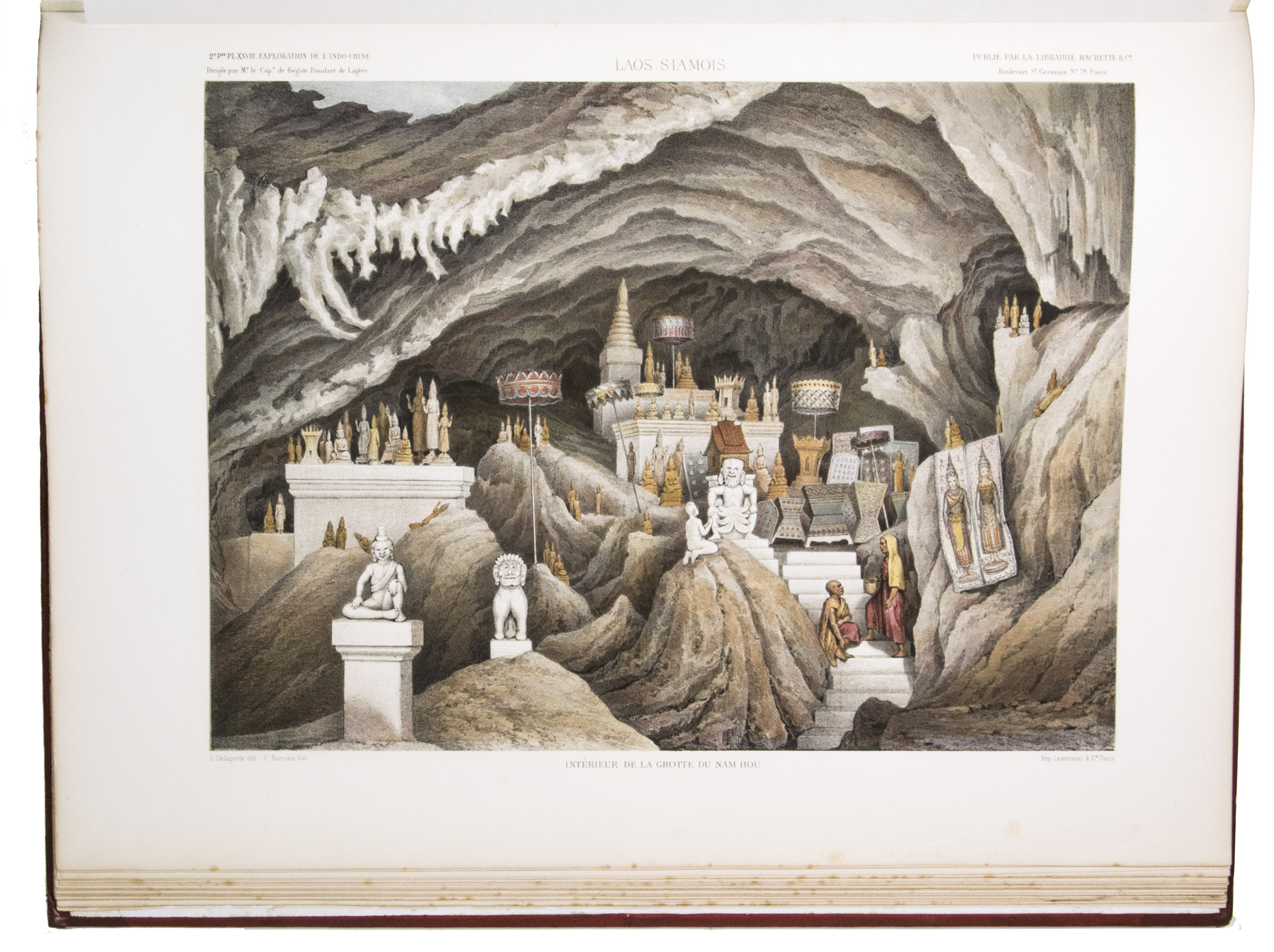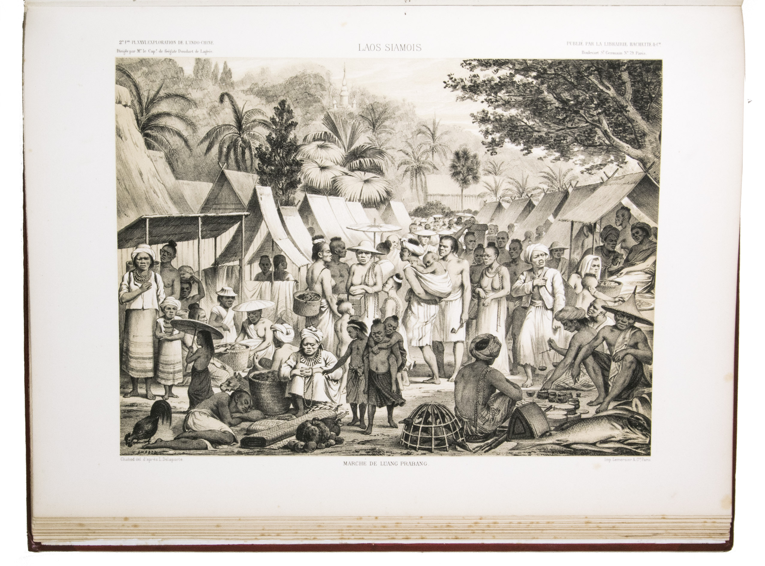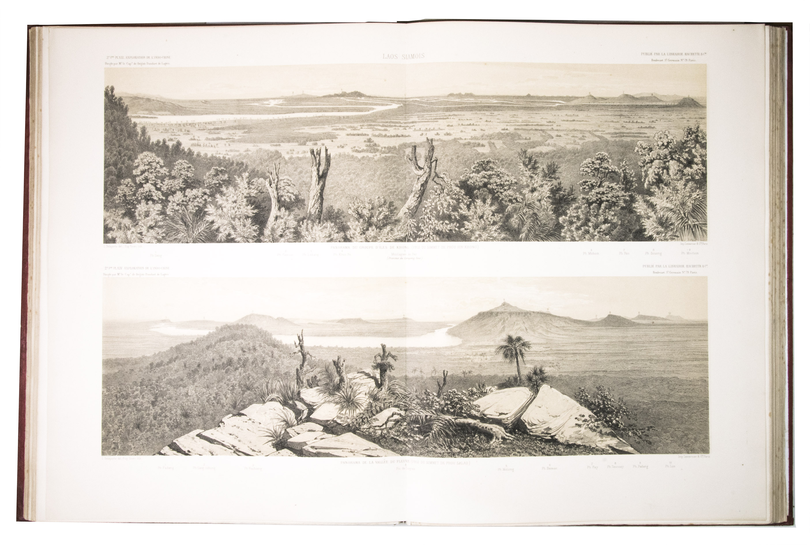 The present work, published posthumously, was limited to just 300 copies. The first volume, written by Garnier, is a travelogue of the harrowing journey. The hundreds of woodcuts, after drawings made by Louis Delaporte, illustrate the monuments, landscapes, and people of Indochina. A second volume presents the scientific findings of the expedition and contains contributions on topics such as meteorology, geology, mineralogy, anthropology, and botany. The large-scale atlas volume contains numerous maps, and lithographs of the most spectacular of Delaportes drawings, including some in colour. These views, in conjunction with the fine illustrations in the text volumes, form a valuable and remarkably wide-ranging visual record of Indochina as a whole, with the depictions of the ancient capital of Laos at Viet Chan and Angkor Wat in Cambodia being particularly impressive.