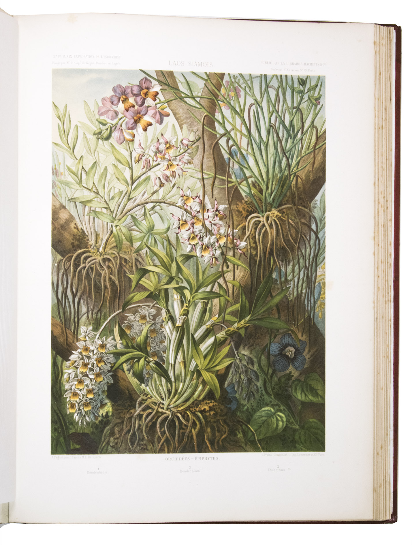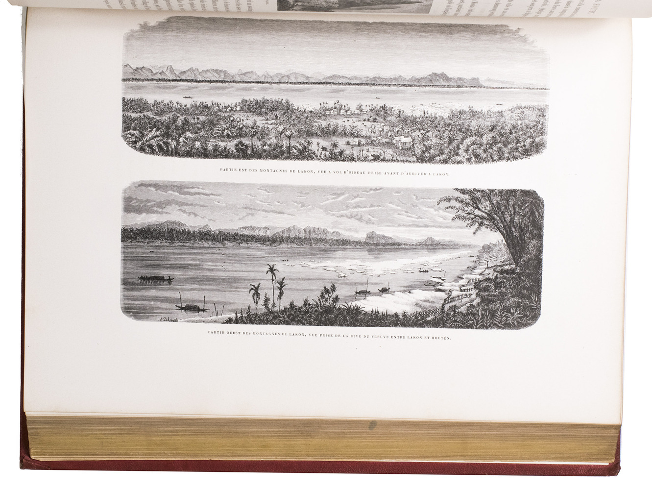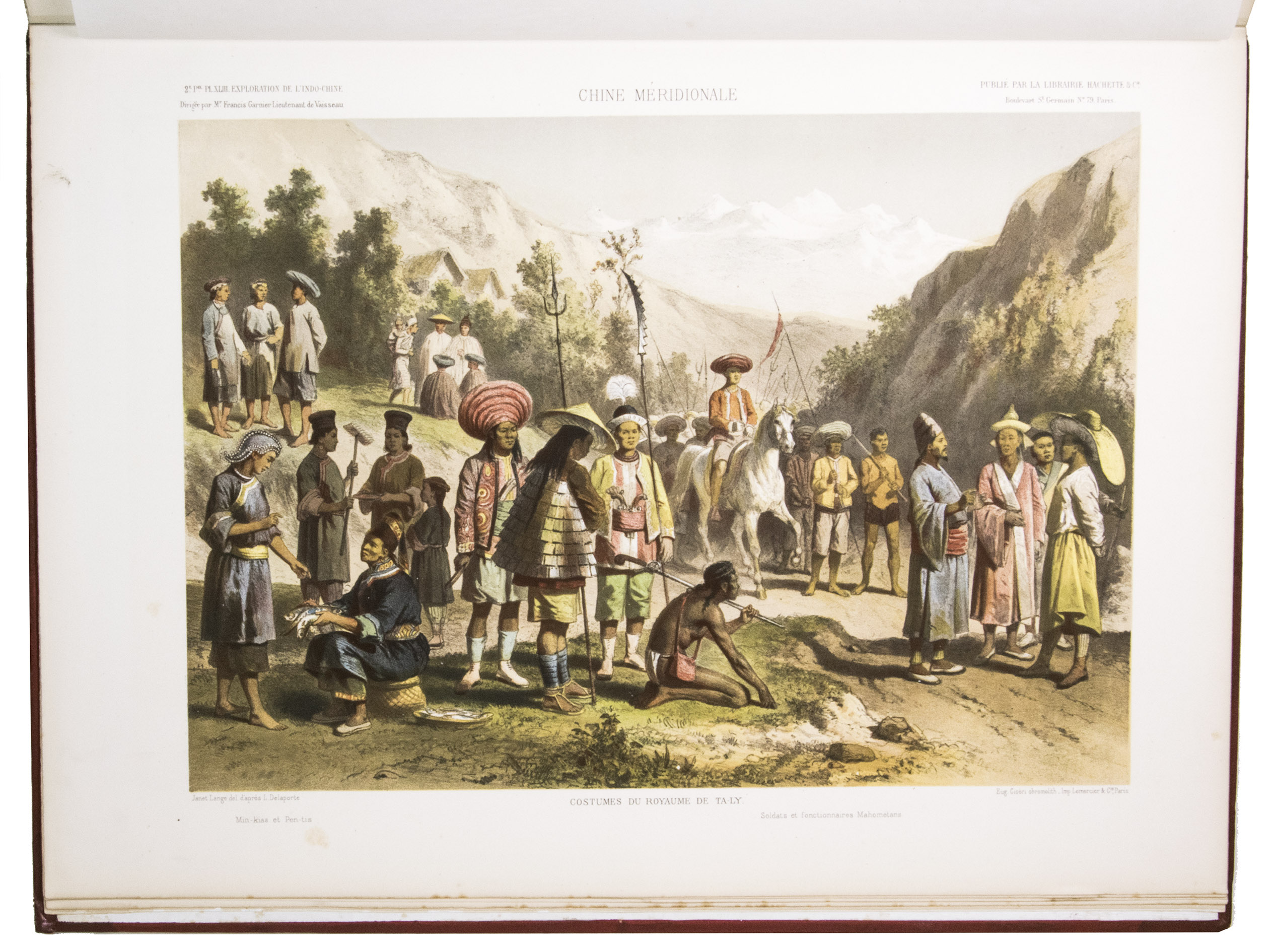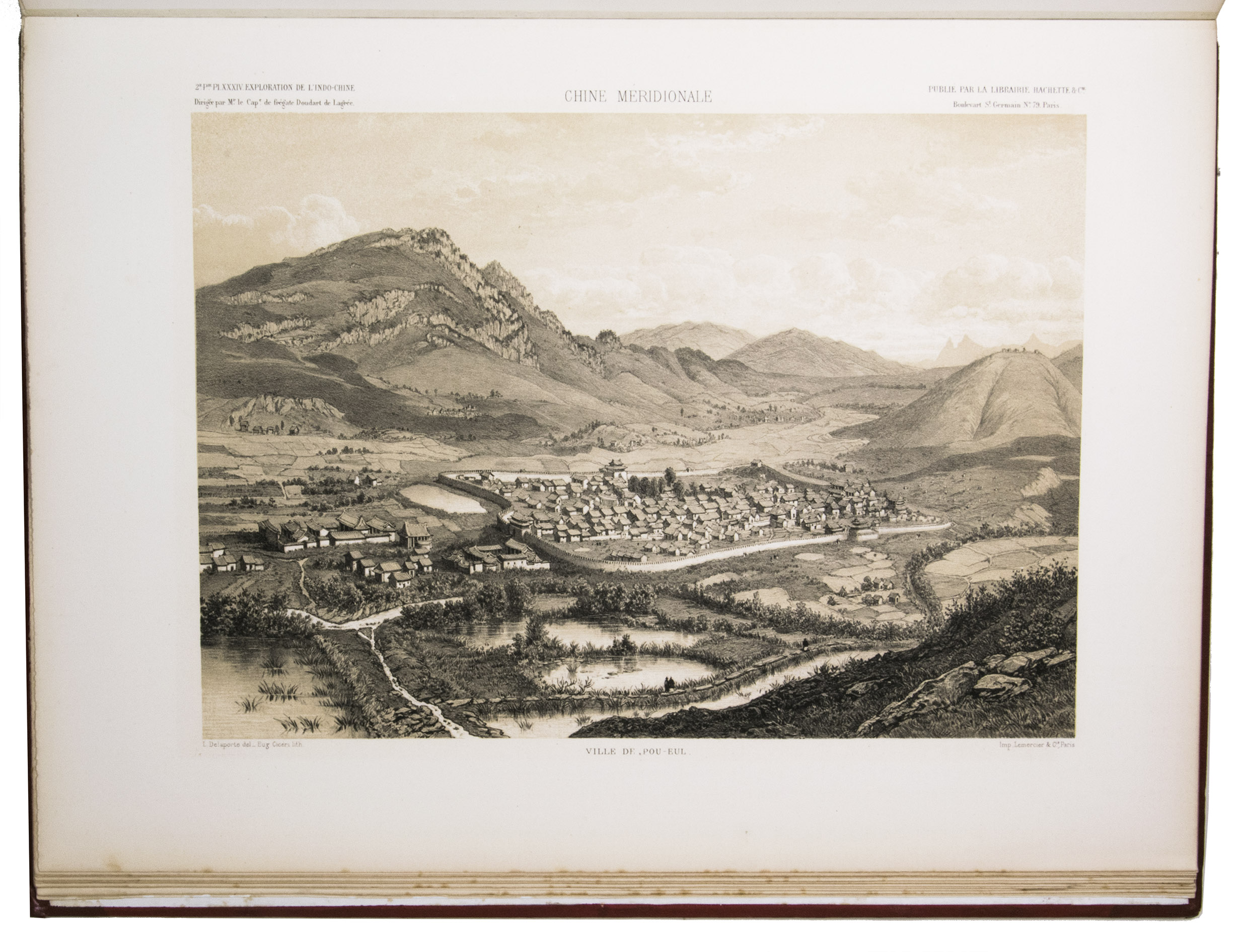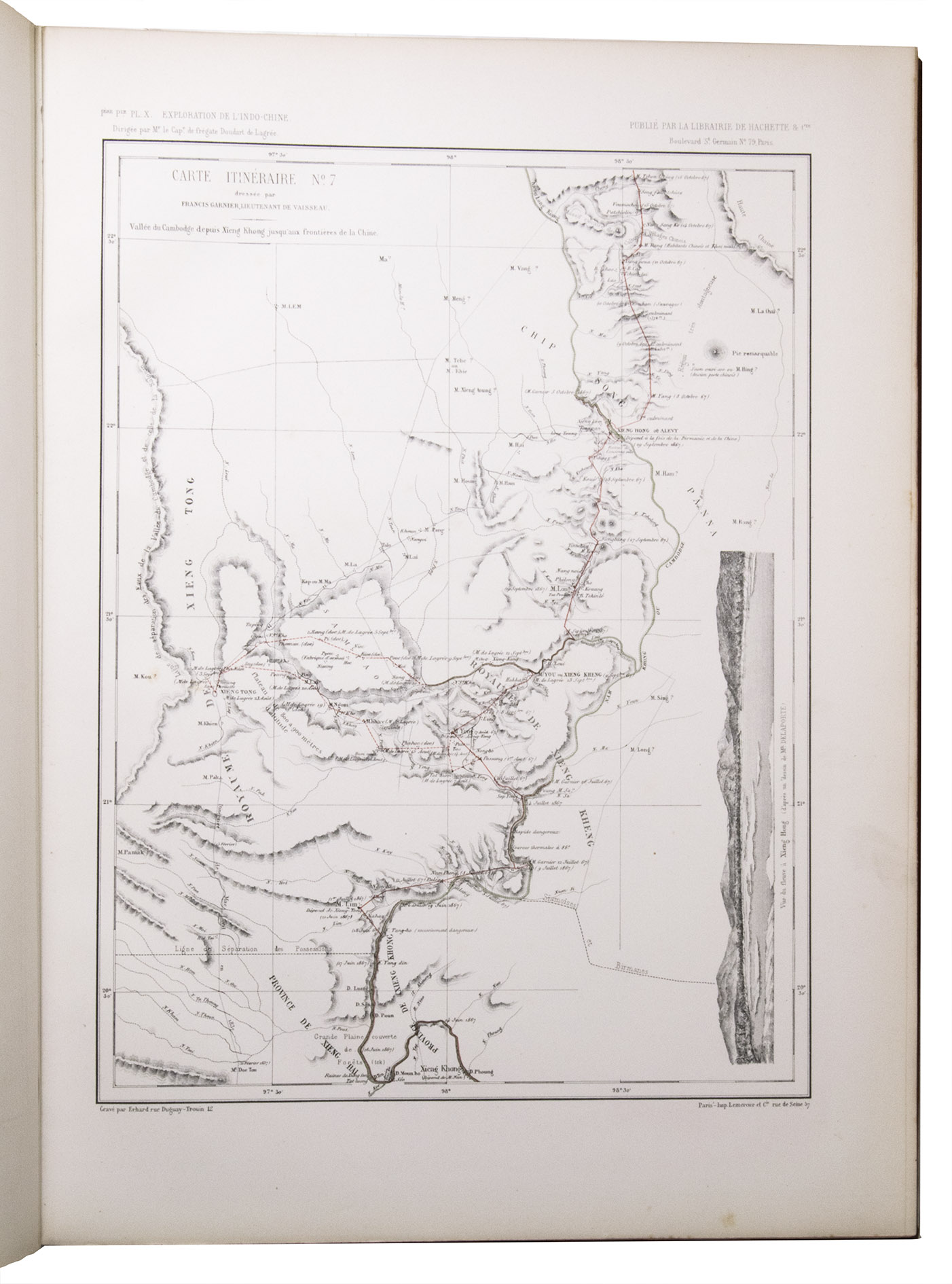 The present work, published posthumously, was limited to just 300 copies. The first volume, written by Garnier, is a travelogue of the harrowing journey. The hundreds of woodcuts, after drawings made by Louis Delaporte, illustrate the monuments, landscapes, and people of Indochina. A second volume presents the scientific findings of the expedition and contains contributions on topics such as meteorology, geology, mineralogy, anthropology, and botany. The large-scale atlas volume contains numerous maps, and lithographs of the most spectacular of Delaportes drawings, including some in colour. These views, in conjunction with the fine illustrations in the text volumes, form a valuable and remarkably wide-ranging visual record of Indochina as a whole, with the depictions of the ancient capital of Laos at Viet Chan and Angkor Wat in Cambodia being particularly impressive.