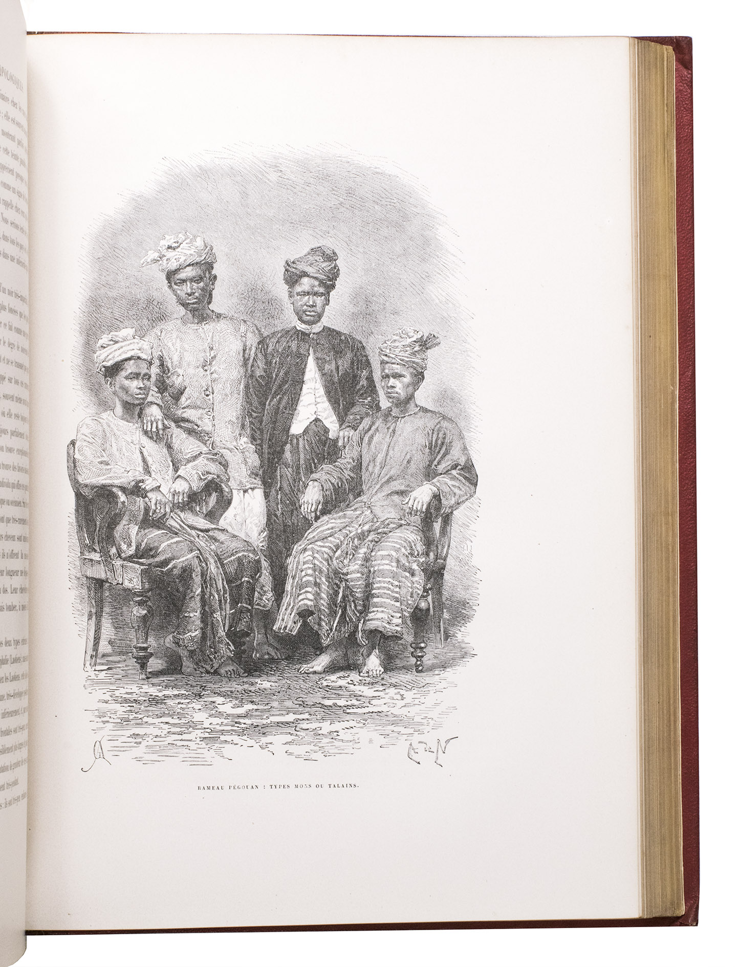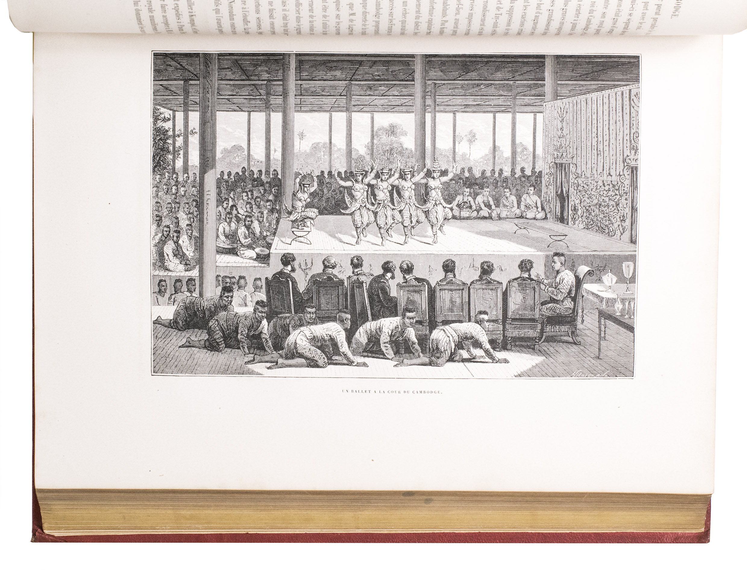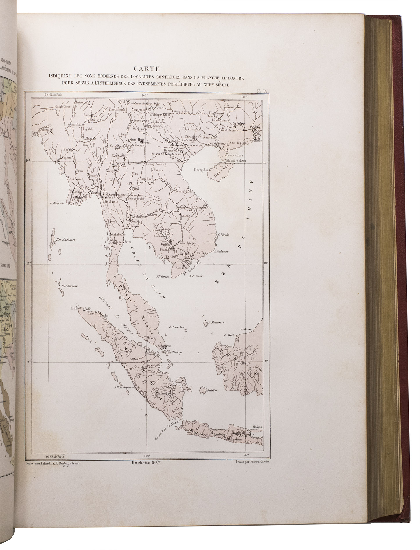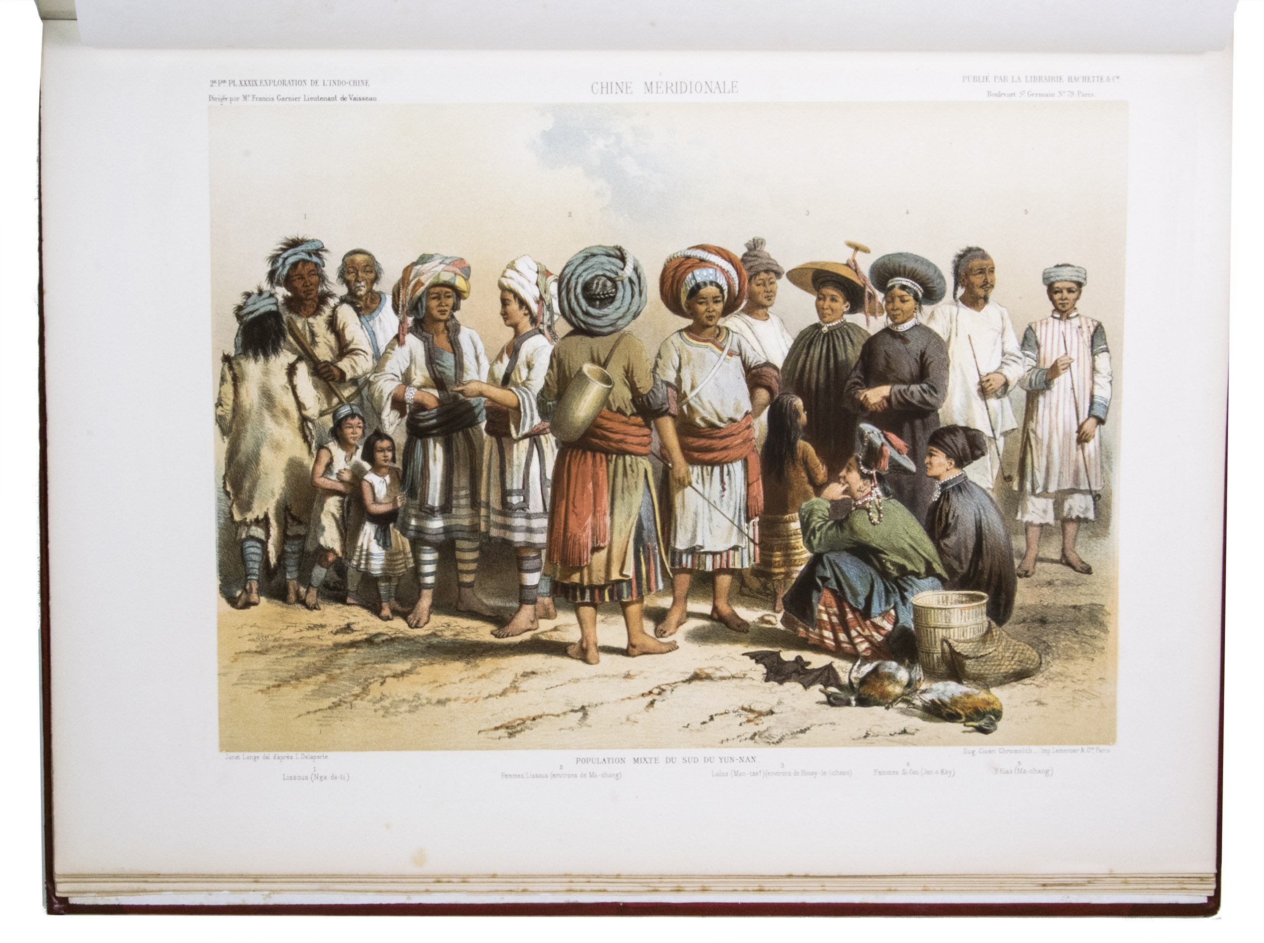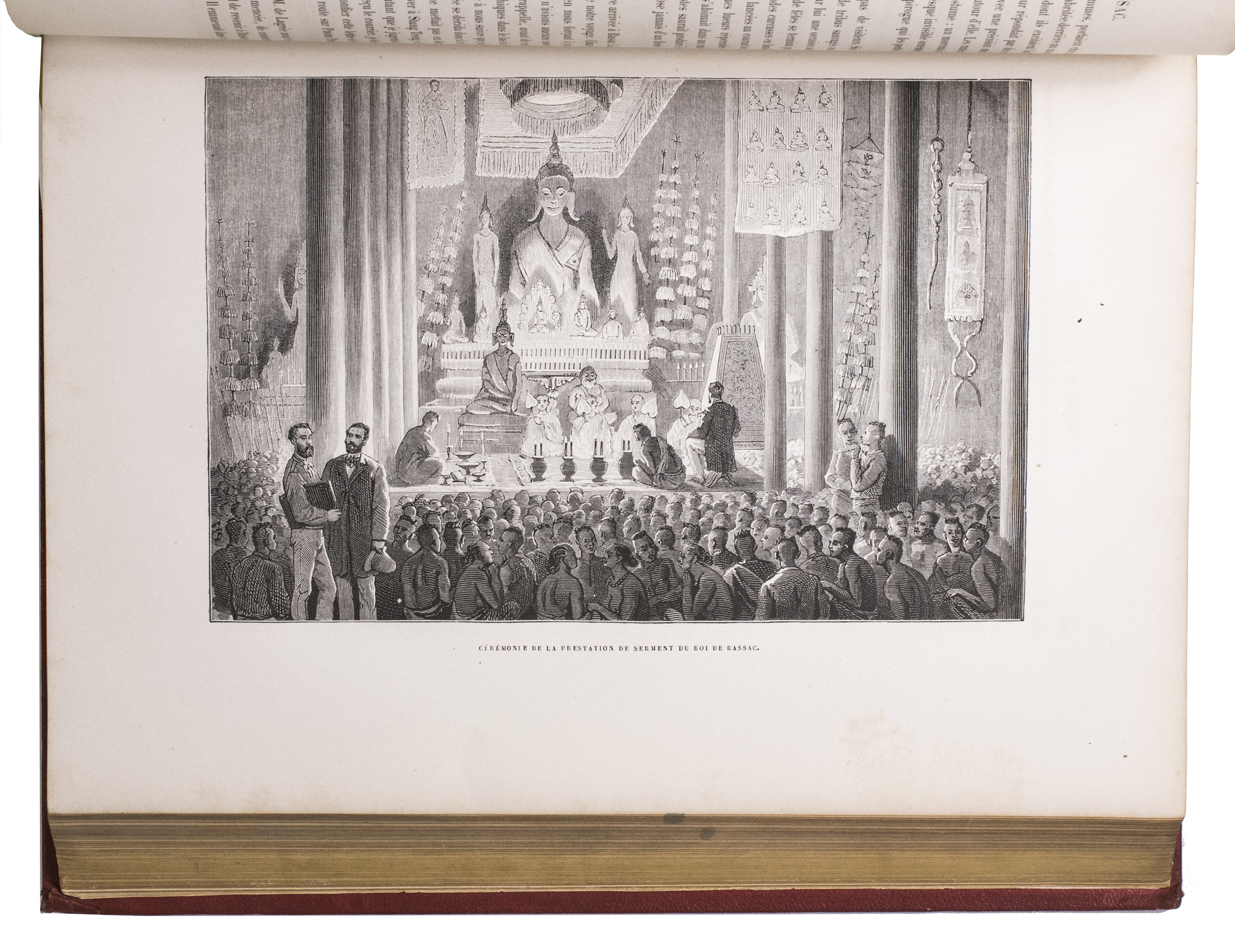 The present work, published posthumously, was limited to just 300 copies. The first volume, written by Garnier, is a travelogue of the harrowing journey. The hundreds of woodcuts, after drawings made by Louis Delaporte, illustrate the monuments, landscapes, and people of Indochina. A second volume presents the scientific findings of the expedition and contains contributions on topics such as meteorology, geology, mineralogy, anthropology, and botany. The large-scale atlas volume contains numerous maps, and lithographs of the most spectacular of Delaportes drawings, including some in colour. These views, in conjunction with the fine illustrations in the text volumes, form a valuable and remarkably wide-ranging visual record of Indochina as a whole, with the depictions of the ancient capital of Laos at Viet Chan and Angkor Wat in Cambodia being particularly impressive.
