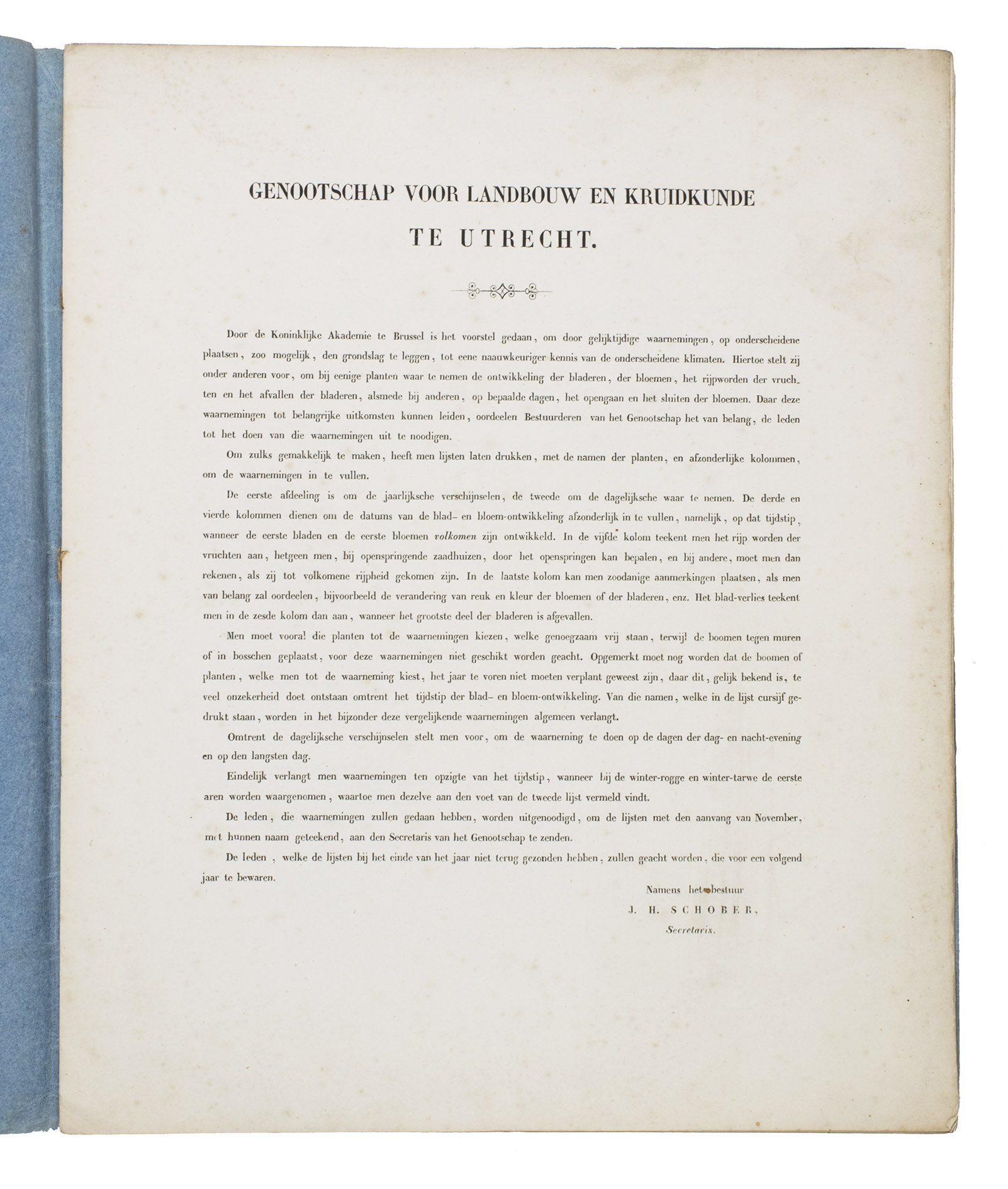 Second copy located of a remarkable example of 19th-century botanical research methods, issued by the Genootschap voor Landbouw en Kruidkunde (Society for Agriculture and Herbology) in Utrecht, the Netherlands. This society was founded in 1841 with the goal of representing the interests of and generally promoting agriculture, animal husbandry, timber cultivation, horticulture, and herbology in the Dutch province of Utrecht. The society was managed by a committee counting 6 members: mr. P.J.J. Ram, F.H.J. van der Hoop, H. van Lunteren, jhr. G.J. Beeldsnijder van Voshol, dr. J.J. Burgerhoudt, and F.W. Selle. They subsequently invited J.H. Schober to take up the position of secretary. It is Schober's name appearing at the bottom of the general introduction in the present publication, asking members of the society to participate in the observation of certain plants in order to gain knowledge regarding the influence of slight differences in climate on the development these plants.