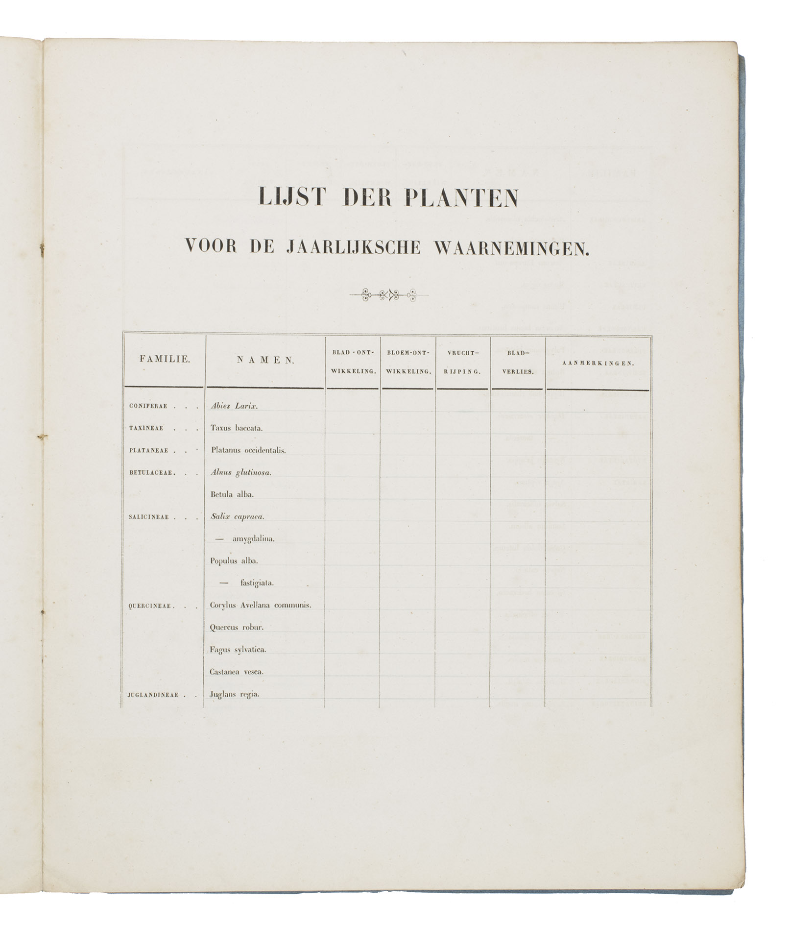 The present list was printed and distributed to help with the observation of certain changes in the listed plants, such as the growth of leaves and flowers, the ripening of fruits, and the falling of leaves. Members of the Utrecht Agricultural Society were invited to fill out the provided list with their detailed observations and send the completed list back to the society in November of a certain year. While the present list does not mention a year of publication, it will have been printed and published after 1841 - the year the society was founded - and before 1900, as the final page asks the observer to fill in the place they carried out their observations, their name, and the year with "18.." pre-printed.