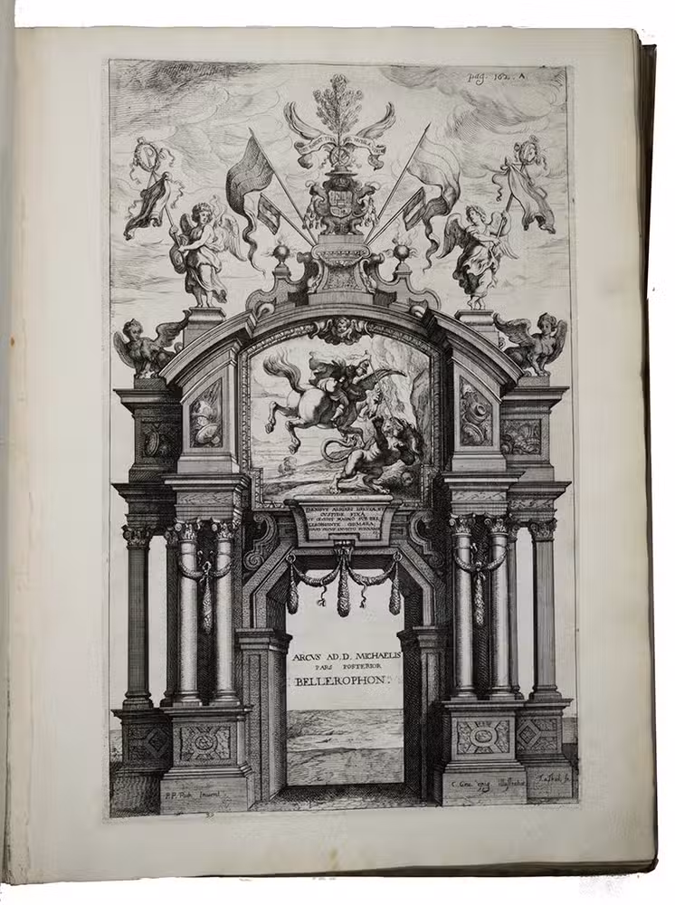 Its large size and numerous copperplate illustrations made it one of the most expensive books produced in the 17th century, but the large plates also allowed Van Thulden to enhance the quality of the illustrations, depicting the arches and stages designed by Rubens for the Baroque festivities in great detail.