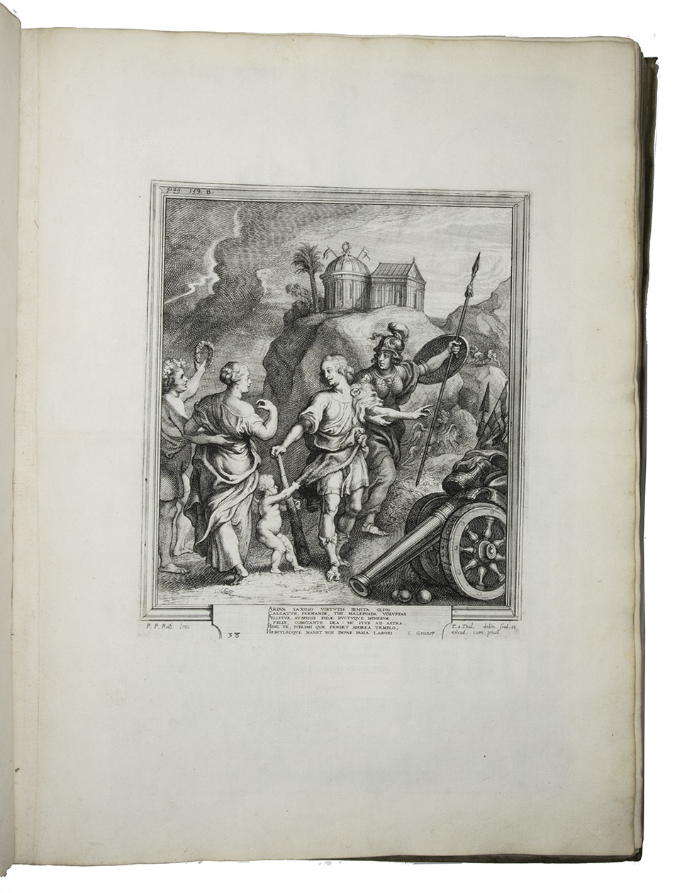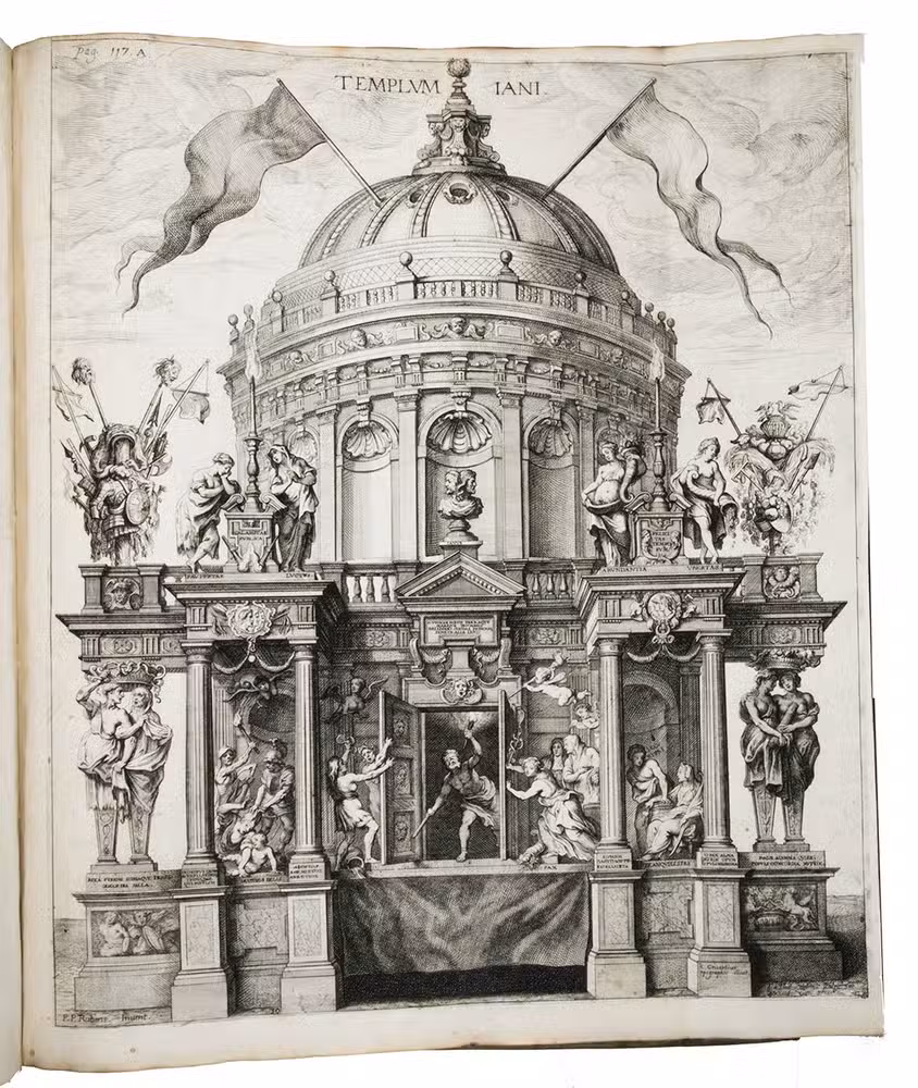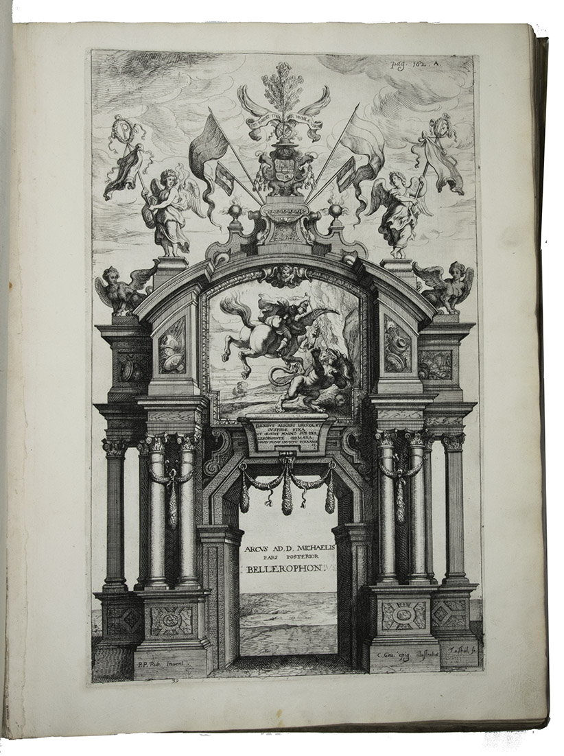 Antwerp, Theodoor van Tulden (colophon: printed by Jan van Meurs, 1641), [published January 1643]. Royal 1mo (full-sheet leaves) (57 x 42 cm). With a letterpress half-title and XXXIX single-page, double-page and larger folding plates (numbered I-XXXIX in the table of plates, printed and assembled from 43 copper plates numbered [1]-[2], 3-43) depicting the rich allegorical and ornamental triumphal arches and festive decorations, paintings, statues, etc., all designed by Pieter Paul Rubens, all but one for the triumphal entry of the Spanish cardinal-infante Ferdinand into Antwerp in 1635. Further with 46 smaller engravings in the text, depicting coins and medals, and numerous woodcut decorated initials (4 series). Contemporary overlapping vellum, manuscript title on spine. [10], 189, [13] pp. plus 38 plates.