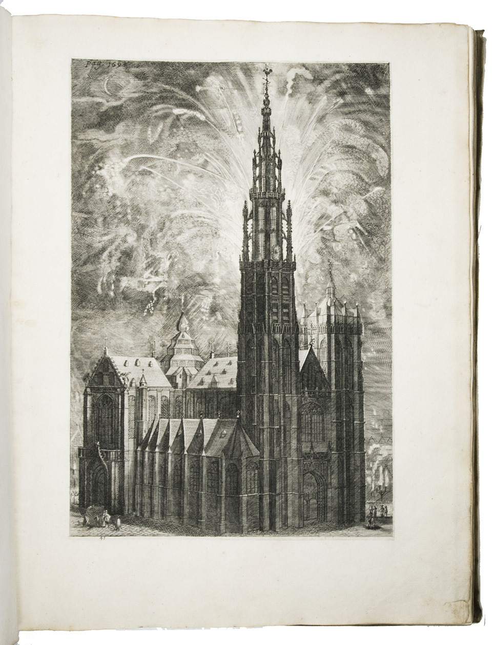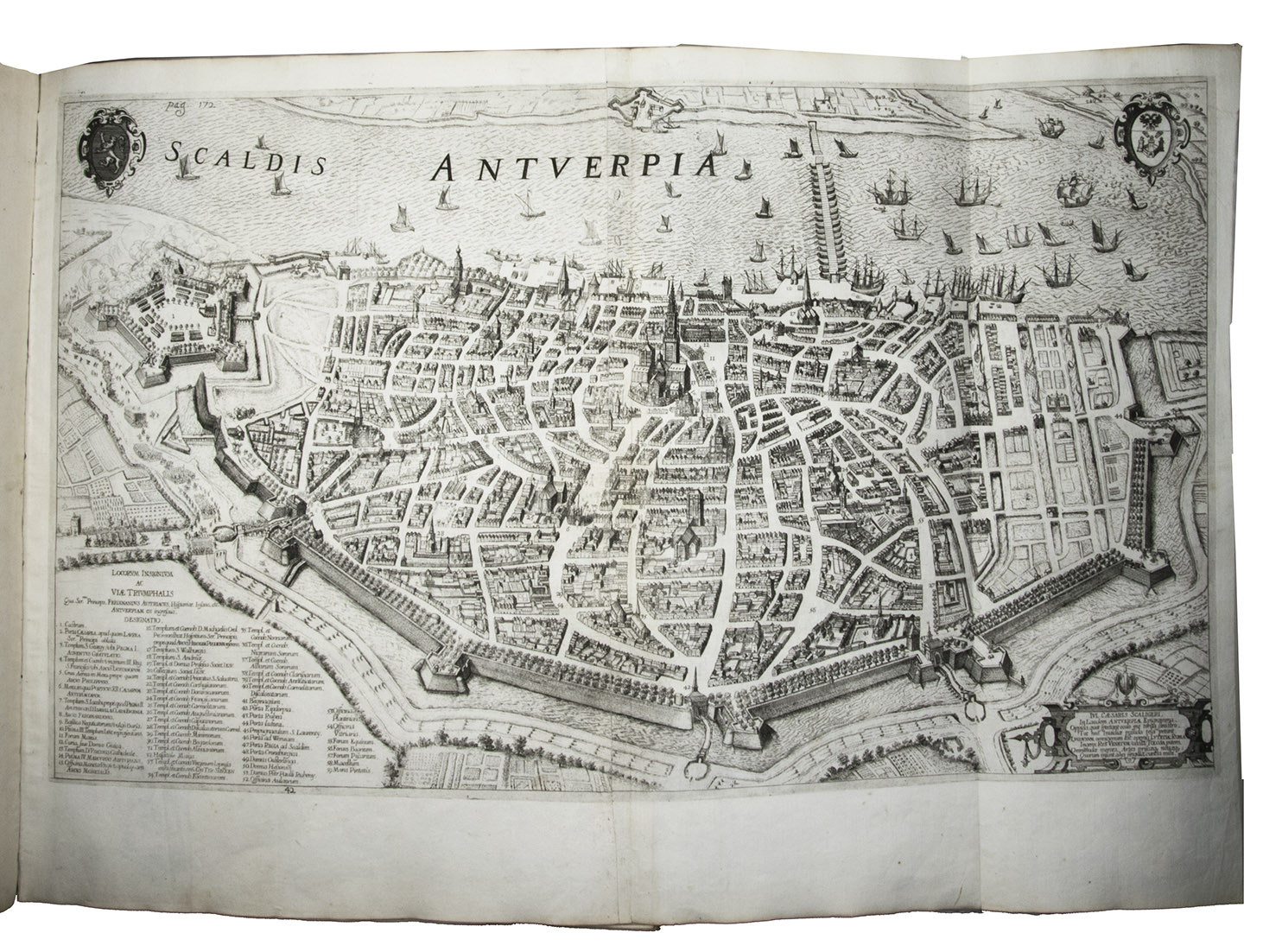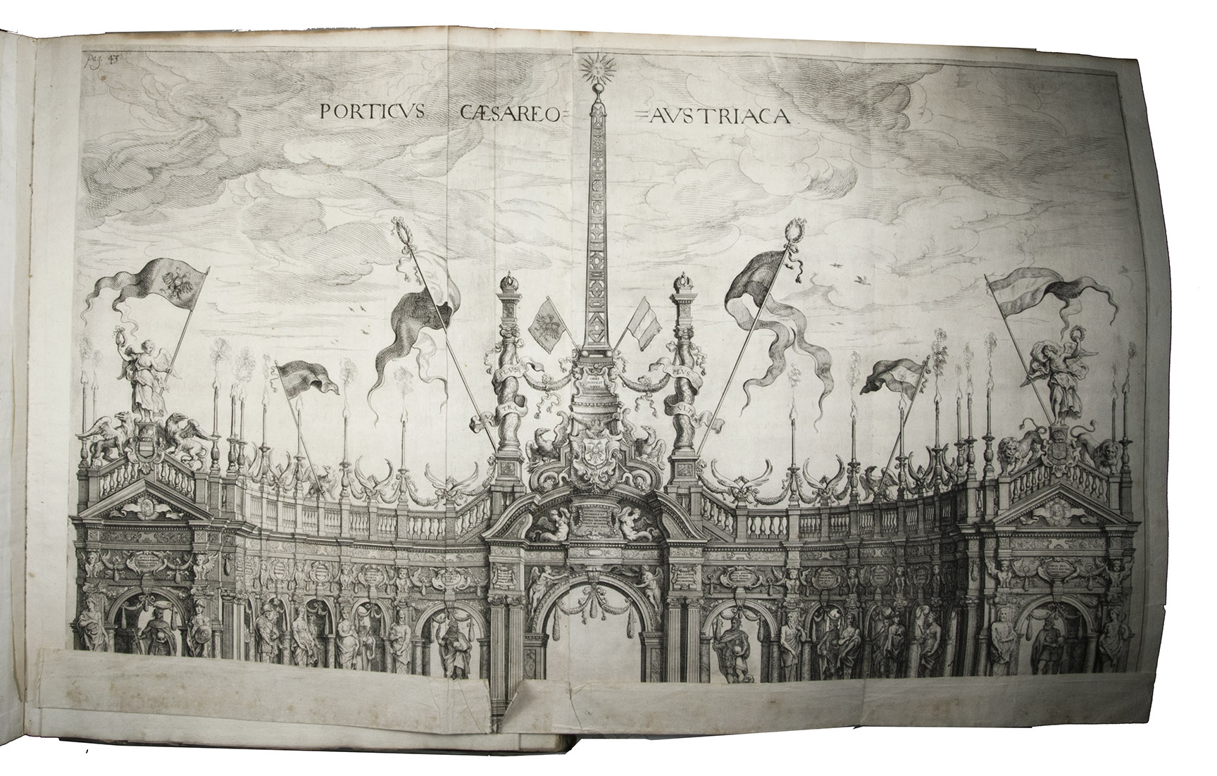 Antwerp, Theodoor van Tulden (colophon: printed by Jan van Meurs, 1641), [published January 1643]. Royal 1mo (full-sheet leaves) (57 x 42 cm). With a letterpress half-title and XXXIX single-page, double-page and larger folding plates (numbered I-XXXIX in the table of plates, printed and assembled from 43 copper plates numbered [1]-[2], 3-43) depicting the rich allegorical and ornamental triumphal arches and festive decorations, paintings, statues, etc., all designed by Pieter Paul Rubens, all but one for the triumphal entry of the Spanish cardinal-infante Ferdinand into Antwerp in 1635. Further with 46 smaller engravings in the text, depicting coins and medals, and numerous woodcut decorated initials (4 series). Contemporary overlapping vellum, manuscript title on spine. [10], 189, [13] pp. plus 38 plates.