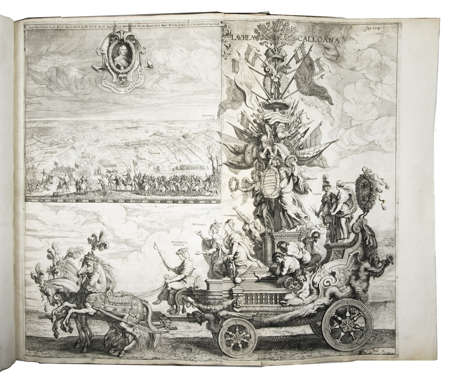 The book, one of the most monumental publications of the 17th century, has a complicated publishing history occupying more than seven years, with publication delayed by the deaths of Rubens in 1640 and Ferdinand in 1641. The colophon of the present copy is dated 1641, but it includes plate 43, which the Antwerp magistrates commissioned from Van Thulden on 9 December 1641, so that it was certainly printed in 1642: Ferdinands magnificent triumphal chariot with numerous allegorical figures and an inset view of his victory at the Battle of Kallo (20 June 1638) after a design by Rubens.