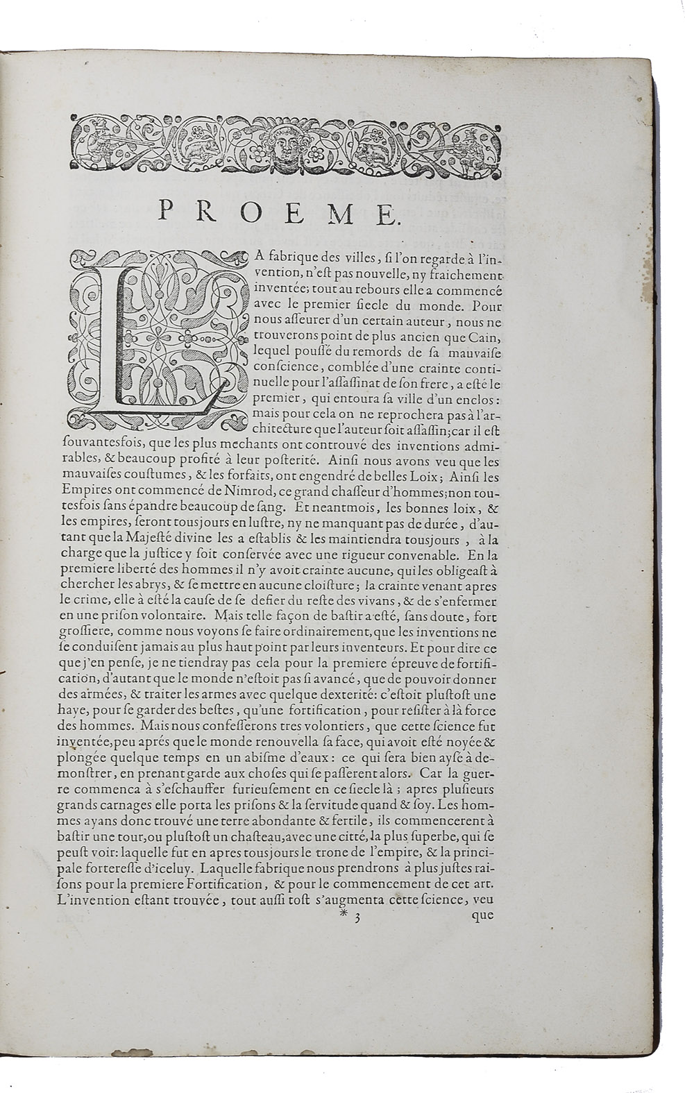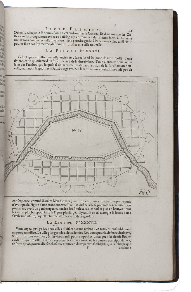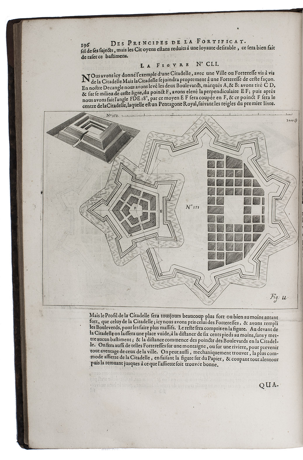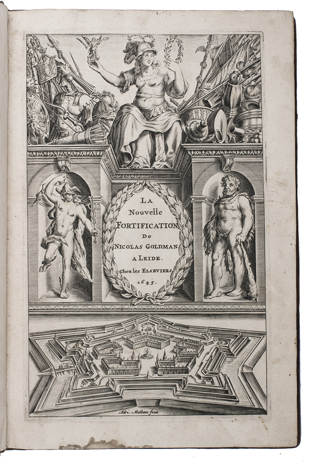 First French edition (with the engraved title-page new for this edition) of an instruction manual for designing fortifications, with an emphasis on drawing their plans, profiles, perspective views, etc., first published in Latin (also by the Elzeviers) in 1643 using the same illustration plates. Most of the illustrations show fortification plans, profiles, elevations, etc., including many details, but they also include plain and solid geometrical diagrams, drafting instruments, bridges and military buildings. Many of the plans include a scale. The book, dedicated to the Dutch Stadtholder and Prince of Orange Frederick Hendrick, shows the Leiden Elzeviers at their high point, with stunning woodcut decorations and initials, and good presswork. Nicolaus Goldman (1611-1665) was born in Breslau but studied in Leiden and settled there permanently, teaching military engineering.