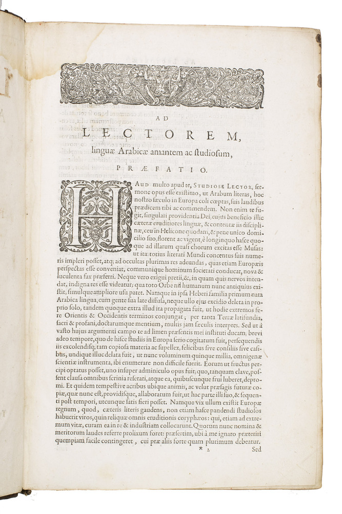 First edition - the Elzevier and Janssonius issue - of Golius's ground-breaking Arabic lexicon, which remained the most important dictionary in European Arabic studies until Freytag's dictionary appeared in the 1830s. Golius based his dictionary on a variety of Arabic lexicographical texts, the most important being al-Jawhari's Sahah and Firuzabadi's Qamus, but he also used geographical and zoological sources such as al-Damiri's book on animals. His dictionary included, moreover, Arabic words derived from other languages, most notably Turkish and Persian, which he translated directly from the source language, using Turkish and Persian glossaries. The work concludes with an extensive index, containing some 10,000 entries. "The manner in which Golius arranged his dictionary, according to the Arabic root letter and the verbal and substantival forms with all their derivates, is still the fundamental criterion of Arabic dictionaries in European languages" (Vrolijk & Van Leeuwen). The book was produced in four simultaneous issues, differing only in the imprint, all noting Bonaventura and Abraham Elzevier as printers (the colophon also noting the Elzeviers as printers), one apparently for their own distribution and others noting the book's sale by Johannes van Ravesteyn in Amsterdam or Arnout Leers in Rotterdam rather than the present Johannes Janssonius. It was for a long time the best resource we had on the Arabic language (Willems 723).
