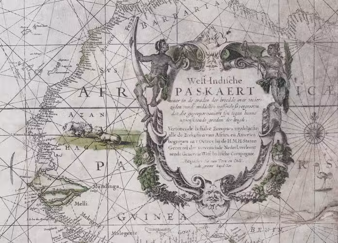 The West-Indische Paskaert engraved by Pieter Goos, in its rare first state, a nautical chart prepared for the Dutch West India Company (WIC) as an aid to crossing the Atlantic Ocean to the trading regions of the Americas and visiting trading posts in Africa. It shows parts of the east coast of North America, both coasts of South America, Mediterranean Europe and the west coast of Africa. Many West-Indische Paskaerten, as these navigational charts were called, were reprinted over and over from new states of the copperplates. For more than a century Dutch and foreign sea farers profited from their use on transatlantic journeys. The great cartographer Willem Jansz. Blaeu (1571-1638) published the first West-Indische Paskaert around 1630 using manuscript charts and other documents of the Atlantic and its coasts, including information provided by the Dutch WIC navigators who sailed these routes. Being one of the first practical uses of the Mercator projection, Blaeu's small-scale nautical chart was the first useful chart for crossing the Atlantic Ocean, making it easier to plot a straight line course for long distances on one map. Around 1660 Pieter Goos engraved four large navigation charts on new copperplates, including the plate for his present West-Indische Paskaert. The present copy shows the plate in its first state, the only copperplate that Goos actually engraved himself.