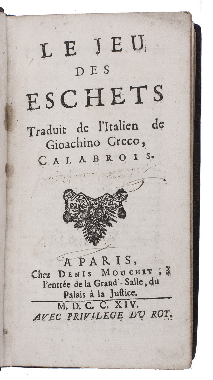 Late edition of the French translation of one of the most famous early chess books, originally written in Italian and first presented in manuscript by the author, the famous Calabrian chess player Giocchino Greco (ca. 1600-1635) to the King of Naples in 1619. At first only manuscript transcriptions were made. The first French edition appeared in 1669, after the first English edition of 1656. After a short explanation of the general principles of the game of chess, it teaches chess players by presenting chess games and problems only, often with a possible defense added as well. The book is divided into two parts, the first with 39 games, extensively recorded, and the second part with 55 more advanced chess problems.