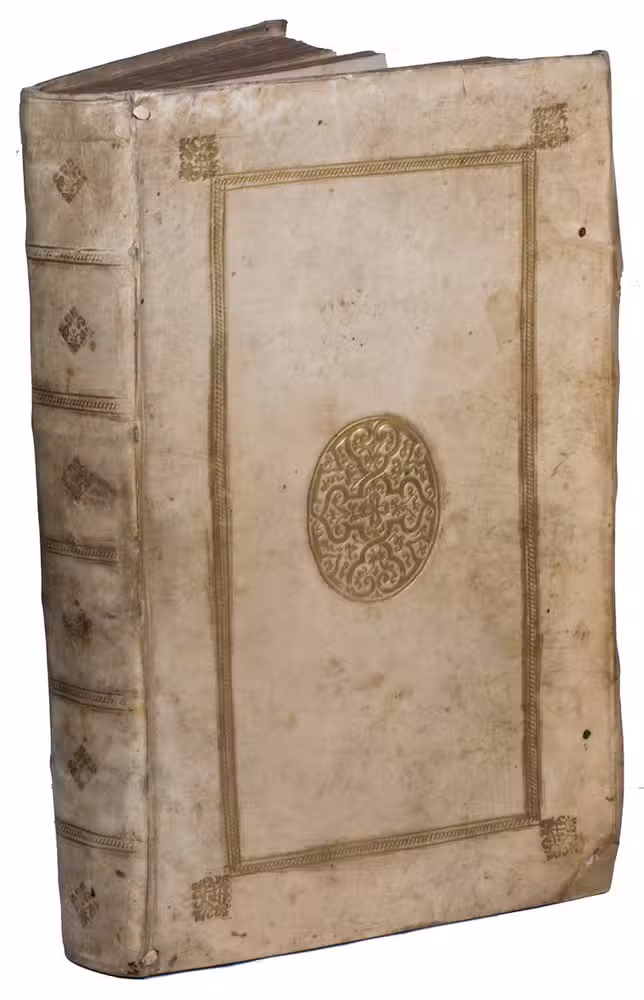 Contemporary gold-tooled vellum, with an oval centrepiece on both boards within a decorative frame, gilt edges, remnants of ties. [24], 432, [18] pp.