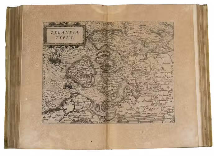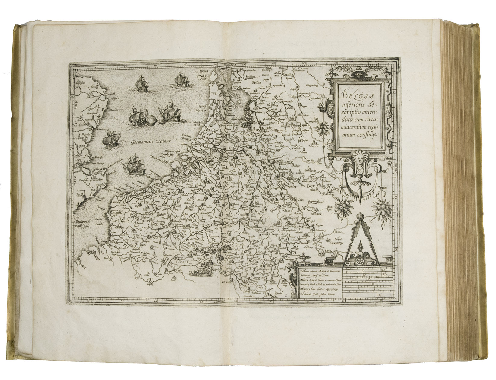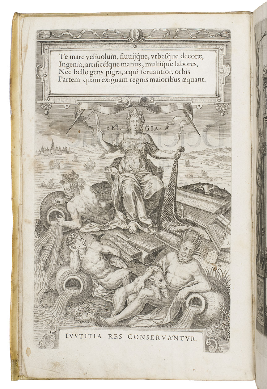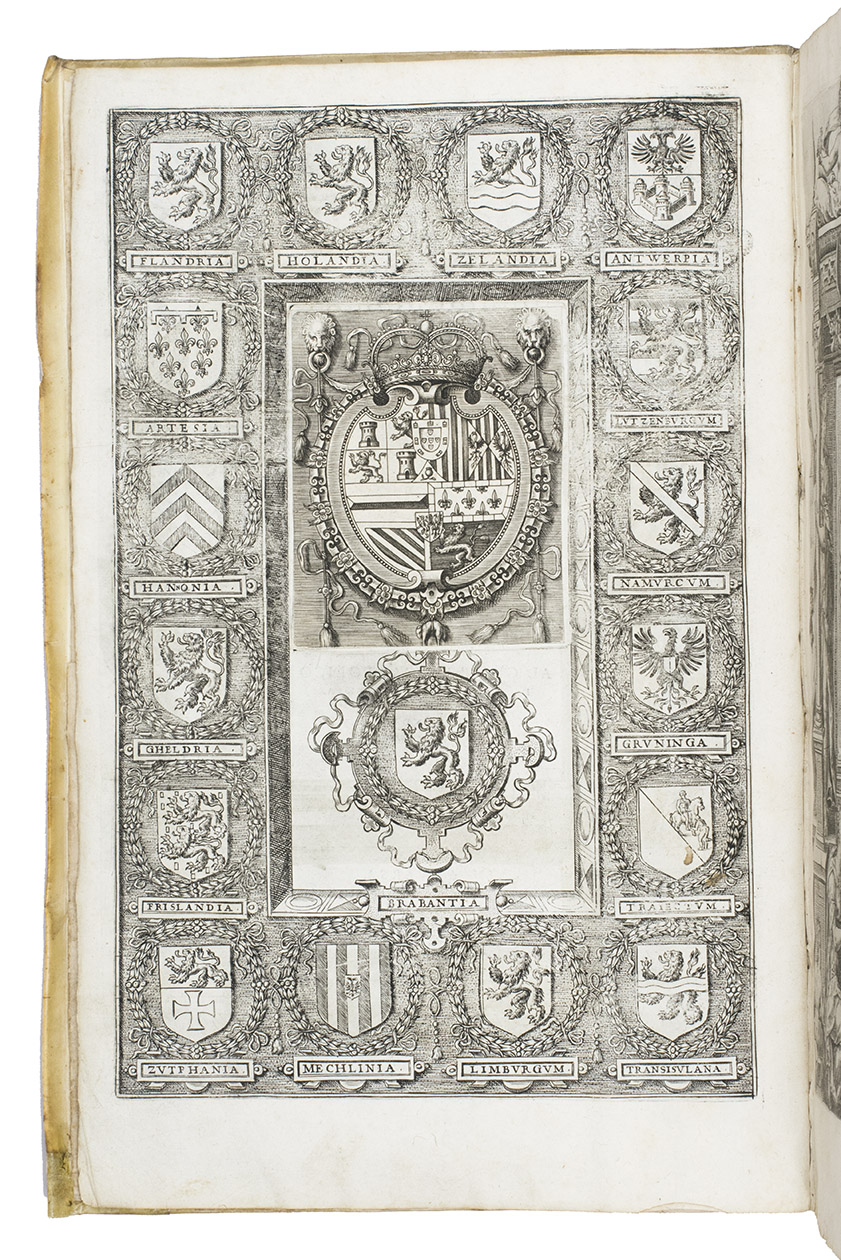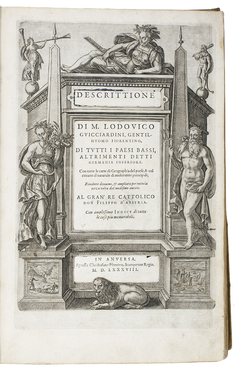 Antwerp, Christopher Plantin, 1588. Folio. With an engraved allegorical frontispiece of the Low Countries (Belgia), an engraved architectural title in its first state with printed text, an engraved plate with a border of the coat of arms of the 16 Provinces and that of Brabant together with the coat of arms of Philip II in the centre pasted in, an engraved plate with an allegorical depiction of the Arts and Sciences and an architectural border with the portrait of Philip II in the centre, a large woodcut coat of arms of Guicciardini, 64 double-page engraved maps and views, 6 full-page engraved maps and views, 4 single pages with on each 2 engraved maps, woodcut headpieces and initials.