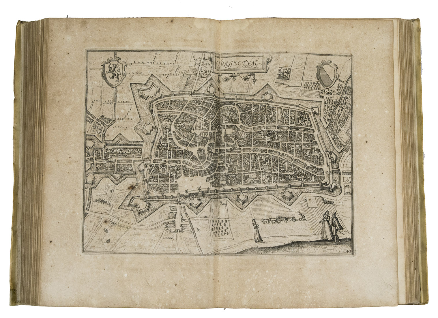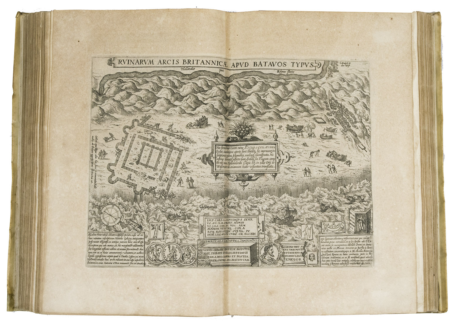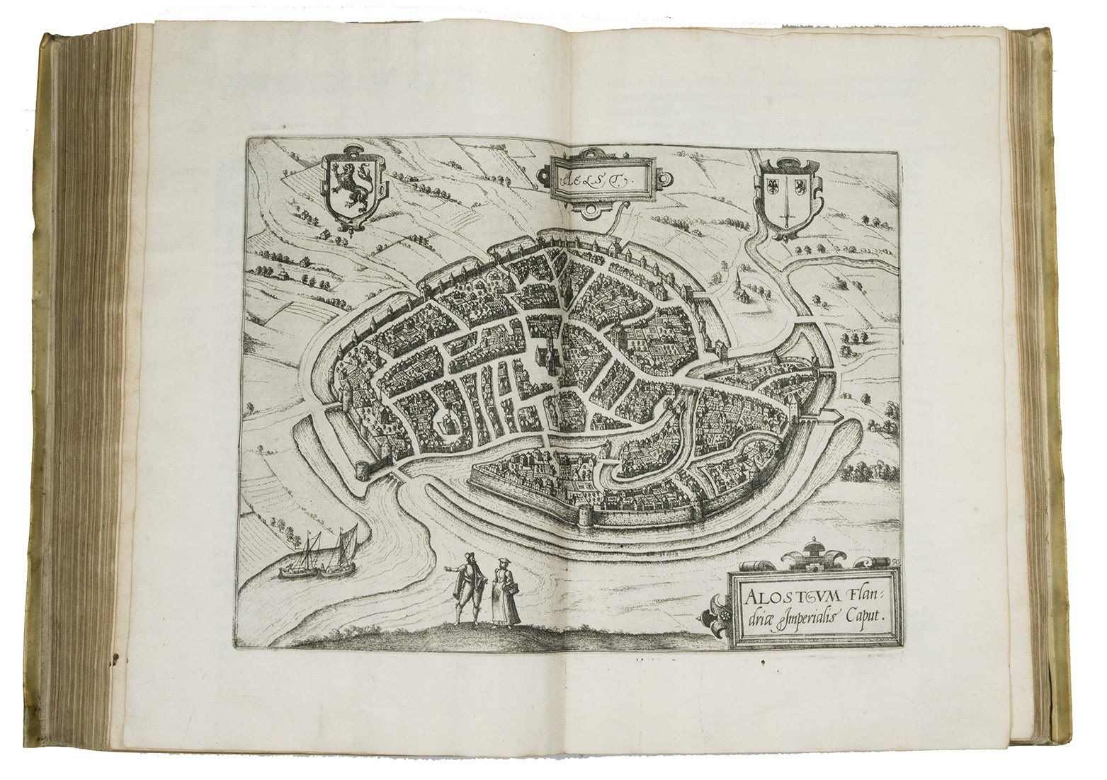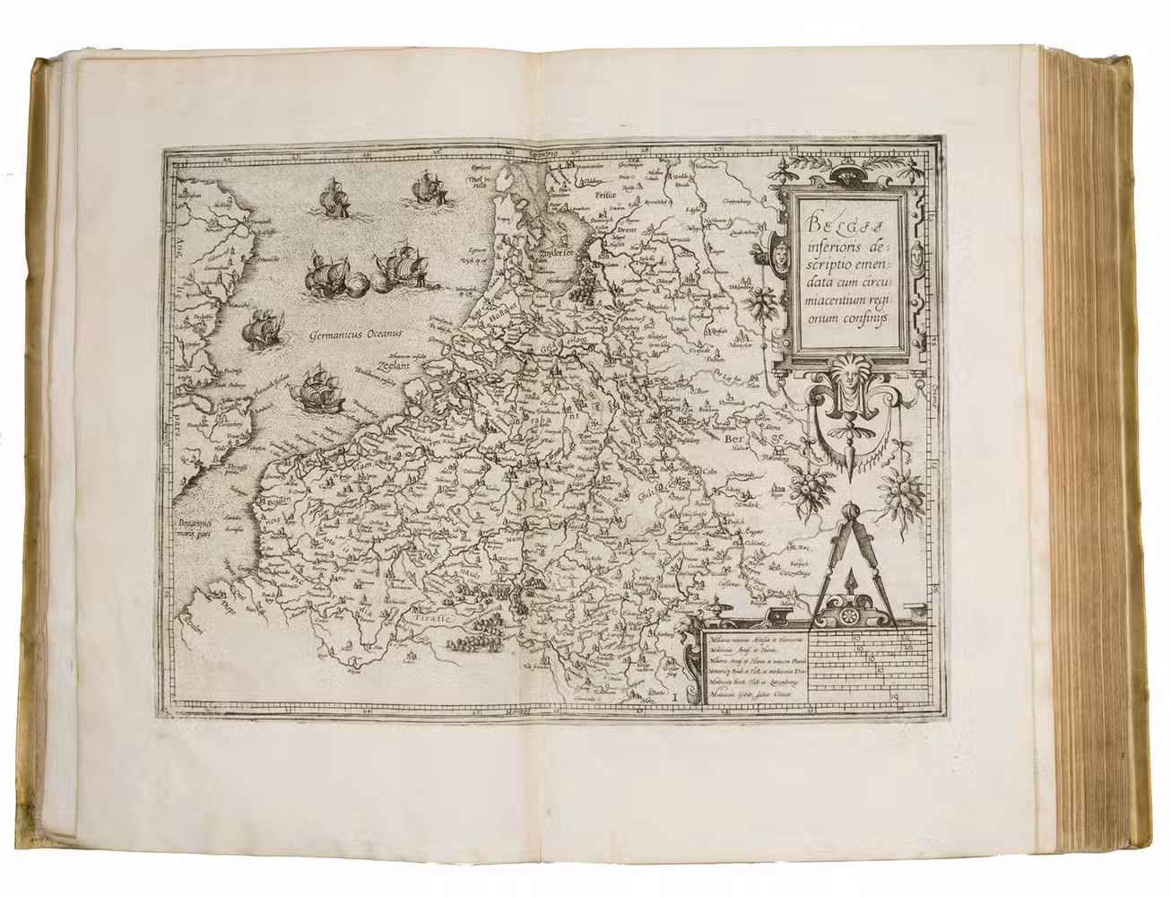 Antwerp, Christopher Plantin, 1588. Folio. With an engraved allegorical frontispiece of the Low Countries (Belgia), an engraved architectural title in its first state with printed text, an engraved plate with a border of the coat of arms of the 16 Provinces and that of Brabant together with the coat of arms of Philip II in the centre pasted in, an engraved plate with an allegorical depiction of the Arts and Sciences and an architectural border with the portrait of Philip II in the centre, a large woodcut coat of arms of Guicciardini, 64 double-page engraved maps and views, 6 full-page engraved maps and views, 4 single pages with on each 2 engraved maps, woodcut headpieces and initials.