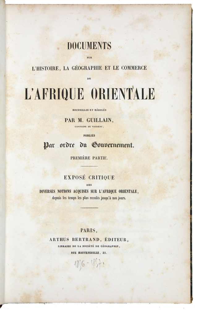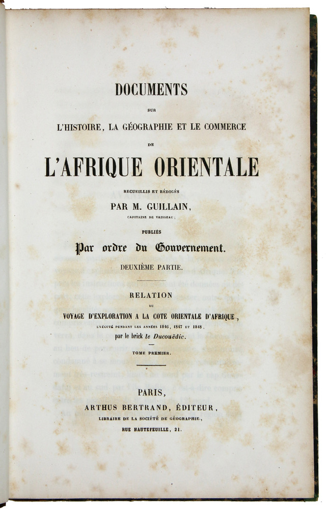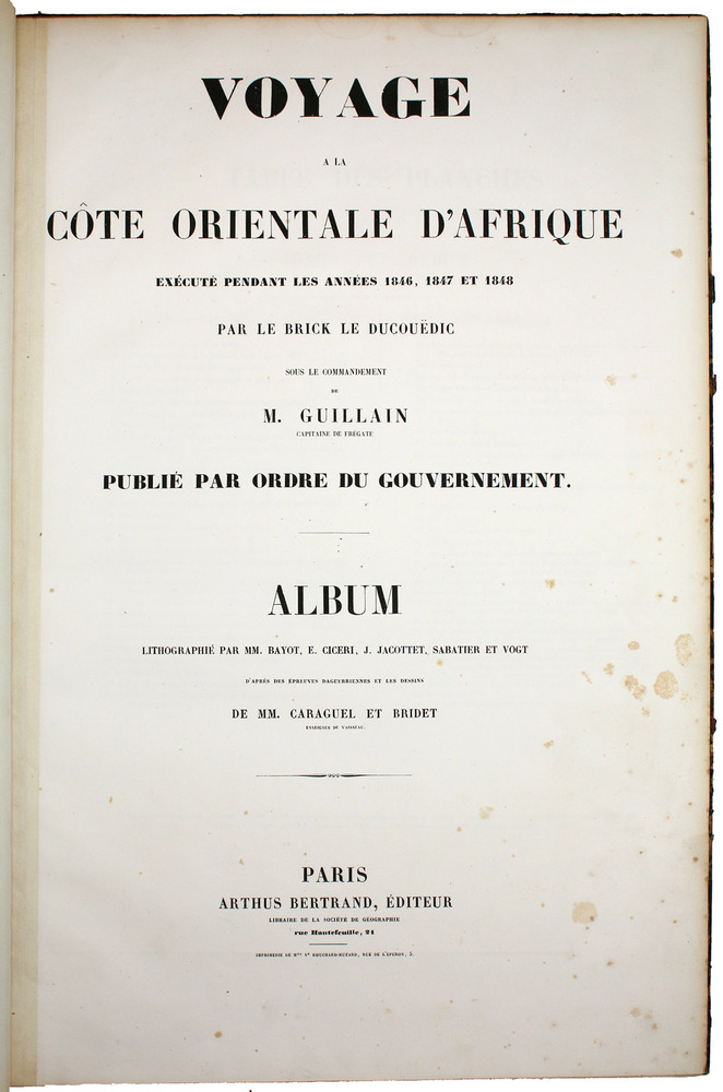Complete in three volumes and a folio atlas, this work traces the expedition of Charles Gullain (1808-75) along the eastern coast of Arabia and Africa, from Oman to Madagascar, and features several innovations in its maps and plates, including lithographed portraits based on daguerreotypes.