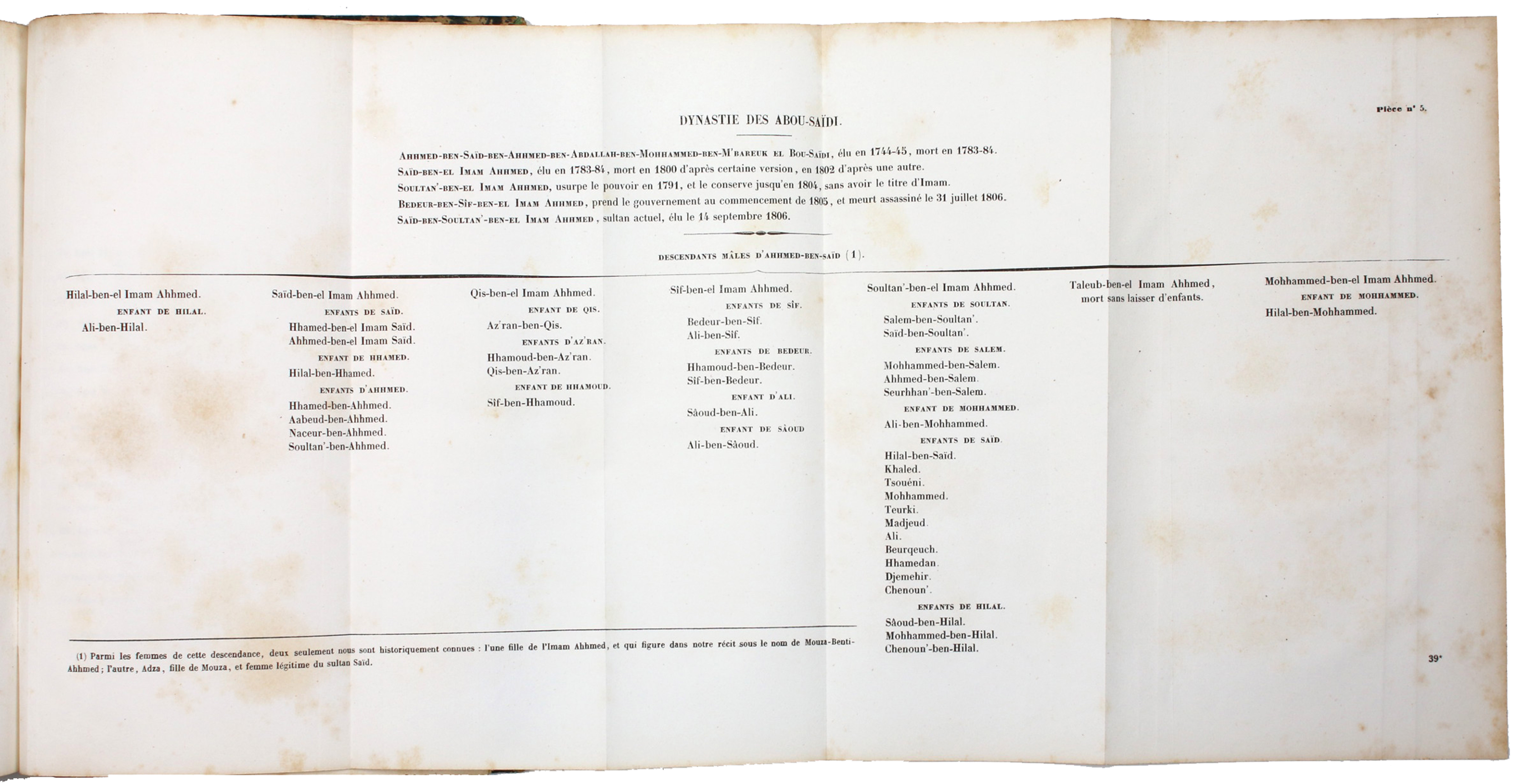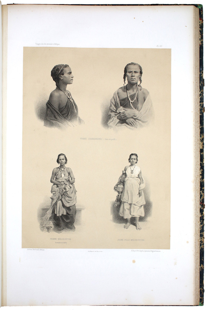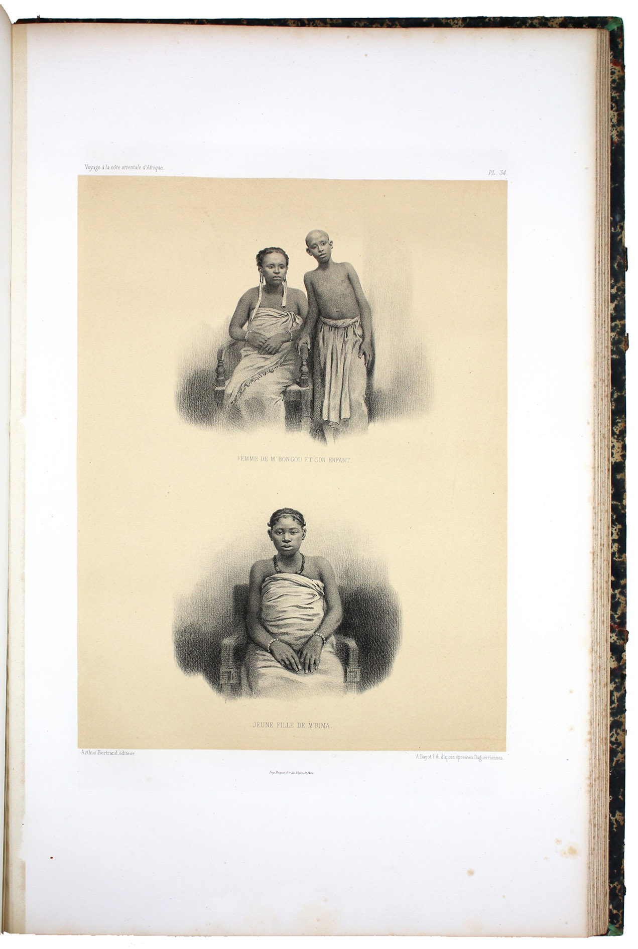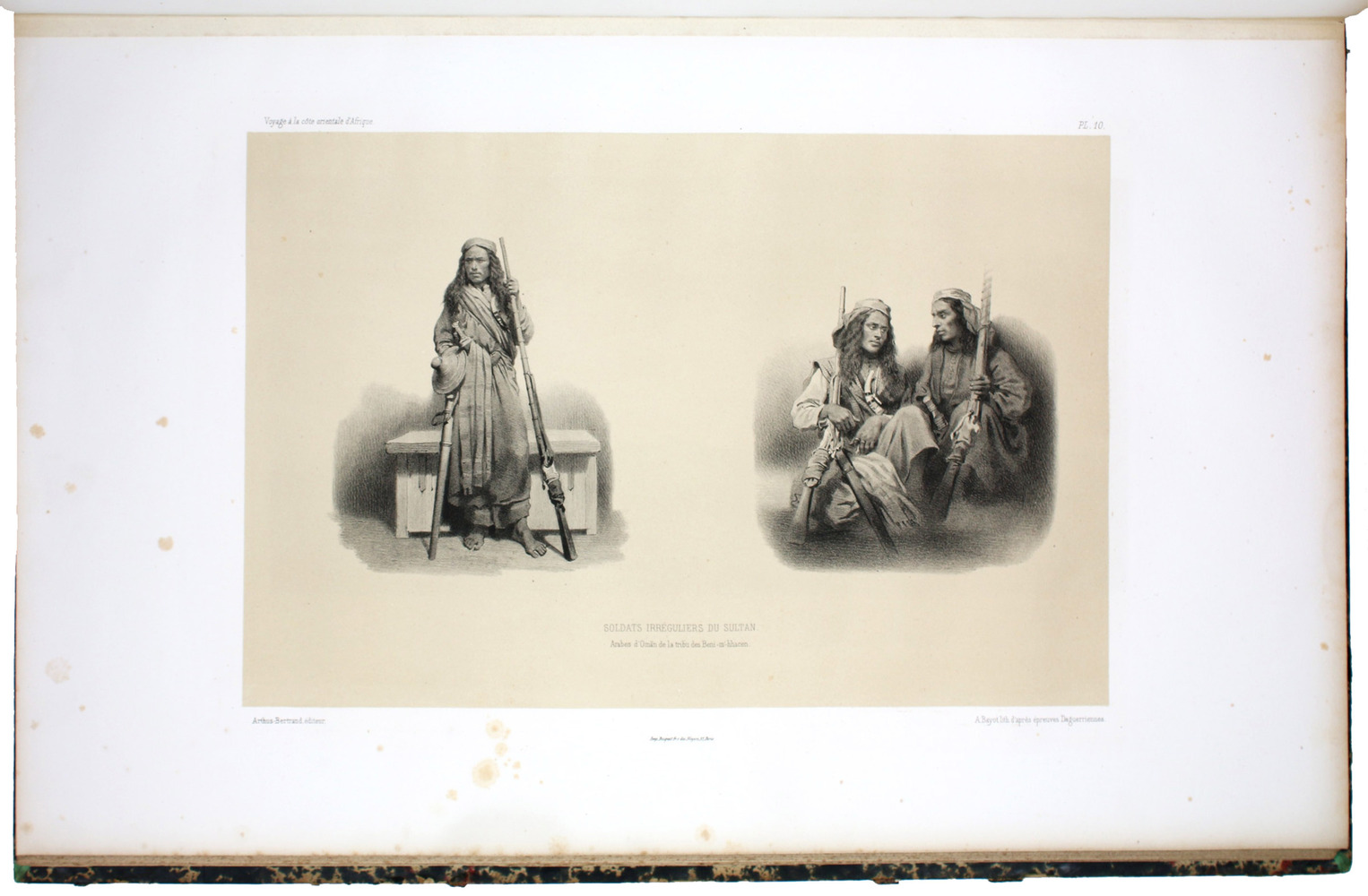 In the 1850s, the French Ministère de la Marine was anxious to publicize their outstanding advances in the field of coastal mapping, especially as France appeared to be losing ground in the colonial scramble for overseas conquests. Gullains expedition was a perfect combination of cartography and ethnology with which to do just that, and no expense was spared in publishing the attractive atlas volume, containing extensive maps and quite beautiful plates. The portraits of Arabs and Africans are drawn from early photographs, including a portrait-sitting which took place in the courtyard of the governors mansion in Zanzibar, where Gullain was often hosted on his travels. The first to sit was the governors great-niece, an eight-year-old named Aziza dressed in her finest clothes. This persuaded the governor himself, Syed Seliman Ben Ahmed, to have his own portrait taken; subsequent daguerreotype sessions were made in the houses of Khamis Ben Osman, a prominent Zanzibar citizen, and Abdallah Ben Ali, a trader. Other plates include as "Soldats Irréguliers du Sultan", showing Omani Arab soldiers of the "Beni-m-hhacen" tribe, the sheikh "Abdallah Ben Naceur ben Mohhamed, Membre de la tribu des Mzara" in Mombasa, and "Arabes de Zanzibar".