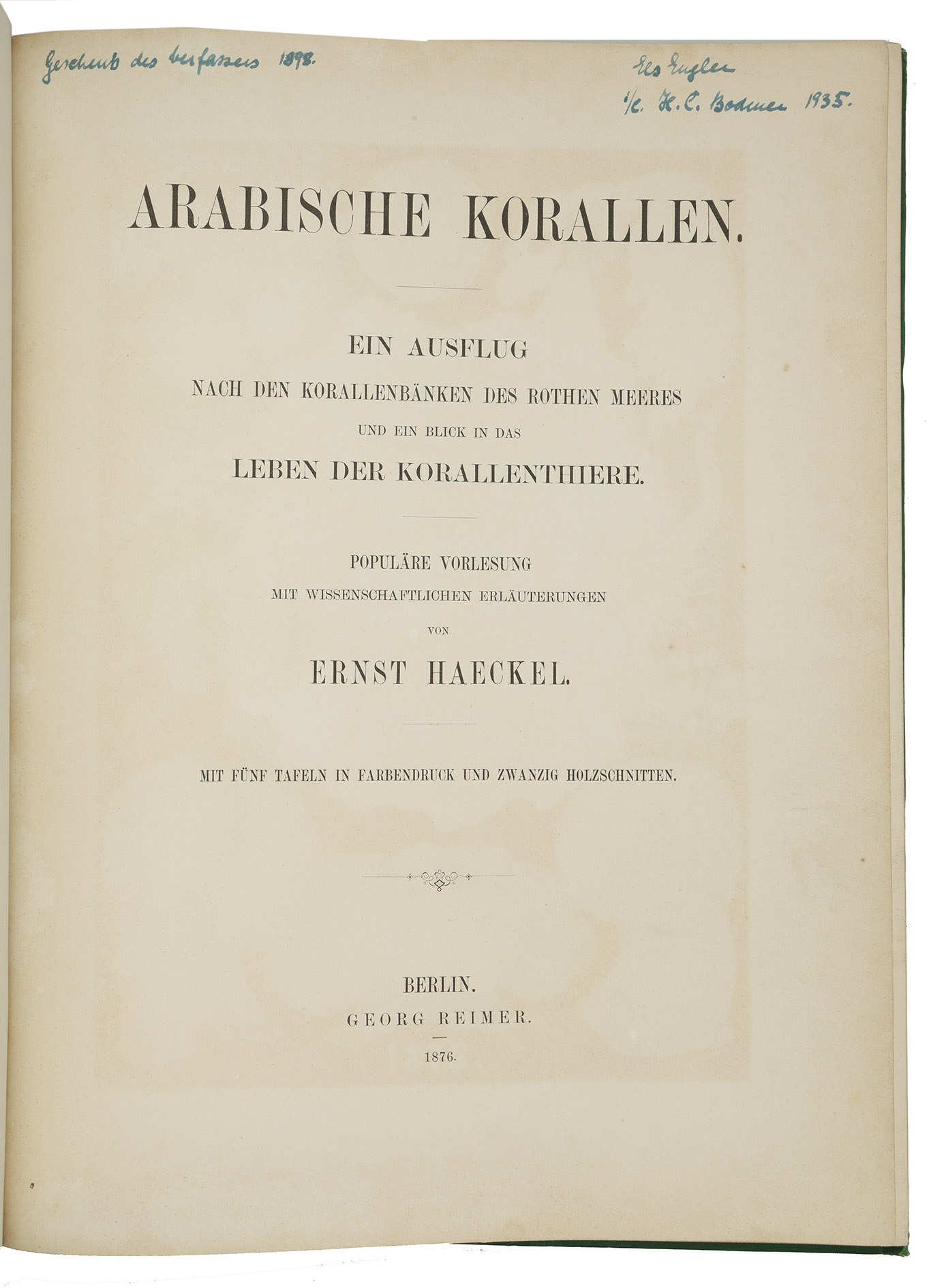 Printed title-page has autograph ink ownership of the German painter Elisabeth Engler (1875-1959), best known for painting Haeckels portrait in 1897, with her note "Geschenk des Verfassers 1898" ("gift of the author 1898") and presentation inscription to the famous collector Hans Conrad Bodmer (1881-1956), dated 1935. Binding insignificantly rubbed; extremeties slighly bumped. Interior a little browned or foxed in places, occasionally more so; plates affected mostly in the blank margins, but lithographed title and one plate affected throughout. Otherwise in good condition. Nissen ZBI 1780.