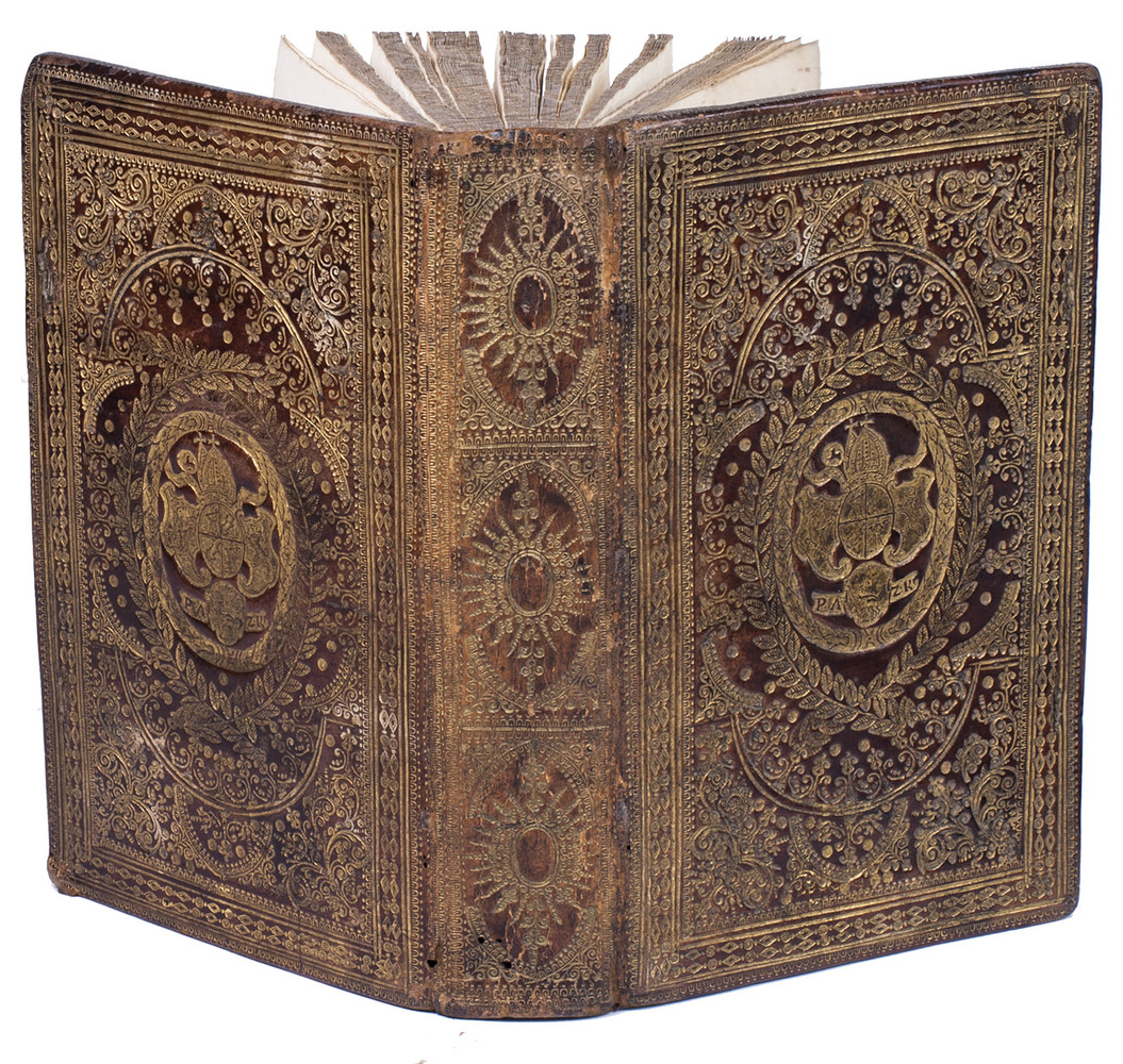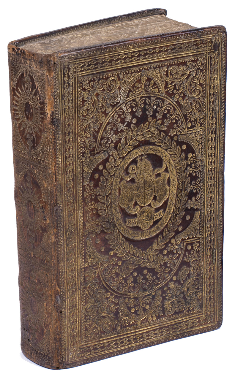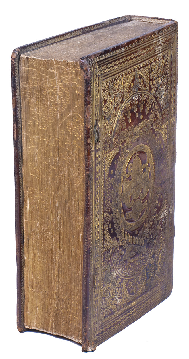 Antwerp, Balthasar Moretus (Officina Plantiniana), 1635. 8vo. With an engraved title page and 38 full-page emblematic engravings. Richly gold-tooled calf (ca. 1665), each board with the arms of (apparently) Abbot Placidus Buechauer (1611-1669) of Kremsmünster, gilt and elaborately gauffered edges. XL, 404, [26], [2 blank] pp.