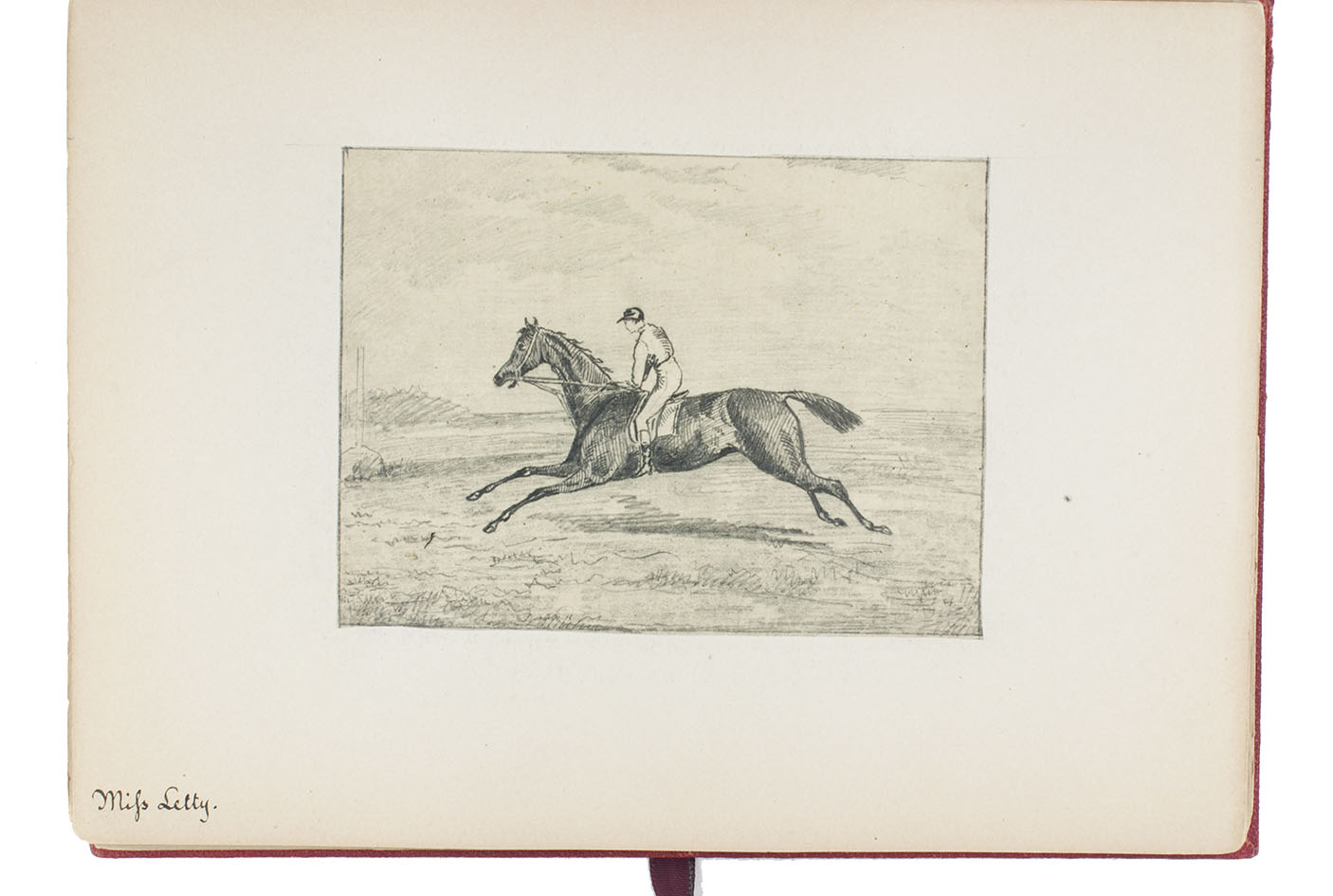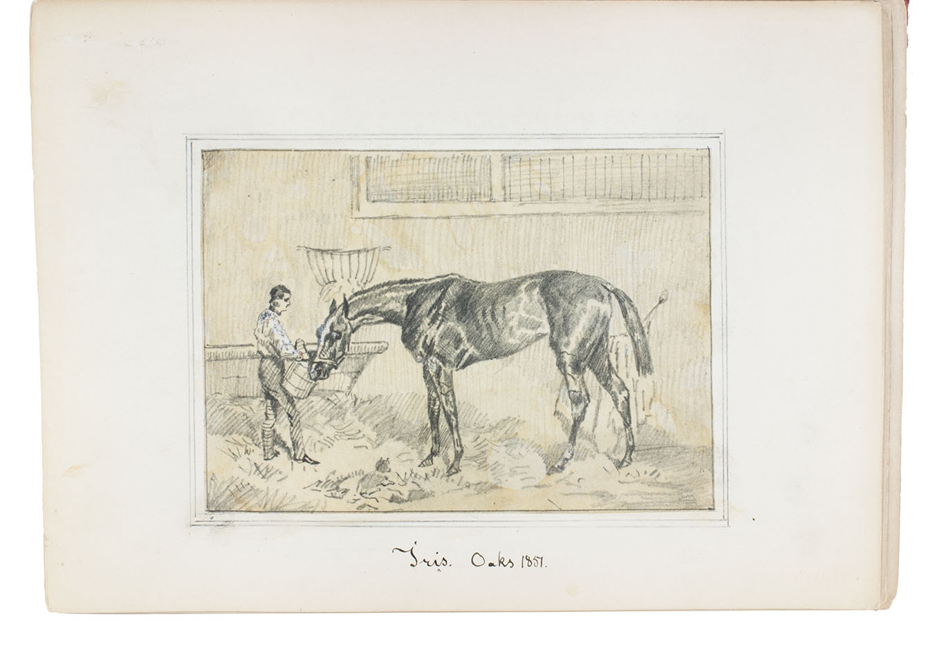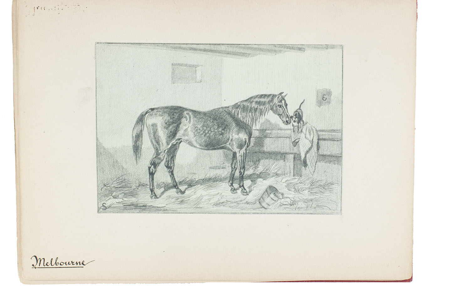 A collection of 36 pencil drawings of famous English thoroughbred race horses by at least three artists, including one signed "Harry Hall" and several others clearly based directly or indirectly on his paintings. Some horses appear in their stables or grounds, sometimes with a stable boy, groom or owner, others are shown carrying a jockey during a race at a track. The earliest horses shown include a beautiful pencil and ink-wash drawing of Camel (1822-1844), who raced from 1825 to 1827 and won the 1826 Port Stakes at Newmarket. He is better known as the sire of Touchstone (1831-1861), also shown, one of the most famous thoroughbreds of all time, who raced from 1833 to 1837.