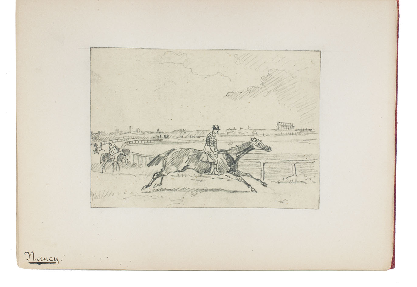 [England and/or Sweden], ca. 1835?-ca. 1855. 4to (24.5 x 18 cm). 36 pencil drawings of English thoroughbred race horses (7.5 x 11.5 to 11 x 16 cm), 1 finished in ink washes and a few touched up with white or light brown. Each drawing mounted on (or occasionally drawn on) a card, loose in a Swedish blind-blocked, textured red cloth portfolio (ca. 1860?). [36] loose ll.