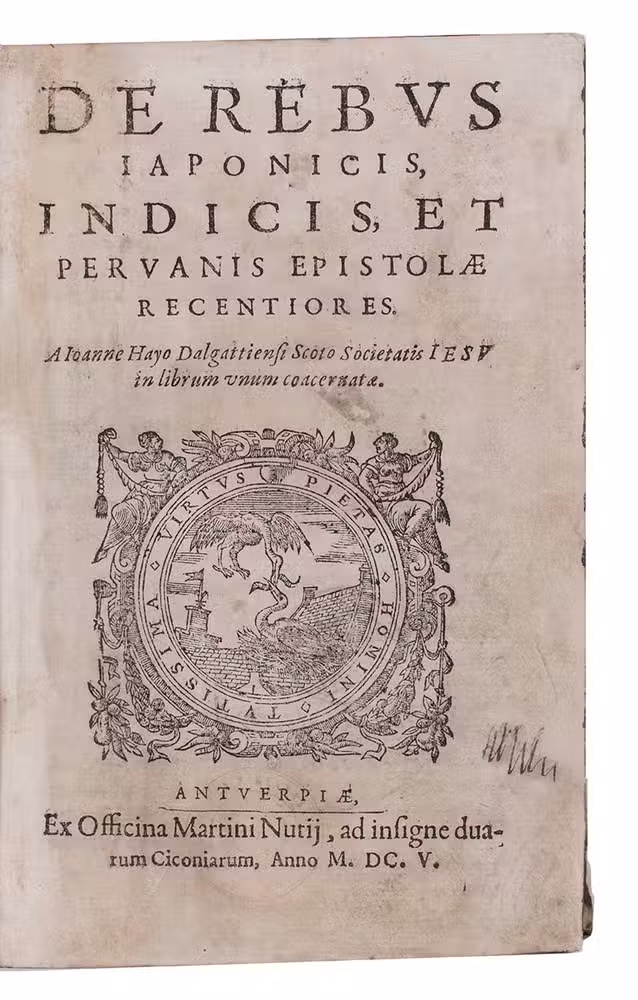 Browned throughout, especially the title page, and somewhat soiled in the margins. Endpapers at the back with a large water stain and some holes. Lacking 3S4 (blank) and 3T1-3T2, the latter two present in facsimile. A fair copy. Alden & Landis 605/57; Alt-Japan Katalog 646; Cordier, Japonica, cols. 246-248; De Backer & Sommervogel IV, p. 165, Hay 12; Laures 271; Medina, Bibl. Hispano-Americana II, 498; Palau 112581; Sabin 31016; Streit V, 58; STCV 6619980; Takahashi 1-71; Ternaux-Compans 931.