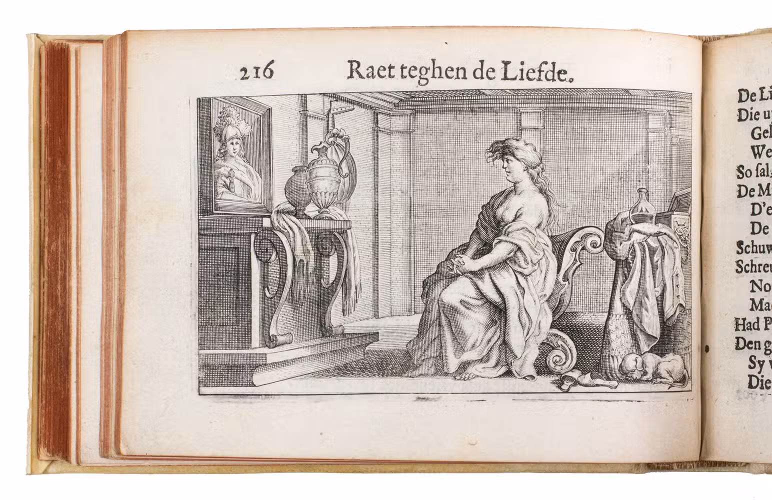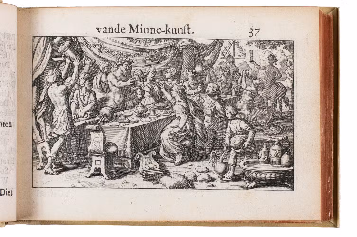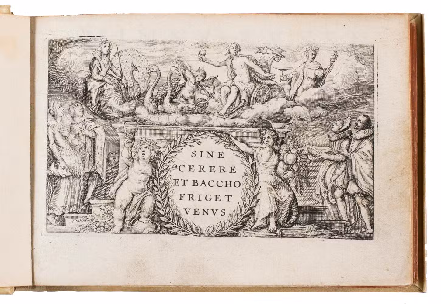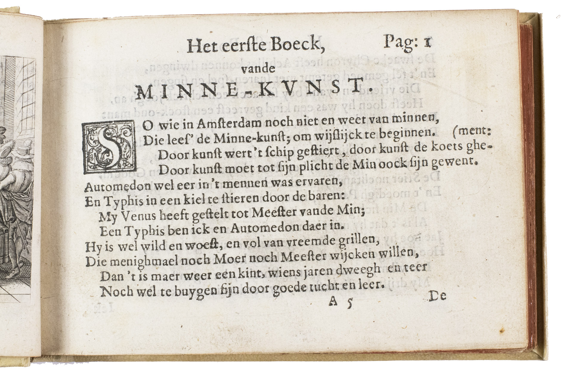 The first contains a poetic adaptation of Ovid's Ars Amatoria, beautifully illustrated with 12 plates, including the frontispiece with the motto "sine Cerere et Baccho friget Venus", by one of the gifted artists of the Golden Age of Dutch book illustration, Pieter Serwouters (1586-1657).