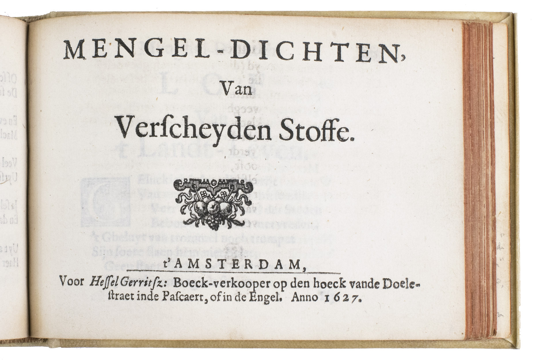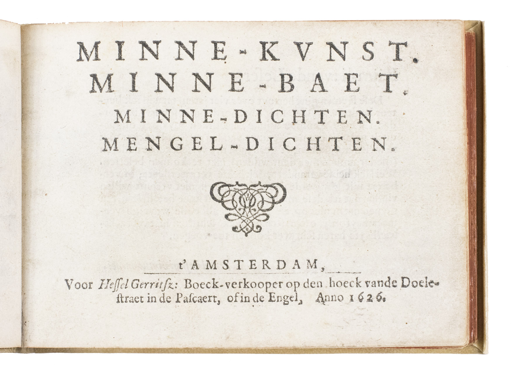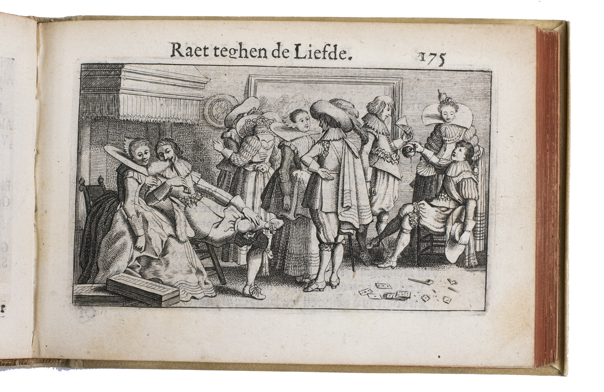 Second edition, enlarged in text and illustrations, of one of the most attractive and rare Dutch songbooks of the early seventeenth century, not only because of the beautiful illustrations, fine printing, and oblong format, but also because of the charm and elegance of its poetry, which consists mainly of erotic love poems. It presents the example par excellence of the fine books intended to instruct and amuse the Dutch "jeunesse dorée". The book, containing the youth-poetry of Johan van Heemskerck (1597-1656), is divided into four parts.